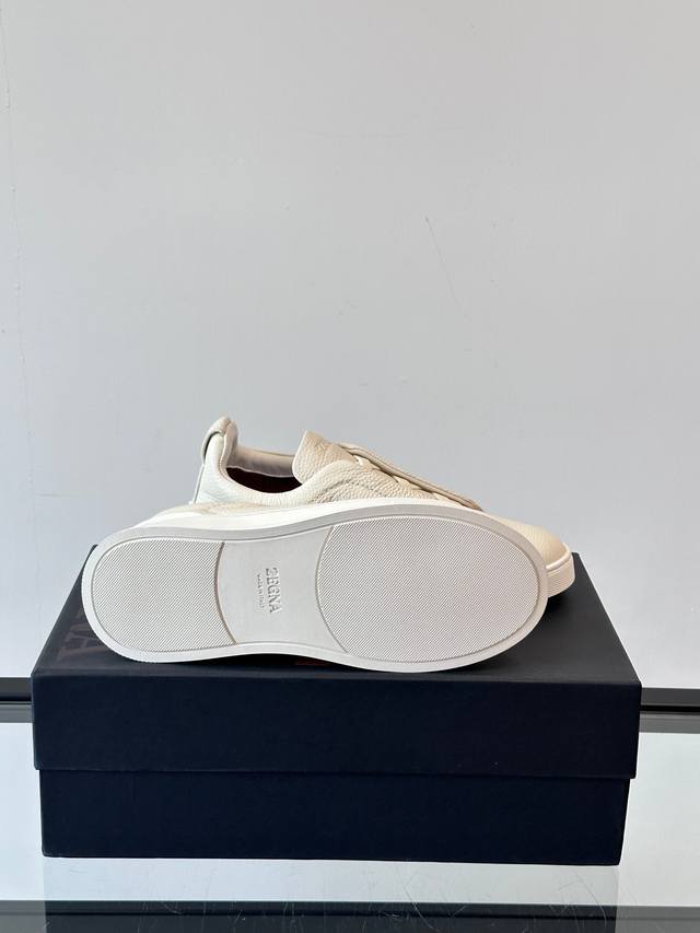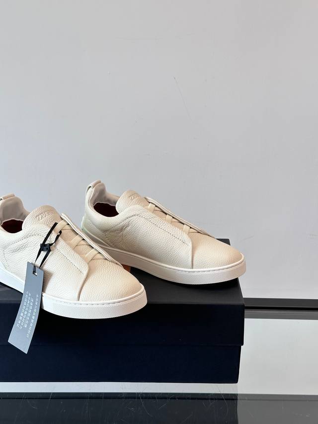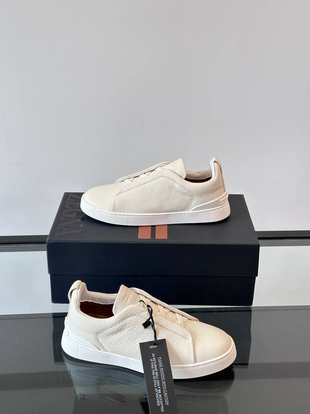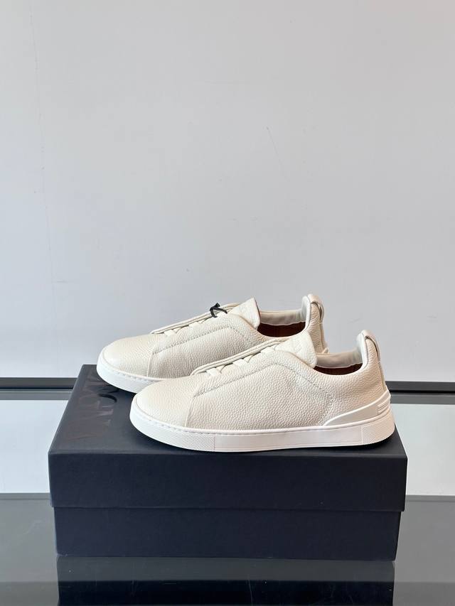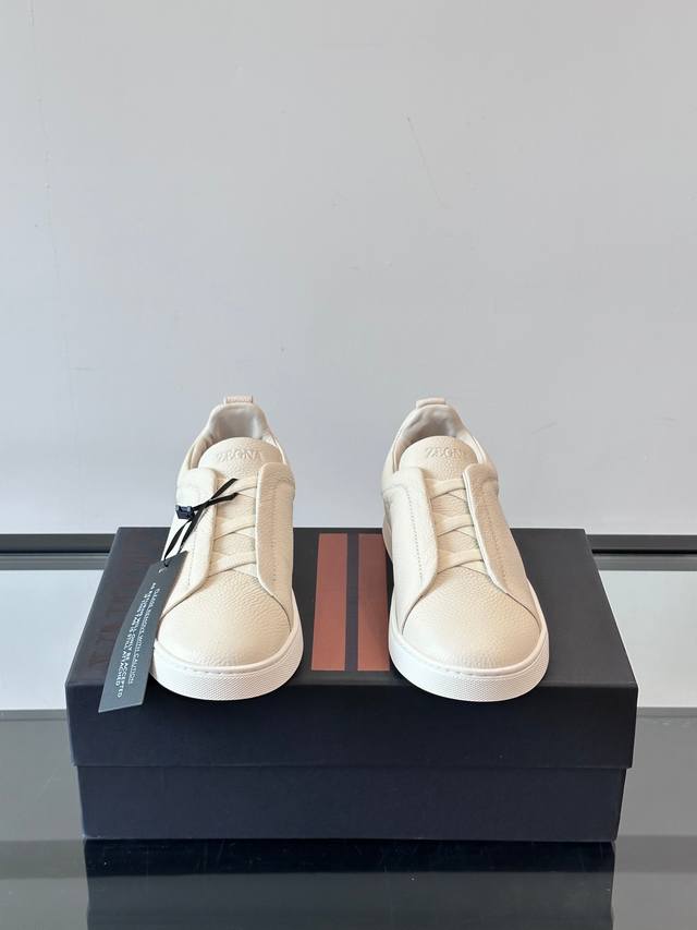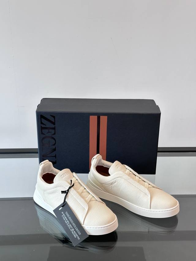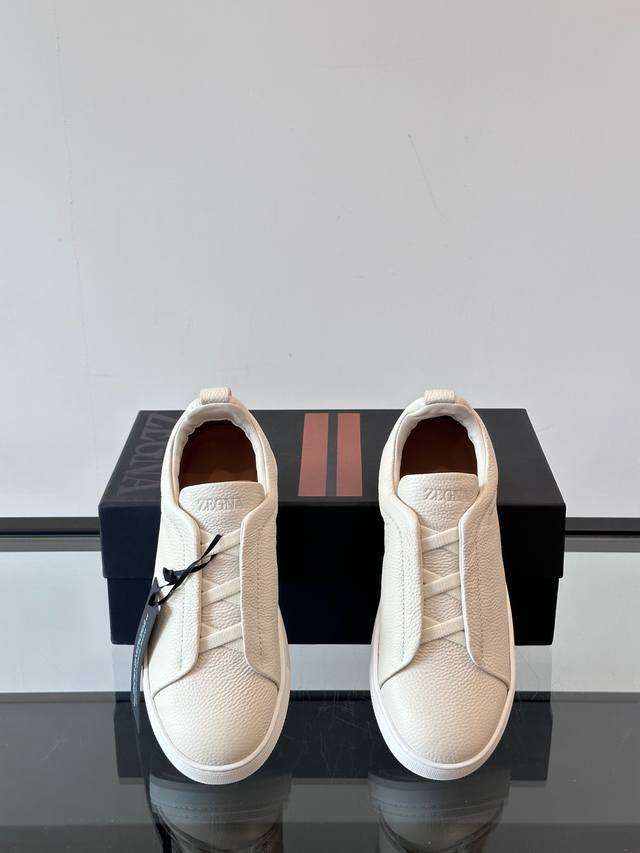 Zegna's new men's low-top leather sneakers, crafted from imported cowhide, feature rich craftsmanship details, including vicu?a leather inlays on the sole and embossed brand logo details. The clean and simple design lines are highly versatile, elegant, and dynamic. The non-slip, wear-resistant, and durable rubber outsole, along with hand-stitched seams between the sole and upper, ensures durability and prevents the sole from falling off. A very good trendy casual sneaker item for men! Size: 38-45