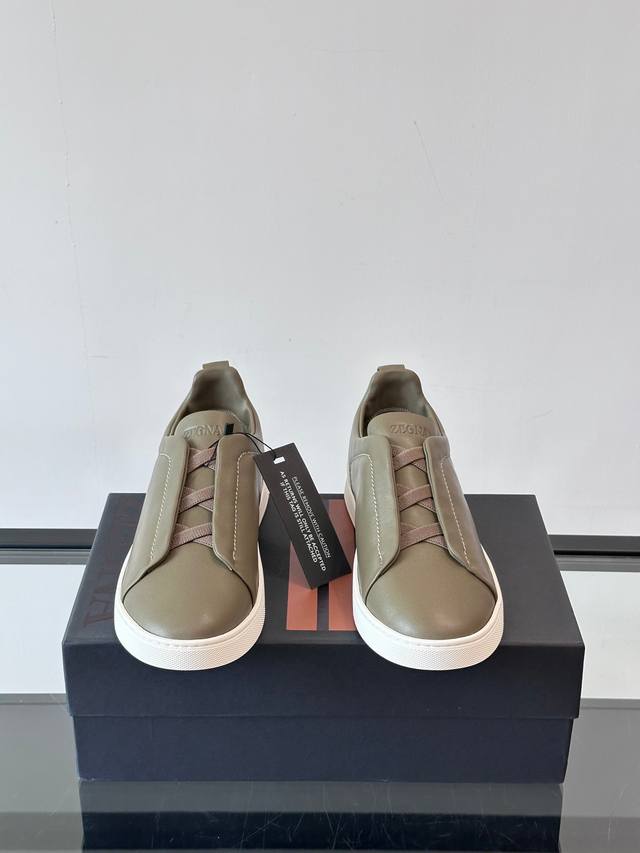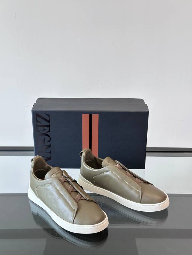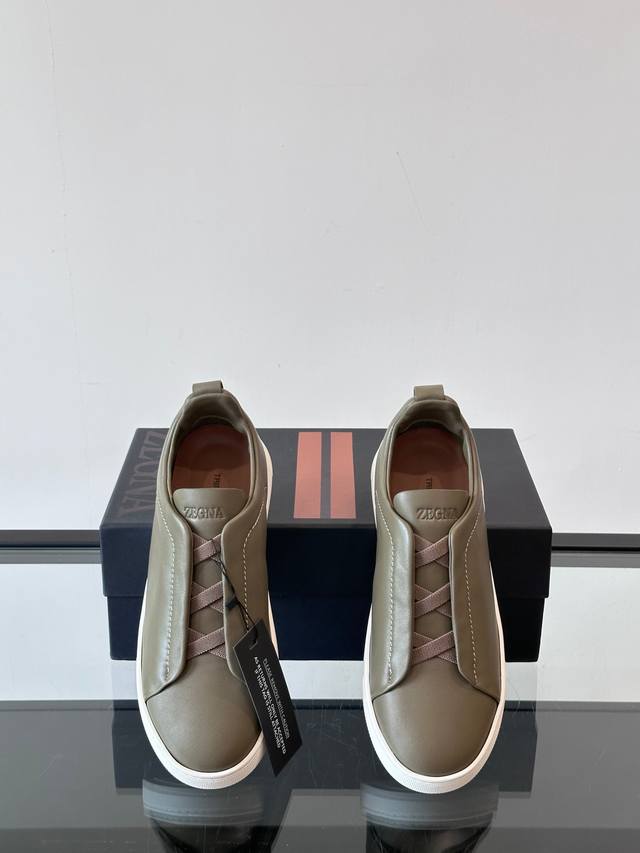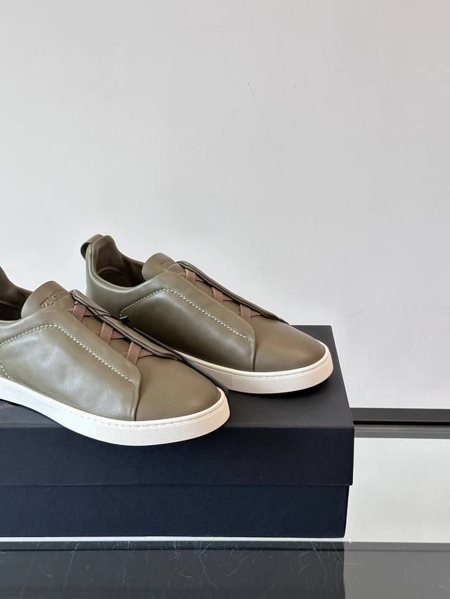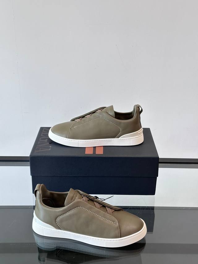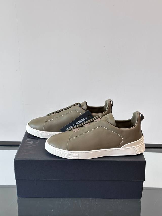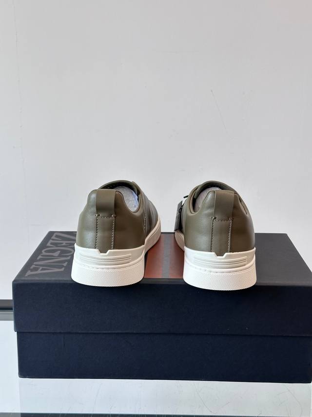 Zegna's new men's low-top leather sneakers, crafted from imported cowhide, feature rich craftsmanship details, including vicu?a leather inlays on the sole and embossed brand logo details. The clean and simple design lines are highly versatile, elegant, and dynamic. The non-slip, wear-resistant, and durable rubber outsole, along with hand-stitched seams between the sole and upper, ensures durability and prevents the sole from falling off. A very good trendy casual sneaker for men! Size: 38-45