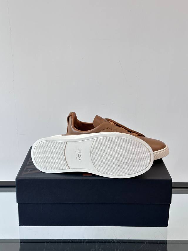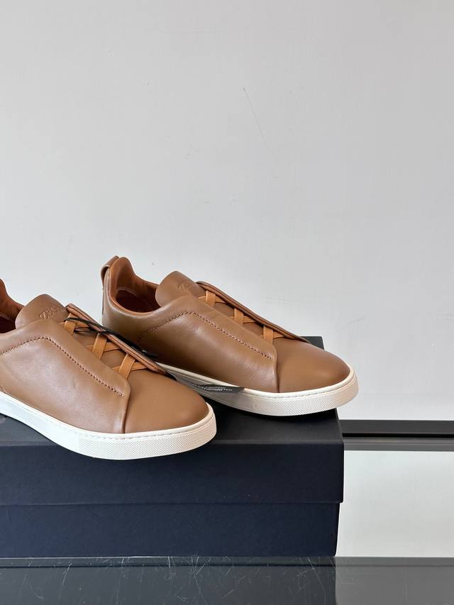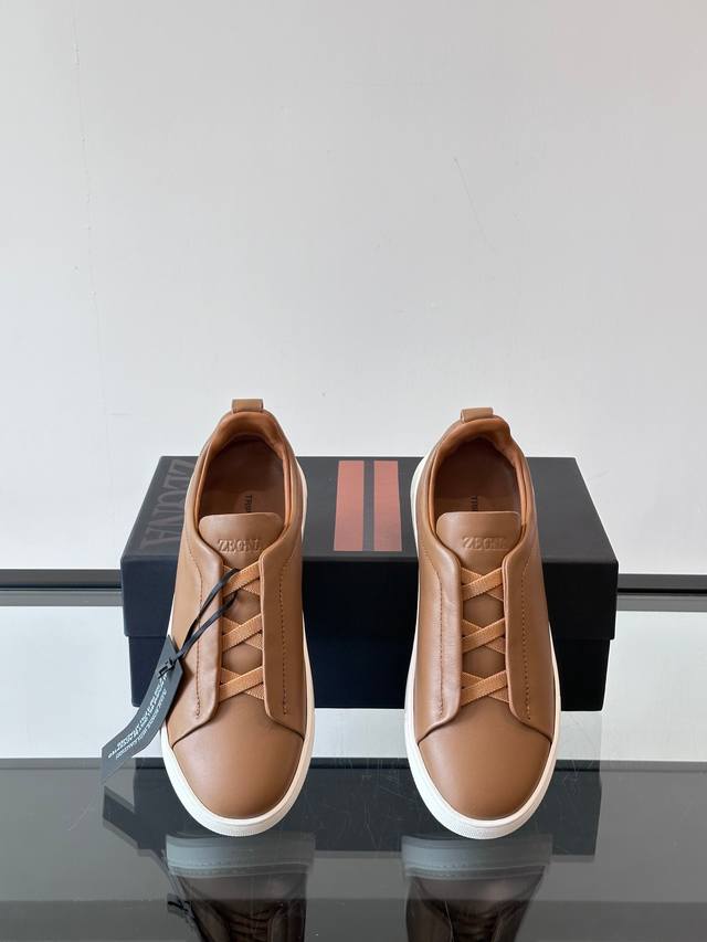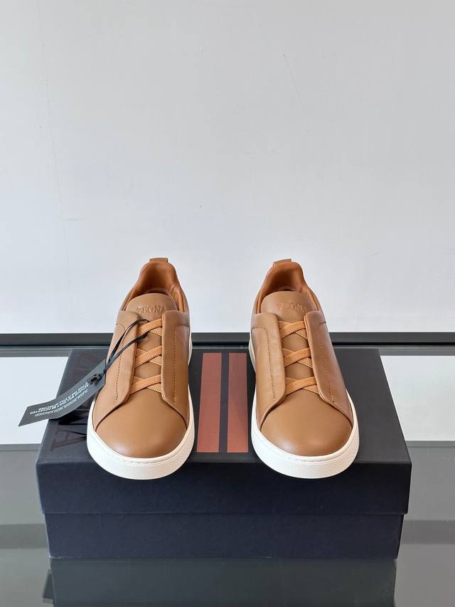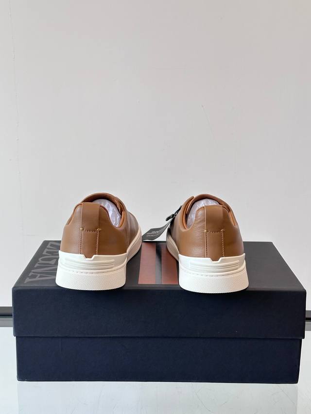 Zegna's new men's low-top leather sneakers, crafted from imported cowhide, feature rich craftsmanship details, including vicu?a leather inlays on the sole and embossed brand logo details. The clean and simple design lines are highly versatile, elegant, and dynamic. The non-slip, wear-resistant, and durable rubber outsole, along with hand-stitched seams between the sole and upper, ensures durability and prevents the sole from falling off. A very good trendy casual sneaker item for men! Size: 38-45
