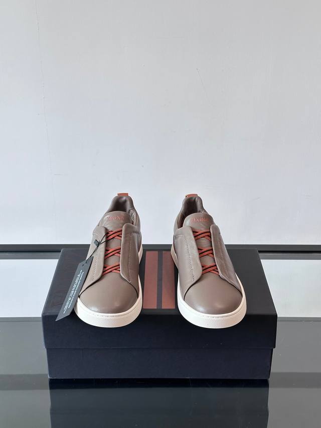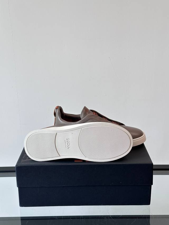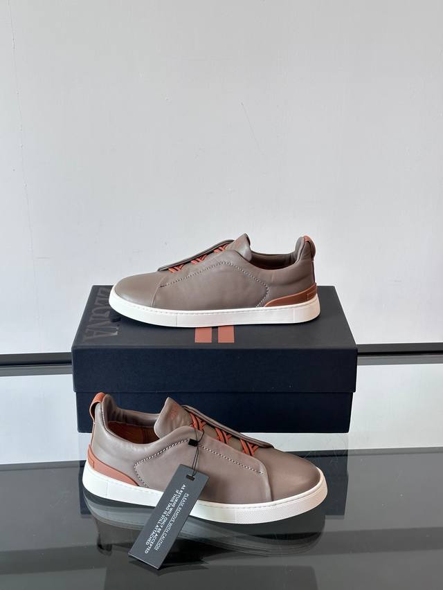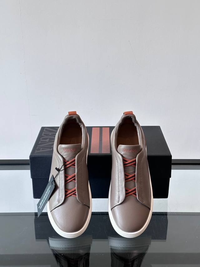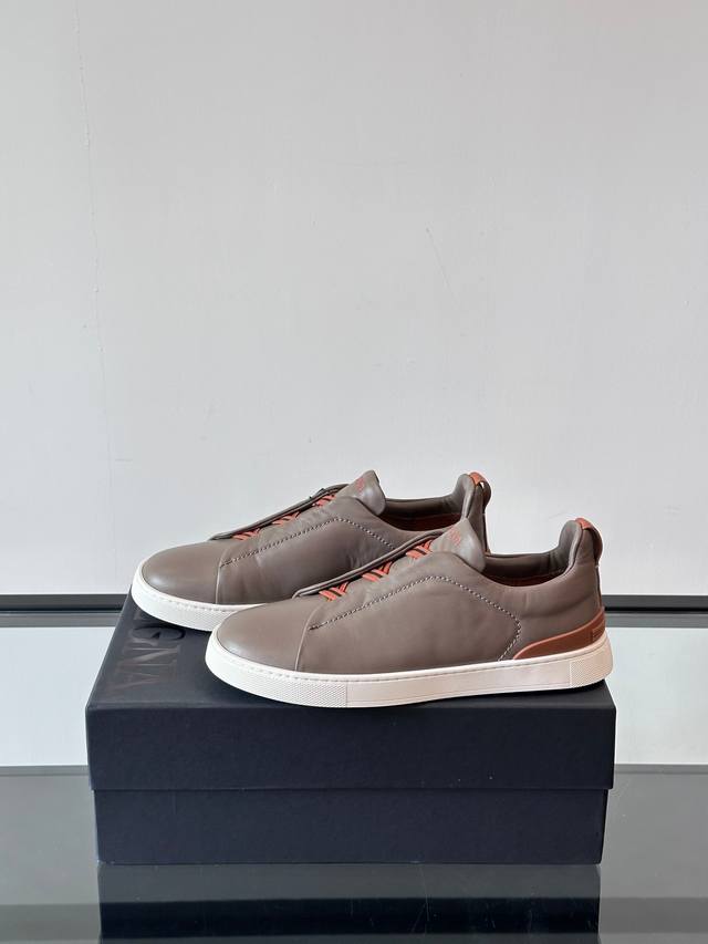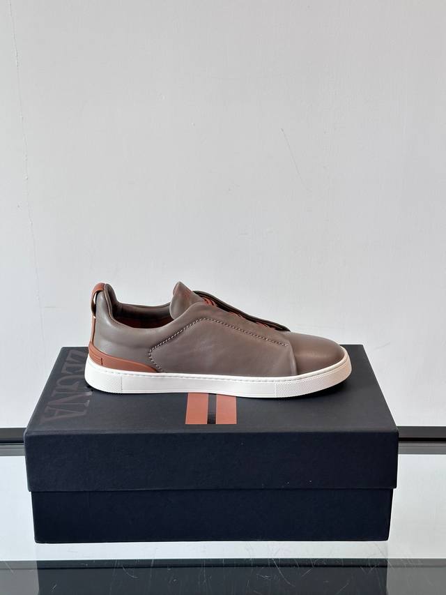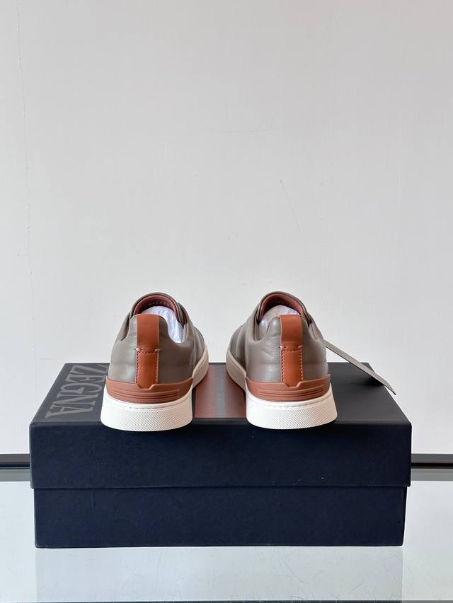Zegna's new men's low-top leather sneakers, crafted from imported cowhide, feature rich craftsmanship details, including vicu?a leather inlays on the sole and embossed brand logo details. The clean and simple design lines are highly versatile, elegant, and dynamic. The non-slip, wear-resistant, and durable rubber outsole, along with hand-stitched seams between the sole and upper, ensures durability and prevents the sole from falling off. A very good trendy casual sneaker for men! Size: 38-45