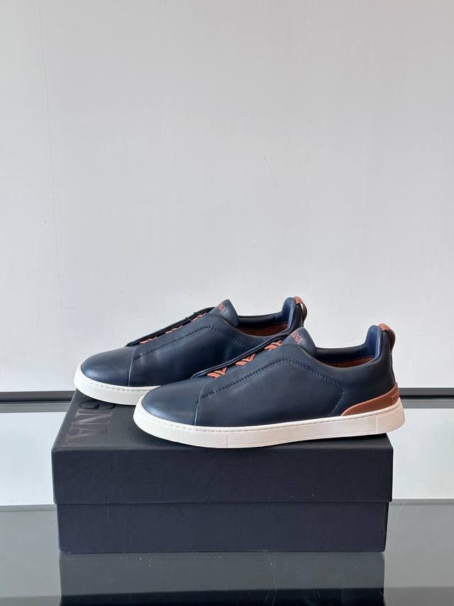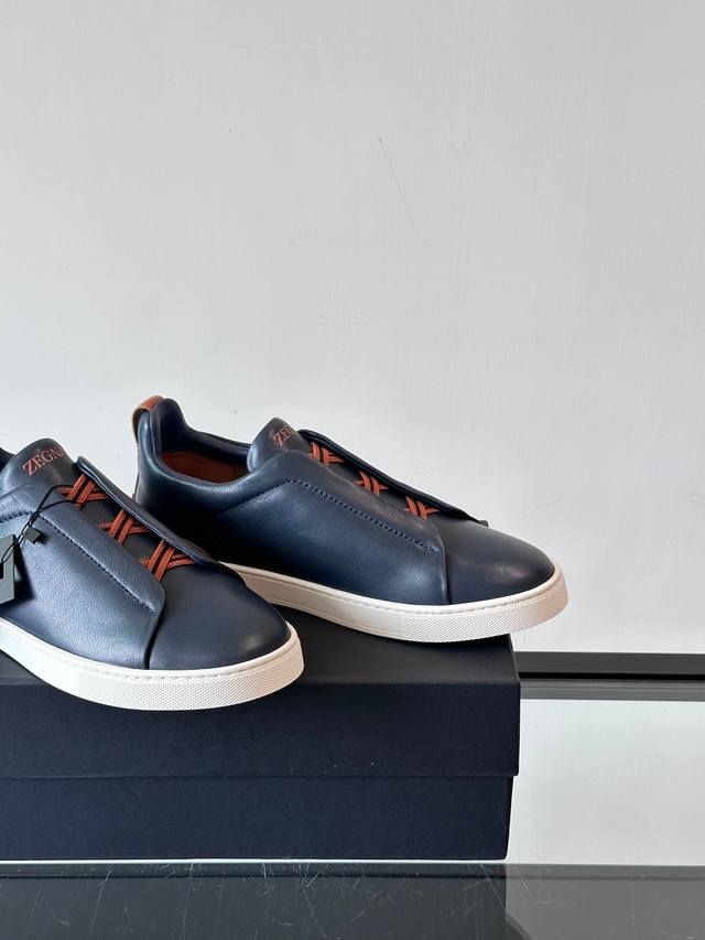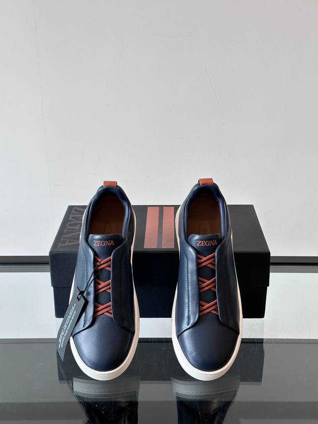 Zegna's new men's low-top leather sneakers, crafted from imported cowhide, feature rich craftsmanship details, including vicu?a leather inlays on the sole and embossed brand logo details. The clean and simple design lines are highly versatile, elegant, and dynamic. The non-slip, wear-resistant, and durable rubber outsole, along with hand-stitched seams between the sole and upper, ensures durability and prevents the sole from falling off. A very good trendy casual sneaker item for men! Size: 38-45