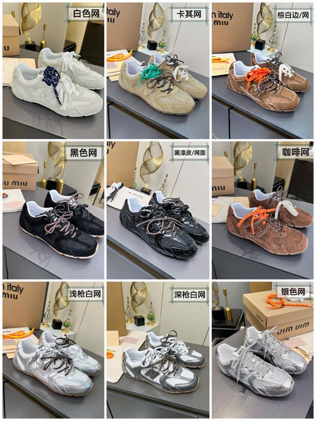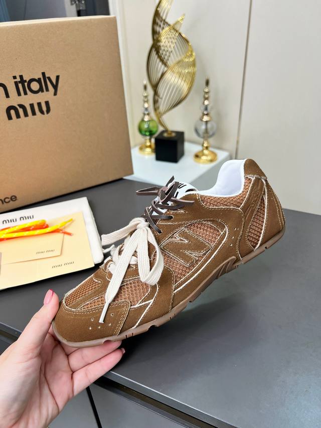 Original purchase, development and production. Inspired by the classic Miu Miu x New Balance Nb530 sports shoes, they launched their own iteration, the 530SL. These sneakers feature a deconstructed and lightweight design, available in brown and beige colorways. The New Balance 530 silhouette is wrapped in distressed fabric, with deliberately worn and uneven leather tones adding a unique personality. This collaborative shoe features a dual-lacing system, including white, orange, brown, and yellow laces, creating a casual feel and adding a touch of boyishness and chicness to the overall look. Material: Original custom imported top-grain cowhide; Lining: Sheepskin lining + breathable fabric; Outsole: Original molded non-slip rubber sole; Sizes: Women's 35-40, factory price (P); Men's 39-45, factory price (P).