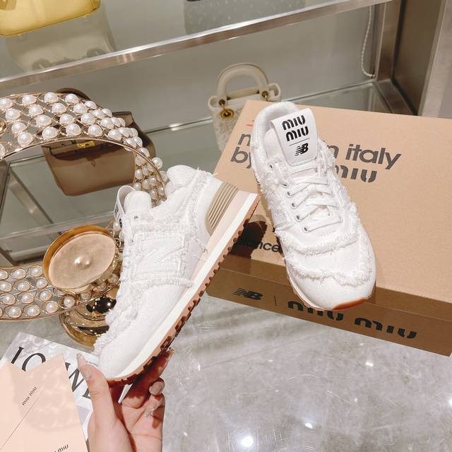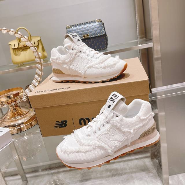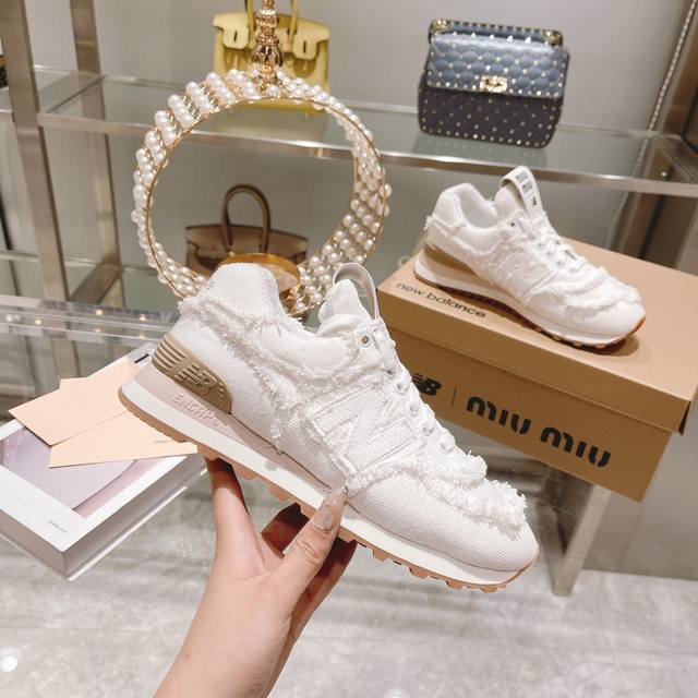 Factory direct women's shoes and sports shoes original top-tier version. Spring/Summer latest hot-selling Miu Miu X New Balance 574 collaboration sneakers. Original 1:1 mold replica. These sneakers, a collaboration with New Balance 574, were showcased at the Miu Miu fashion show and have since become a hot seller on major global online retailers. The distressed, frayed edges add a casual and rebellious touch while showcasing the beauty of denim. The overall design is rugged, distressed, and ripped. They are very lightweight and versatile. Material: Original custom twill distressed denim with pure water washing process. Lining: Imported high-density breathable mesh. Insole: 3cm high-elastic latex denim. Outsole: Original molded raw rubber combination outsole. Sole thickness: 2.5cm. Sizes: 35-39 40 Customized, No Returns or Exchanges. Packaging: Original Full Packaging. Colors: Updated in sync with the official website.