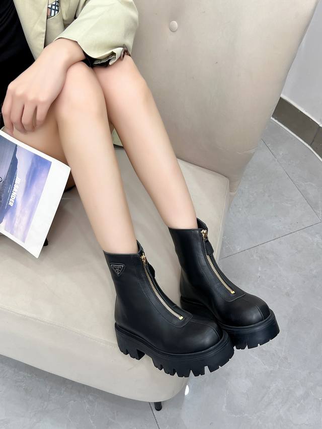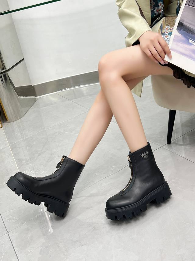 2025 Prada New Classic Triangle Logo Front Zipper Women's Boots - An absolute must-have! Thick sole and front zipper, stylish and flattering, perfectly balancing elegance and a slimming effect. The entire series uses various imported materials: top-grade calfskin, high-gloss suede, and