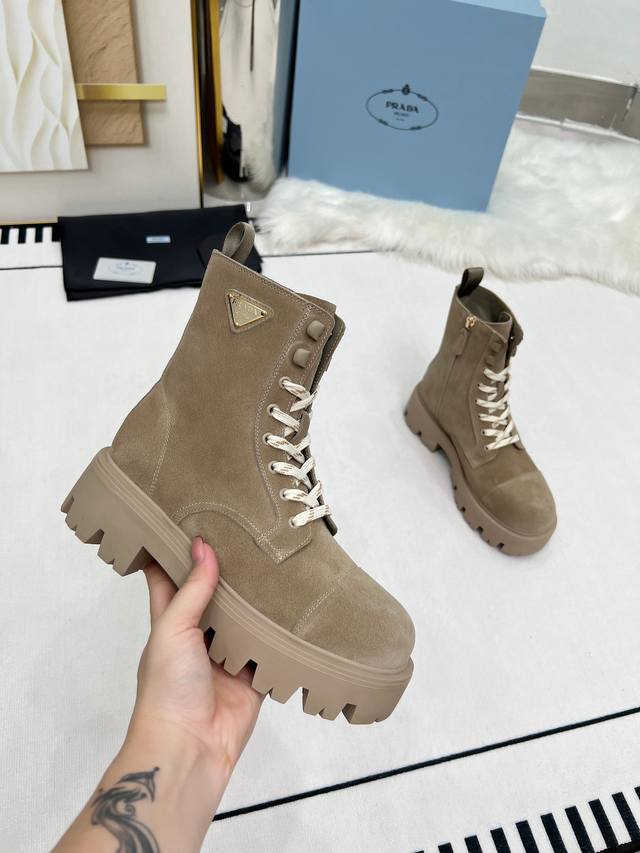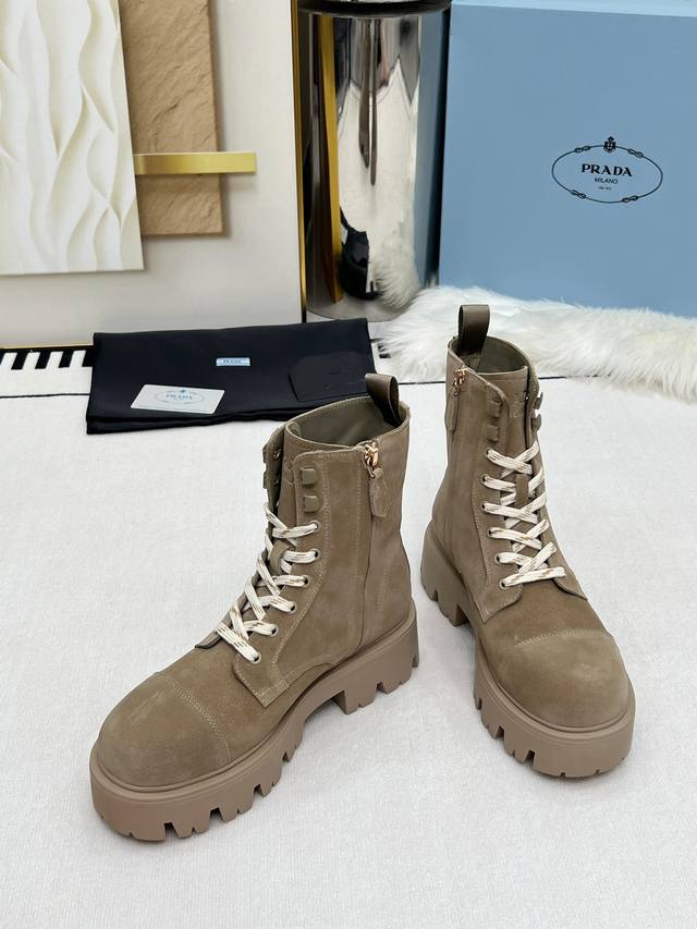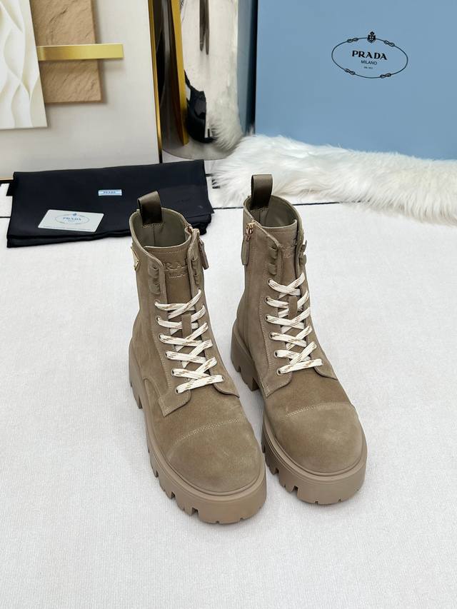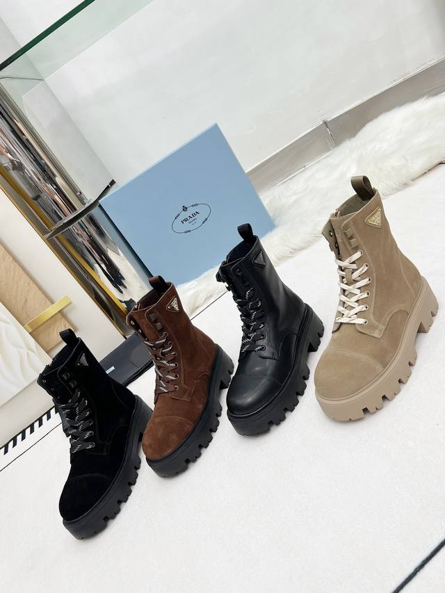 2025 Prada New Classic Triangle Logo Platform Martin Boots with Lace-up and Zipper Design, More Comfortable and Stylish, an Absolutely a Hot Item. They look great on the feet, making legs appear slimmer and exuding elegance. The entire series uses a variety of imported materials: top-grade calfskin, high-gloss suede, and DDD water-dyed cowhide lining. Sizes: 35-40, 41 made to order. DDD