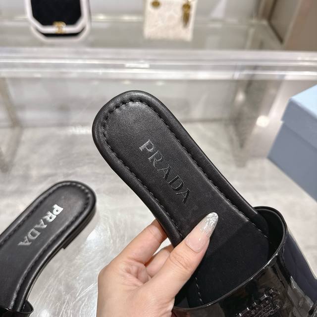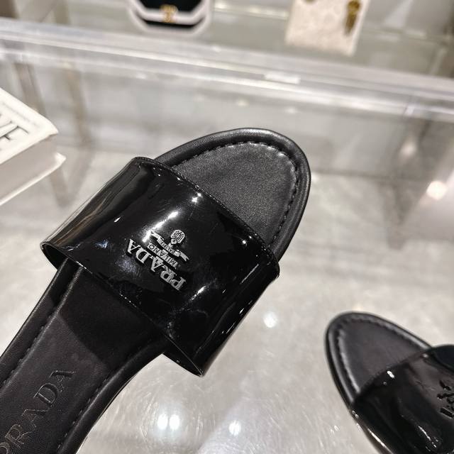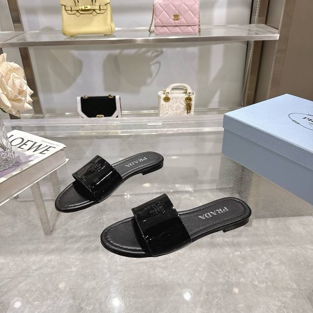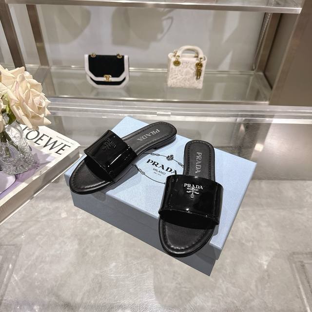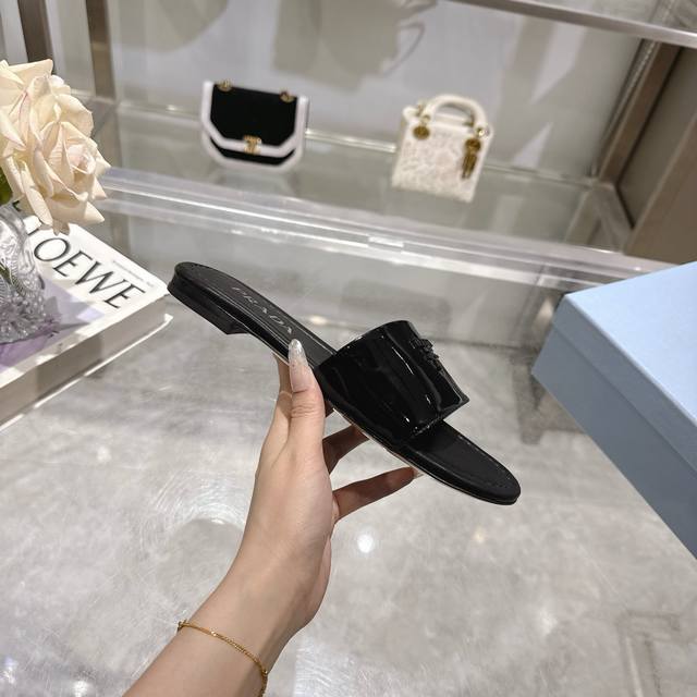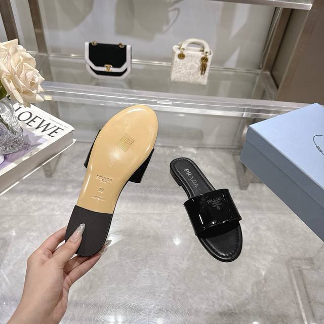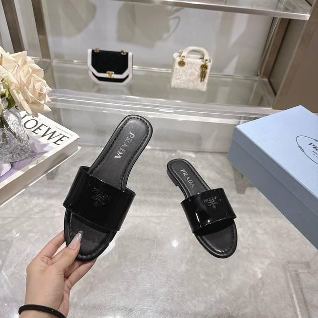 2025 Prada's latest hot-selling slippers. Factory direct price. Made with top-quality patent leather and a high-performance genuine leather sole, these slippers are a summer essential that requires minimal care. Sizes 35-40M (standard sizes). Available in 6 colors. Comes with standard packaging.
