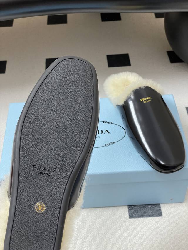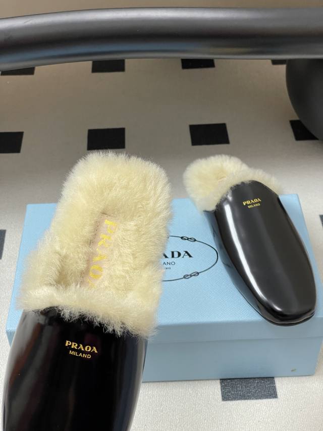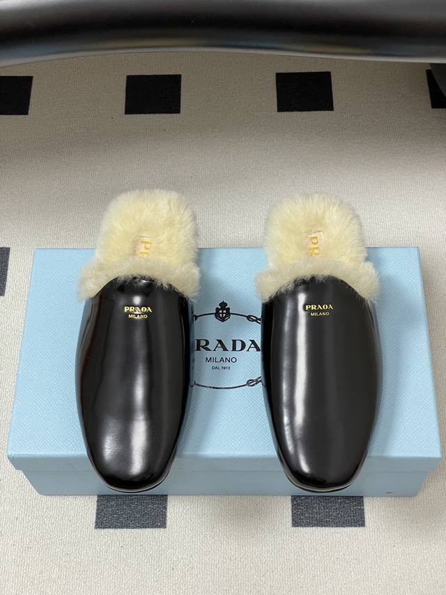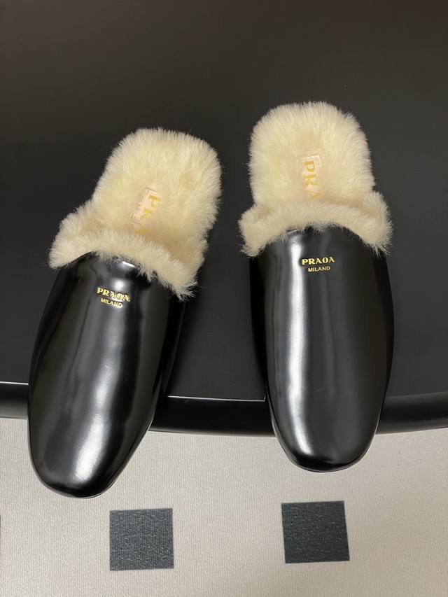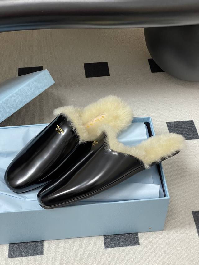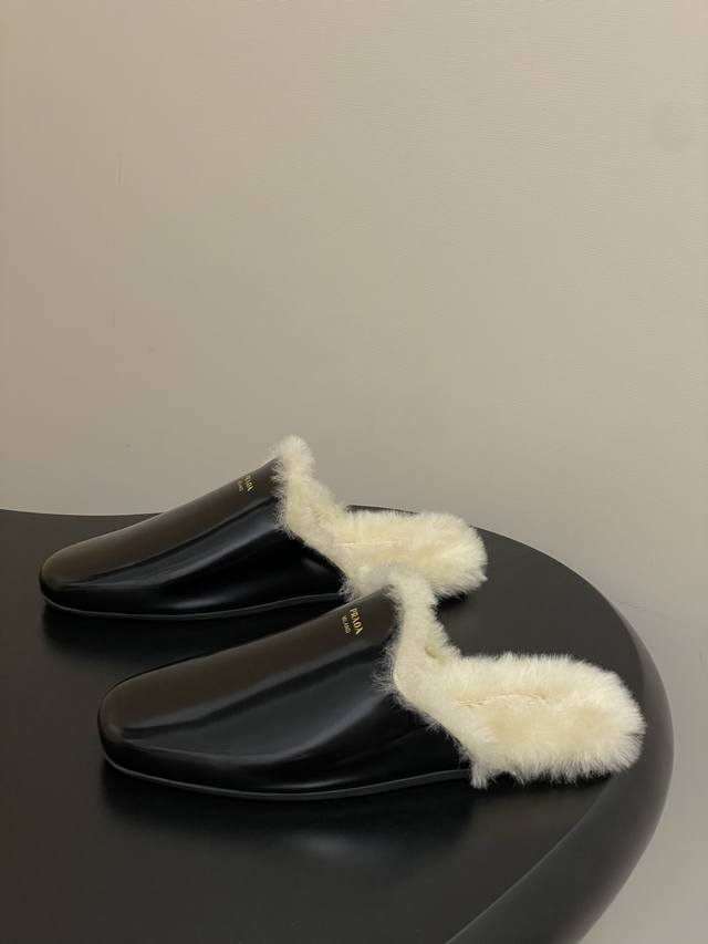 25Aw Autumn/Winter New Prada Square Toe Mule Shoes, Suede & Wool Half-Slippers