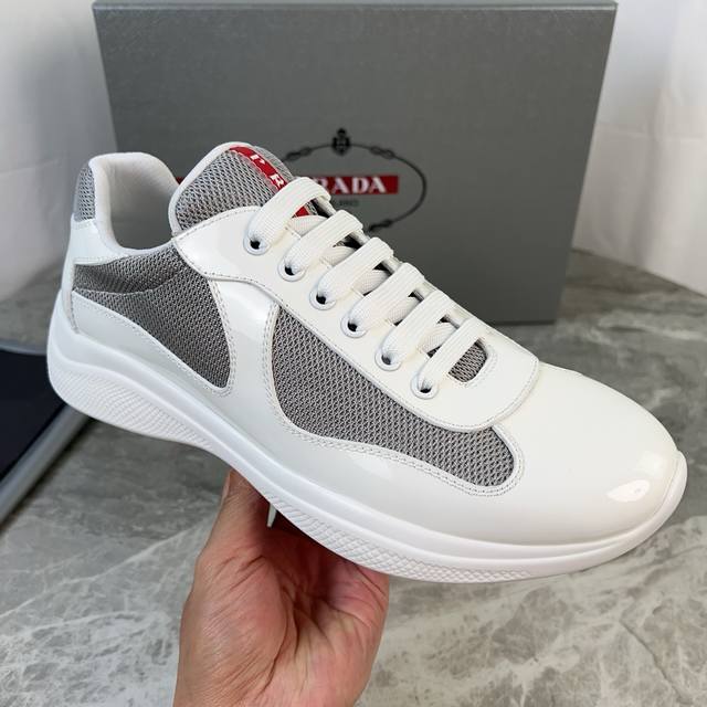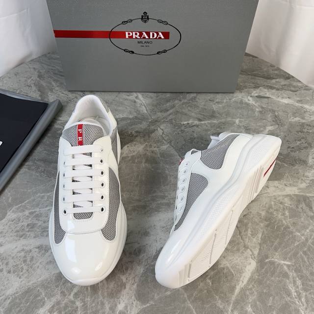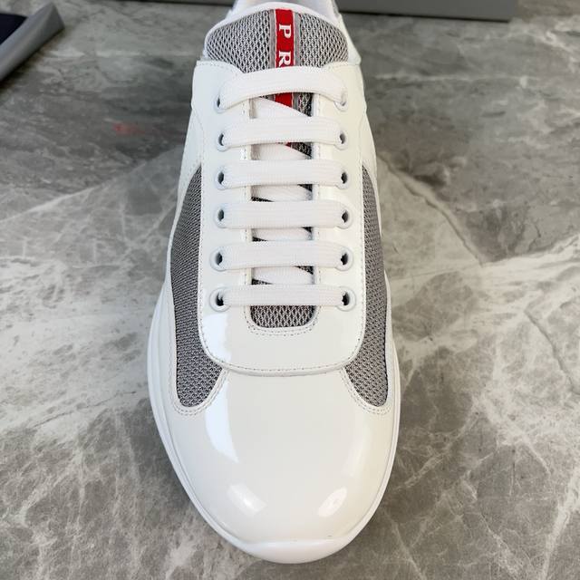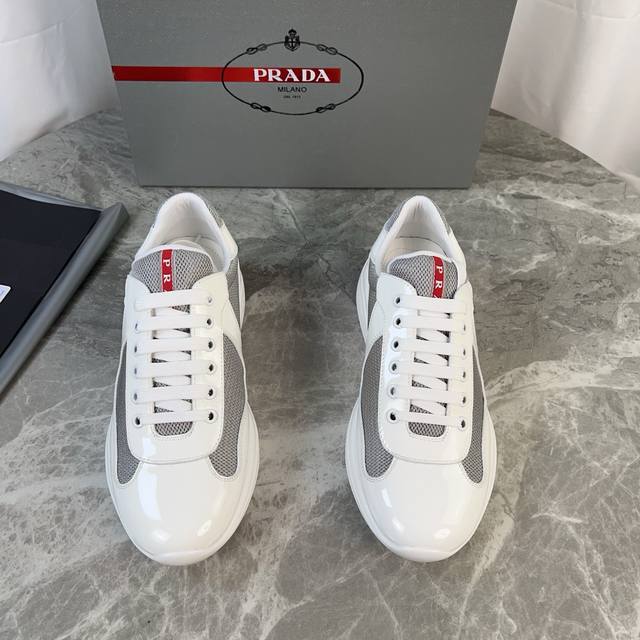 Classic P-brand design. Outer layer: Top-grain patent leather + brand mesh fabri