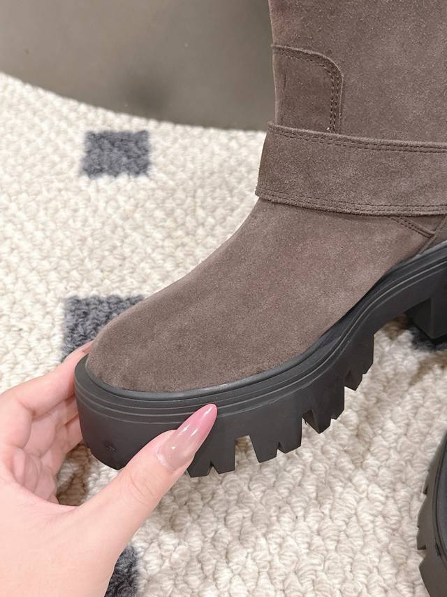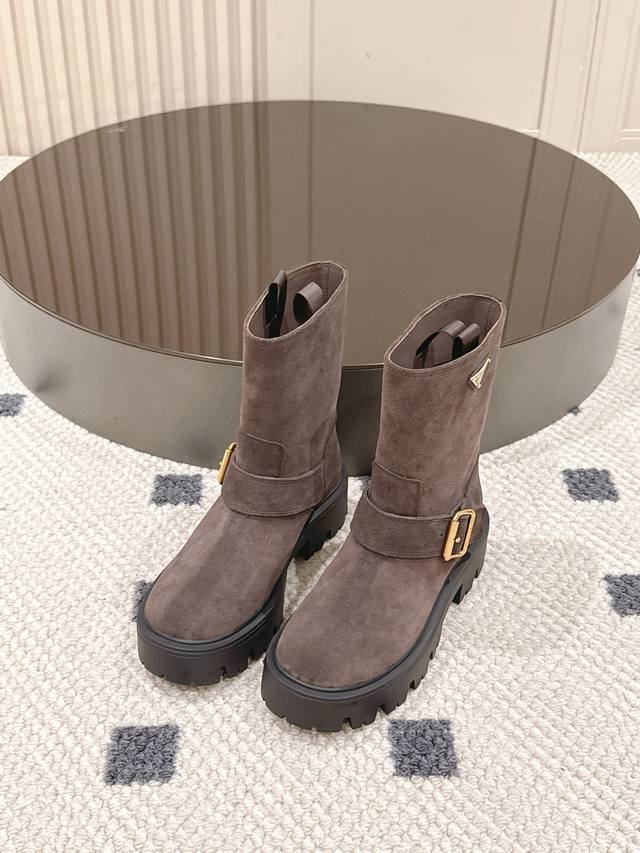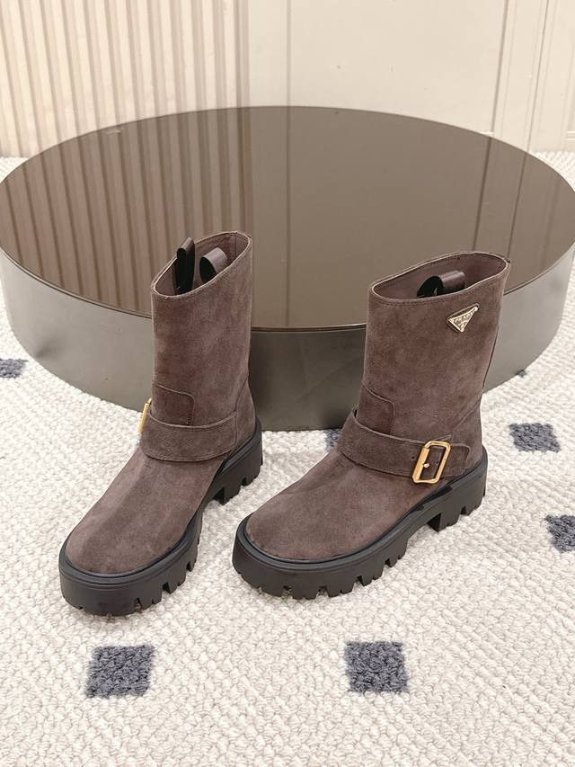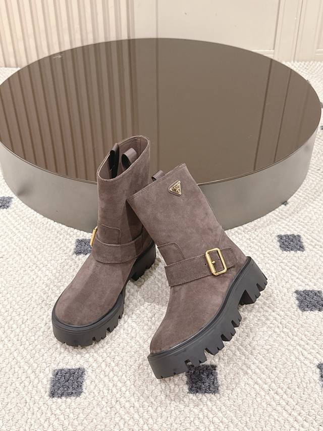 The cool black version pairs perfectly with jeans and a biker jacket for a street style icon; the gentle khaki and sophisticated brown versions complement wool coats and long skirts, exuding elegance. The metal buckle design on the boots adds a touch of ruggedness and casualness, a detail that will appeal to the most discerning eye. This fall and winter, with Prada platform boots, your style will be off the charts, making you the most fashionable person on the street! #Prada #2025NewBoots #PlatformBoots #FashionOutfit