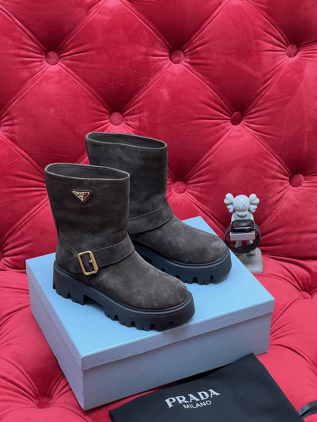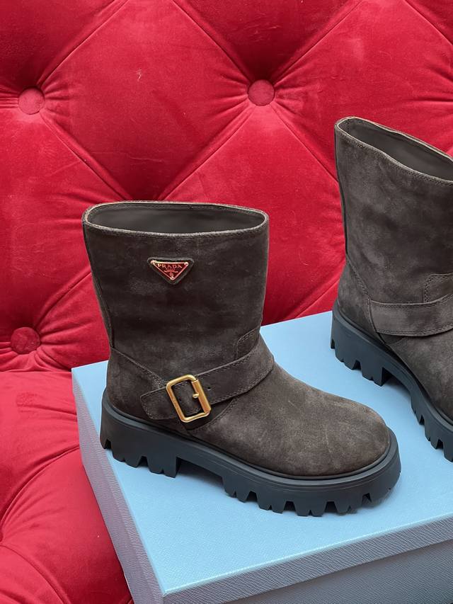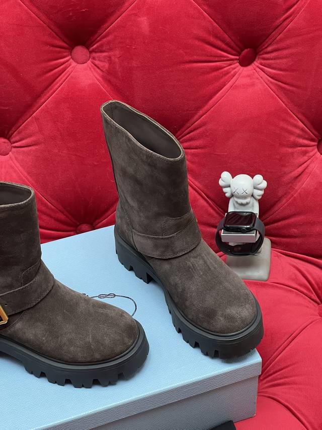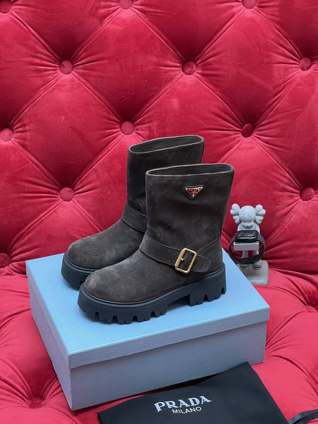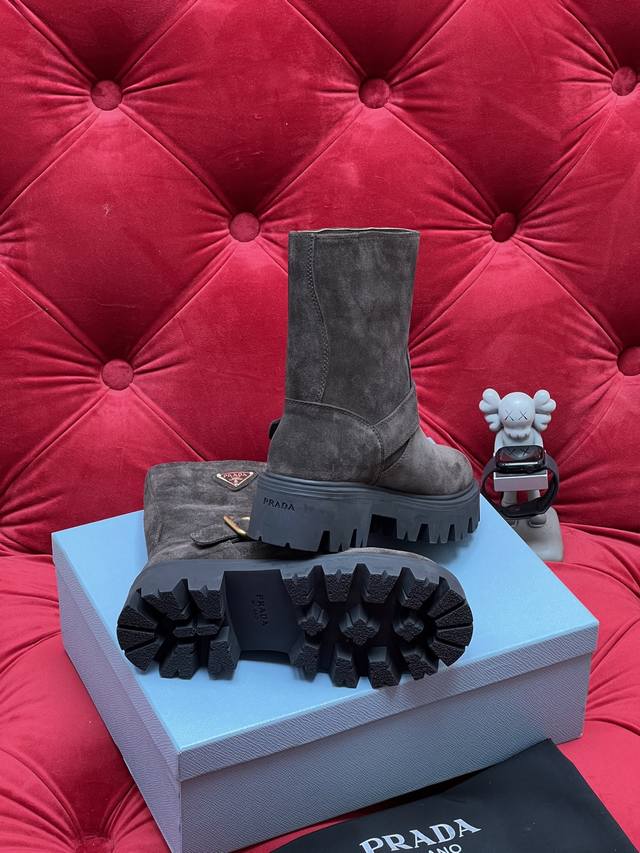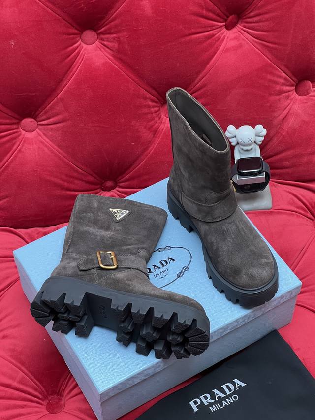 Exclusive Real Shot Top-Tier Version, What You See Is What You Get Prada 2026 Fall/Winter Bestselling Classic Riding Boots Series. These boots look amazing on foot and can elongate your legs. Unlike the mixed quality products on the market, this one's selling point is the genuine leather outsole. I disassembled the original model and used the original mold for the outsole. Any comparison is welcome regarding comfort and texture. Material: Original suede cowhide. Lining: Imported cowhide lining. Outsole: Original sole. Size: 35-39 [40.41 Made to order, no returns or exchanges].