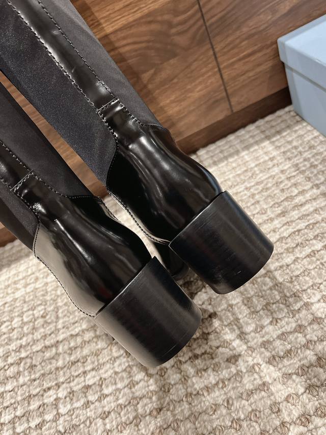 Fabric and Leather Patchwork# Prada riding boots, fashionable and casual motorcycle boots. Unique style, loved by everyone, easy to wear, and a hit every year. The classic last is sure to win you over. Wearing them provides both height and casual style, simple and cool! Imported split-edge bead patchwork, imported waterproof fabric insole, translucent dyed sheepskin lining, original genuine leather outsole. Sizes: 35-40. 40 custom-made.