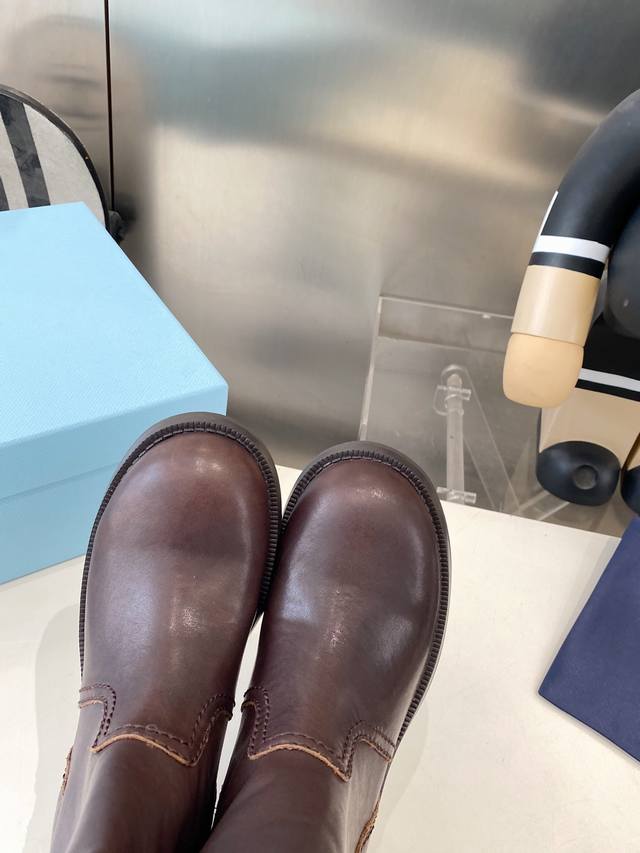 Leather cowhide leather Prada 25Ss classic triangle logo slip-on boots for wome