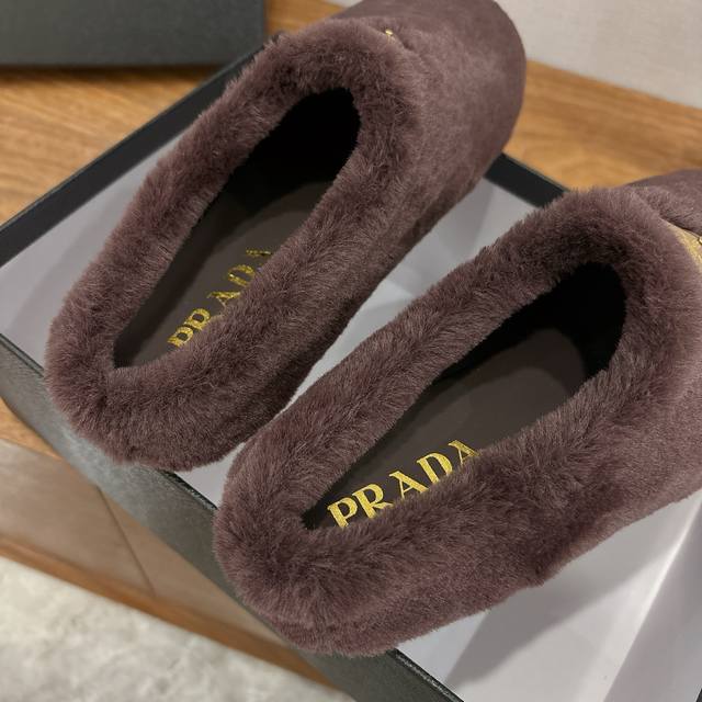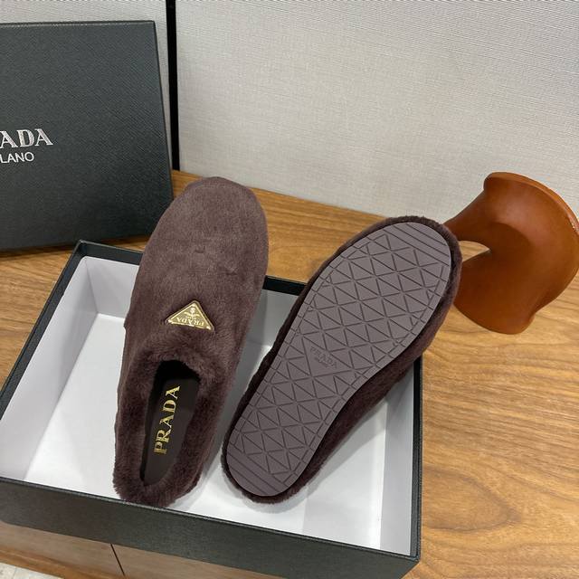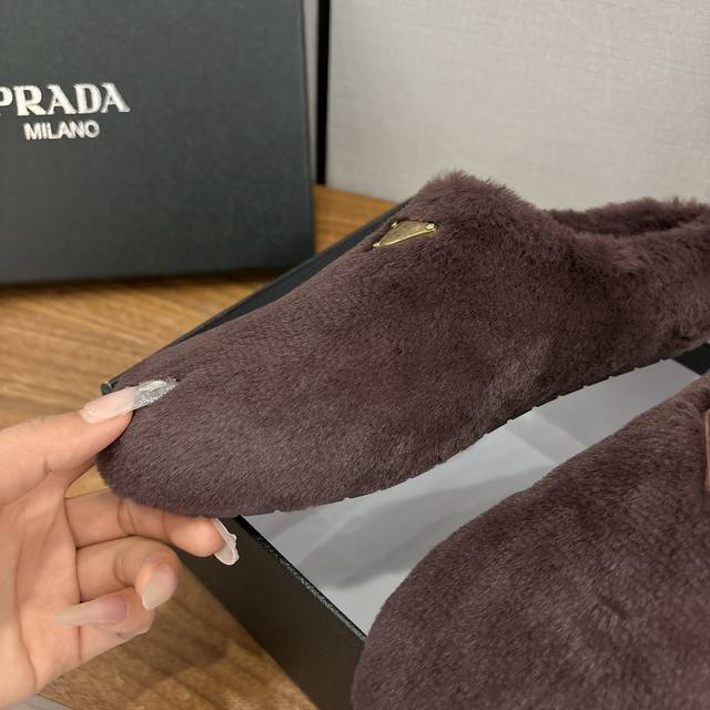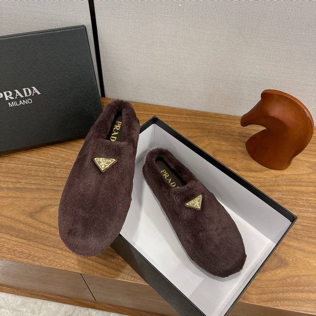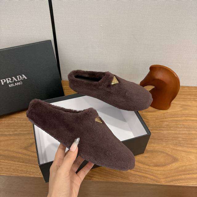 Factory direct Prada Fall/Winter 2025 Fleece Slippers, Half-Slipper, Wool, Classic Triangle Buckle, Comfortable, Cute, Stylish, Elegant, and Versatile. The soft and comfortable wool evokes the warmth of autumn and winter. Enjoy comfortable walks from morning till night. Pair with socks for easy season-changing style. Wool, sheepskin lining, insole. Original outsole. Sizes 35-39. Sizes 40. Custom orders, no returns or exchanges.