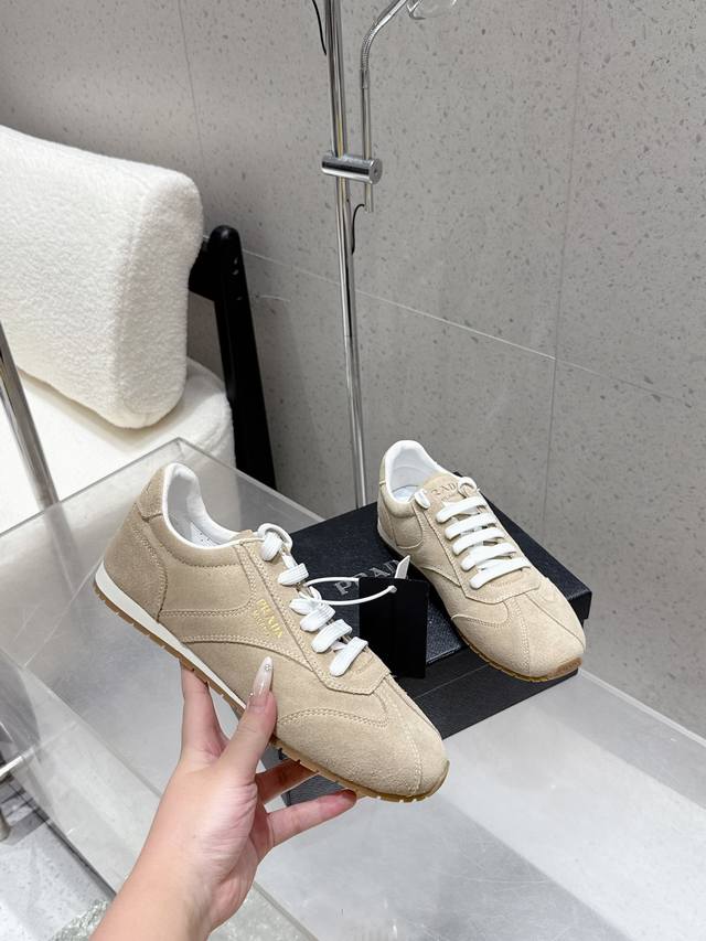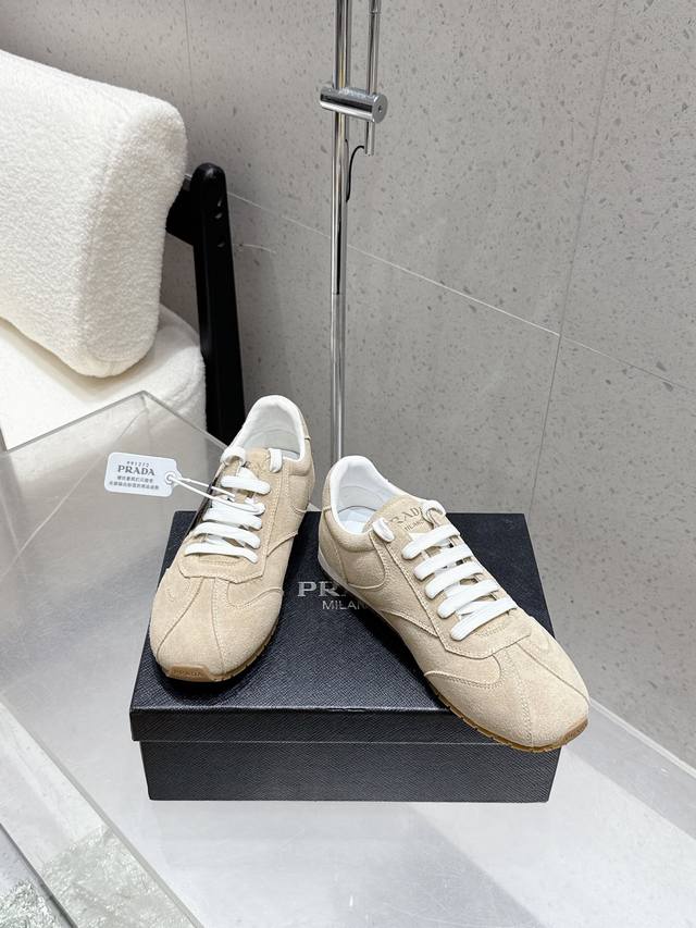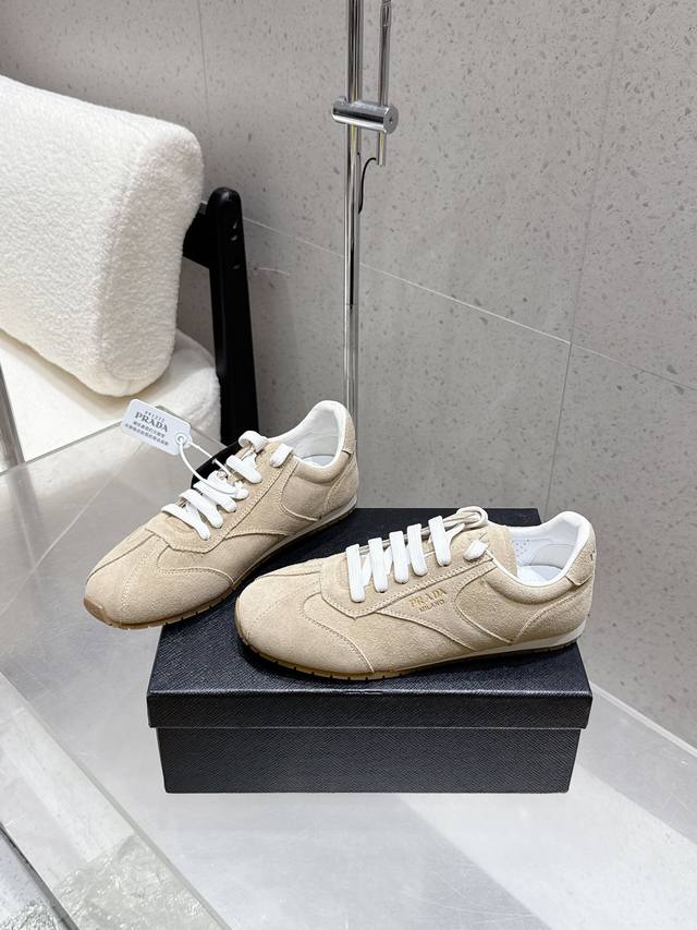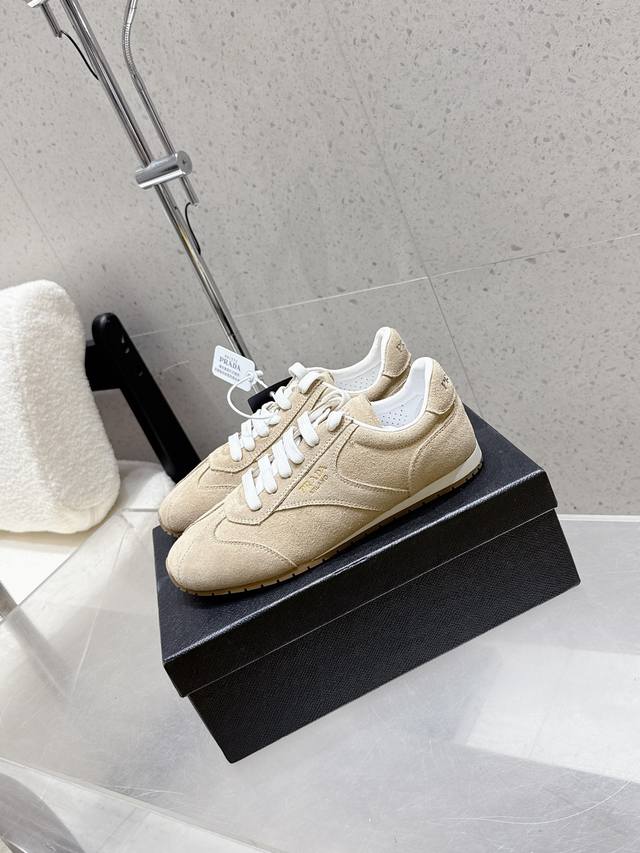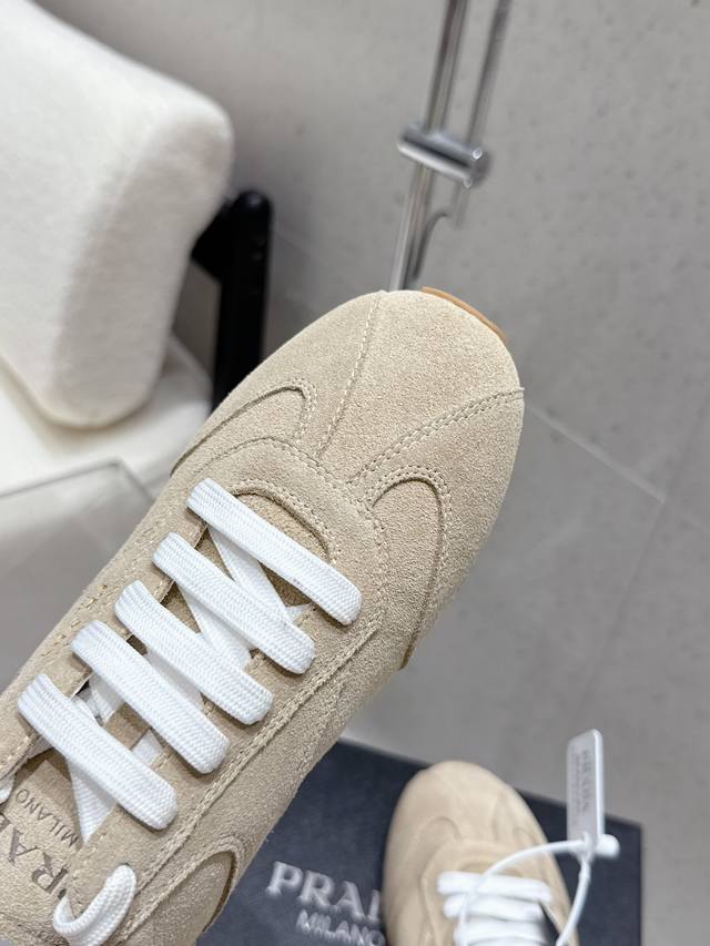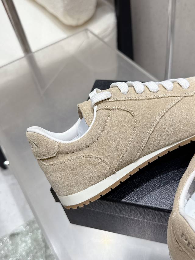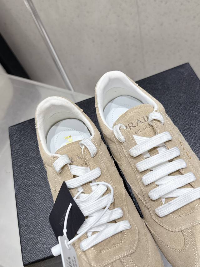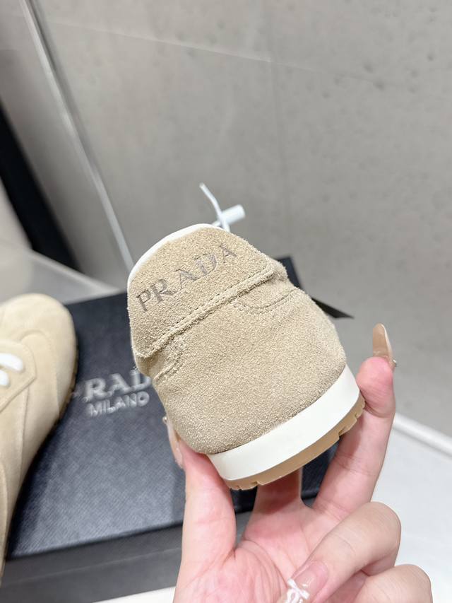 Factory direct Prada Fw25 Showroom German Training Casual Shoes. Features a custom-molded TPU outsole, textured suede upper, and a soft, supple sheepskin lining. The thickened lambskin insole provides exceptional comfort and support, offering a snug fit. A lightweight, comfortable, and practical casual shoe that flatters the figure and makes legs appear longer! Upper: Cow suede; Lining: Sheepskin; Outsole: Original custom-molded TPU two-tone outsole. Sizes: 35, 41, 40, 41. Custom orders are non-refundable and non-exchangeable.