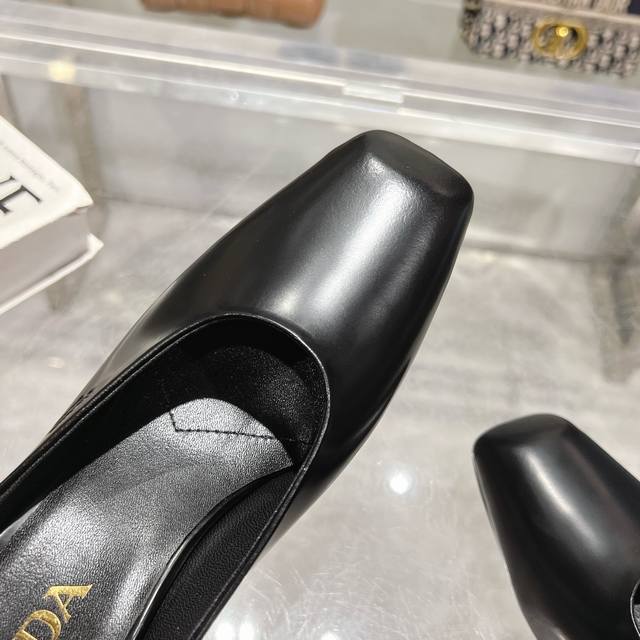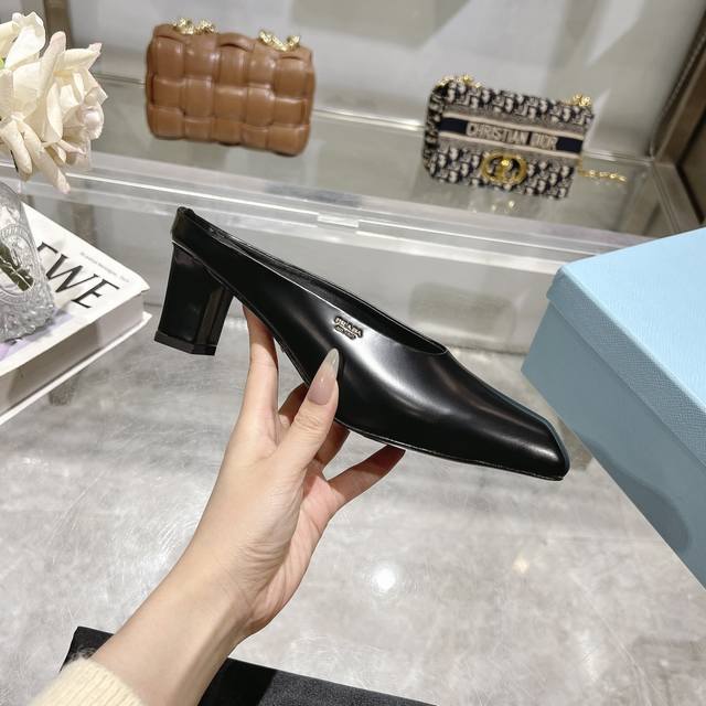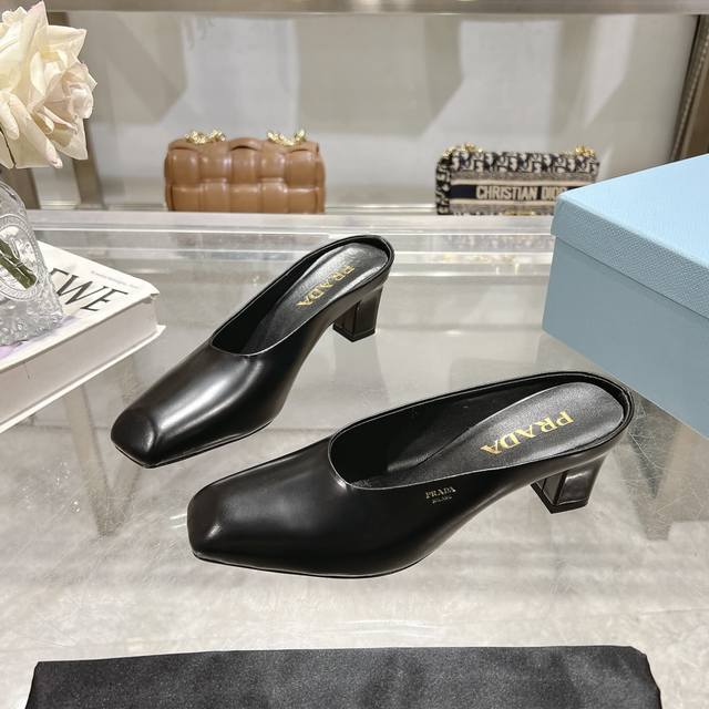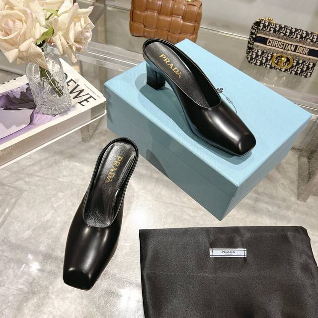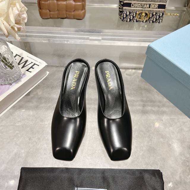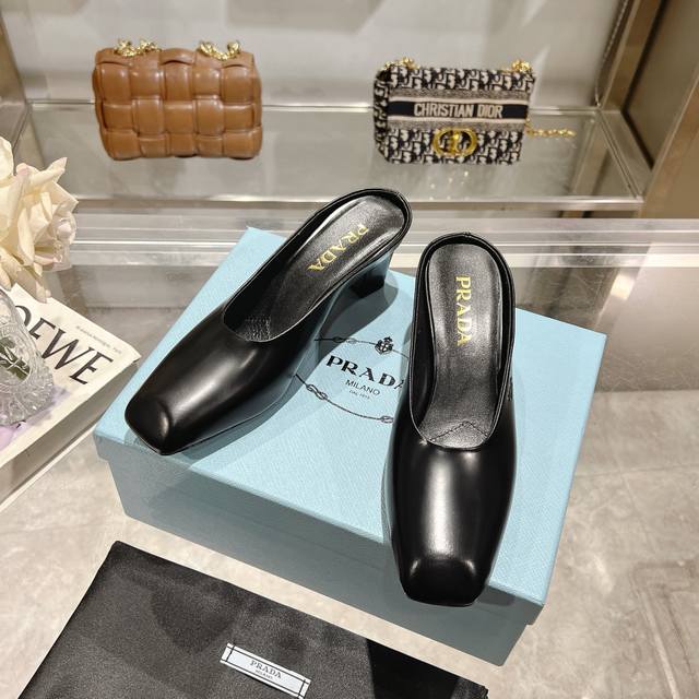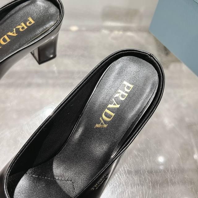 Factory direct price, 2025 new arrival, runway star new fashion trend Prada square-toe high-heeled chunky sandals with open back. The upper is made of imported cow patent leather, with imported sheepskin for the side bead and insole, and an Italian injection-molded genuine leather outsole. Three heel heights: flat, 5.5cm, and 8.5cm. Sizes: 35-40, 41 can be customized, no returns or exchanges.