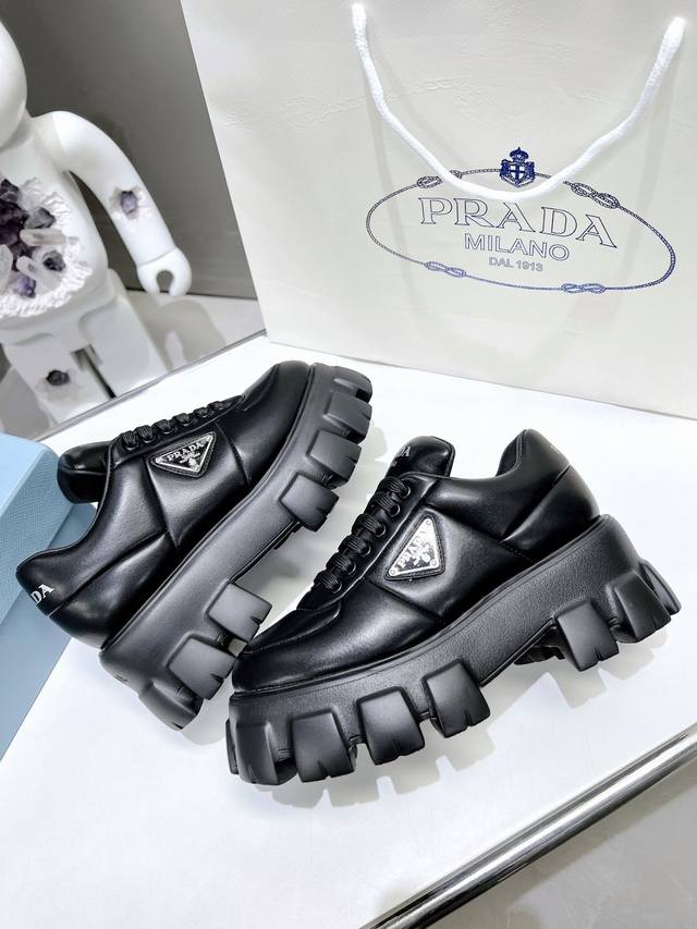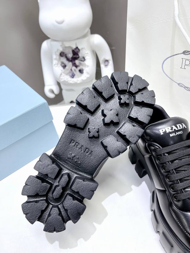 Prada New Black Super Soft First Layer Calfskin Thick-Soled Casual Leather Shoes, worn by Liu Wen and many other internet celebrities. This Prada platform shoe is very popular this year, offering both height and casual style. The clean design reflects meticulous attention to detail.