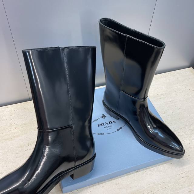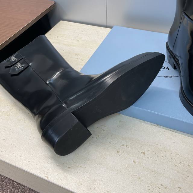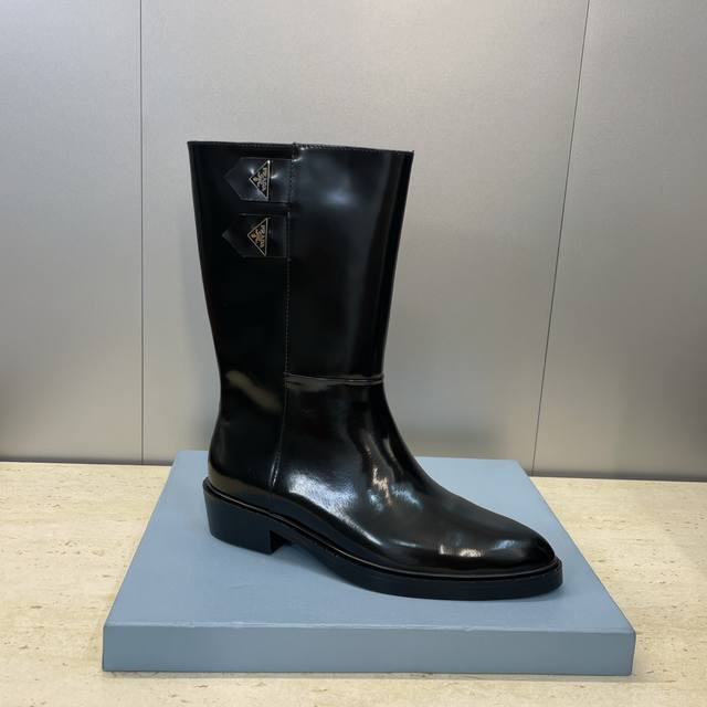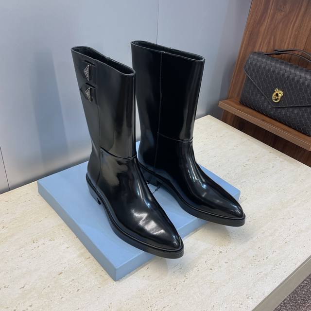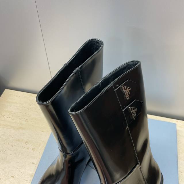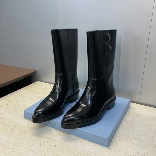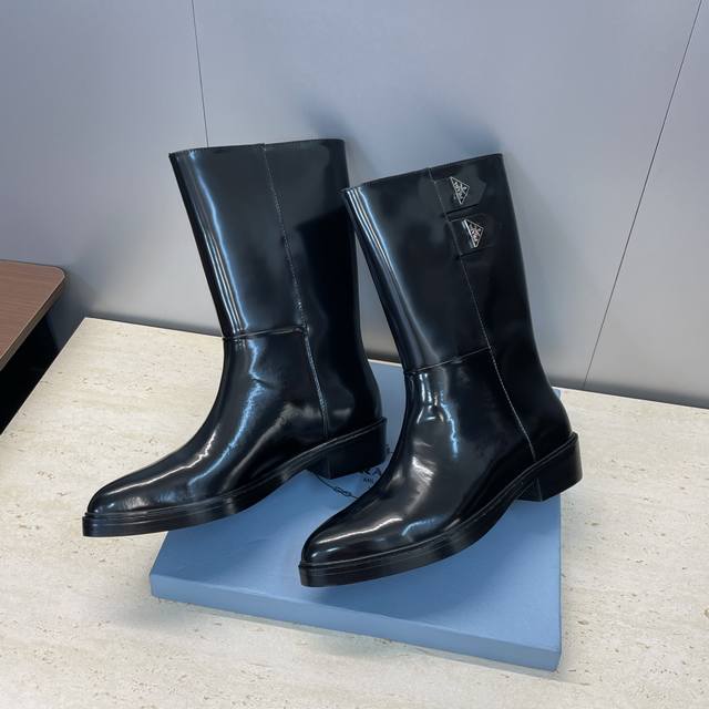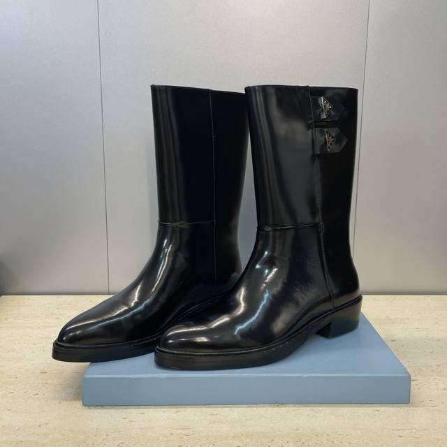 Factory Price Prada 2025 Autumn/Winter New Nomadic Style Mid-Calf Motorcycle Boots for Women, Celebrity Style Punk Style Low Heel Pointed Toe Iconic Letter Logo Triangle Badge Slip-on Martin Rider Military Boots Top-Tier High-End Version on the Market Material: Imported calfskin upper, imported split-edge cowhide + water-dyed sheepskin lining + original molded outsole Heel Height: 2.5cm Size: 35-39 40.41 Custom-made, no returns or exchanges