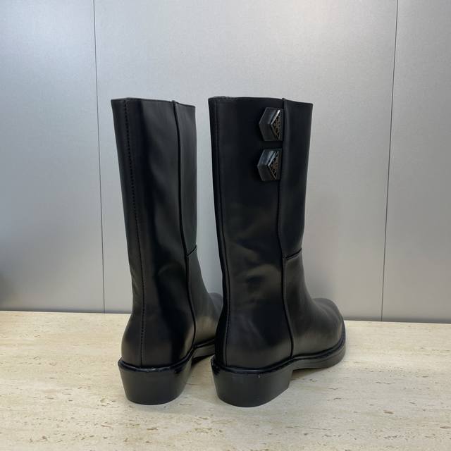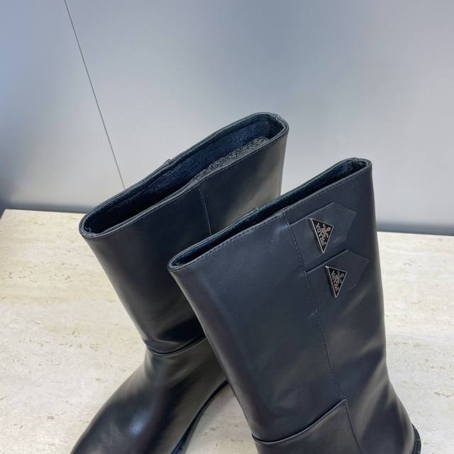 Factory Price Prada 2025 Autumn/Winter New Nomadic Style Mid-Calf Motorcycle Boots for Women, Celebrity Style Punk Style Low Heel Pointed Toe Iconic Letter Logo Triangle Badge Slip-on Martin Rider Military Boots Top-Tier High-End Version on the Market Material: Imported calfskin upper, imported split-edge cowhide + water-dyed sheepskin lining + original molded outsole Heel Height: 2.5cm Size: 35-39 40.41 Custom-made, no returns or exchanges