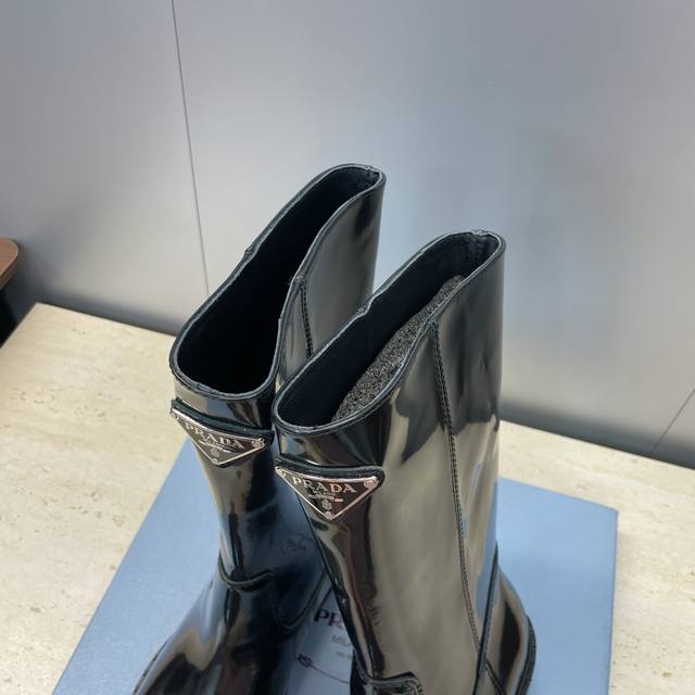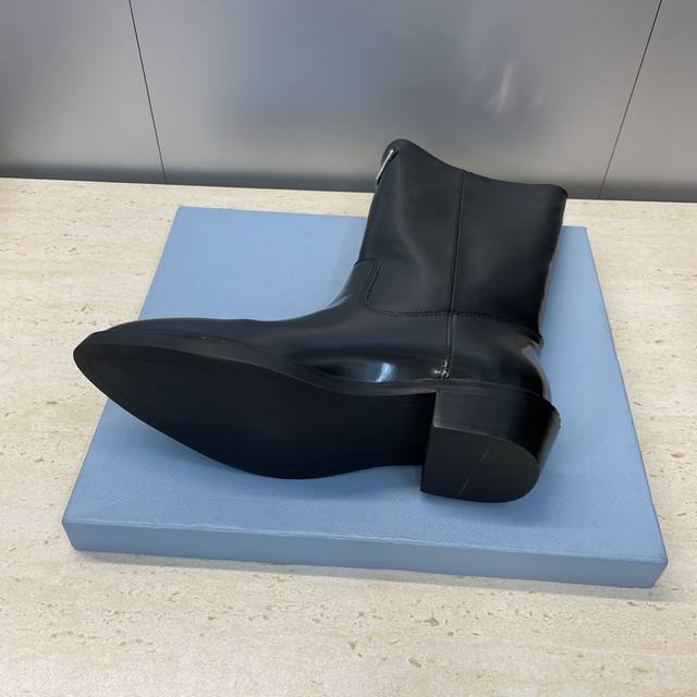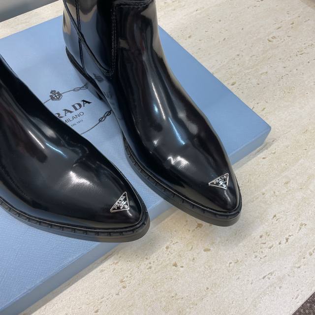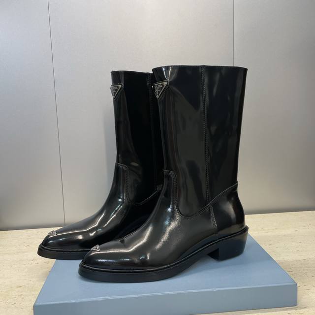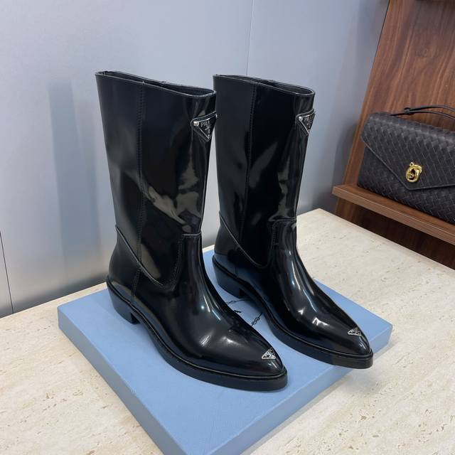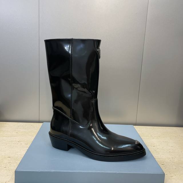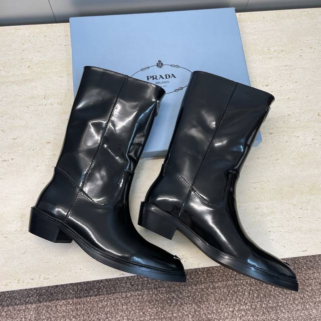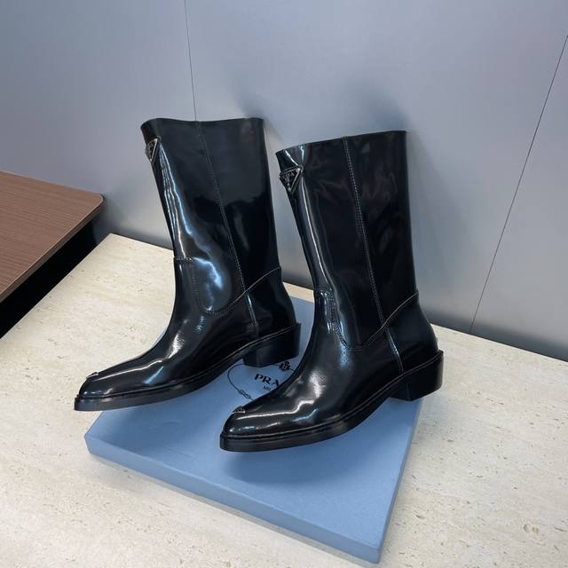 Factory Price Prada 2025 Autumn/Winter New Nomadic Style Mid-Calf Motorcycle Boots for Women, Celebrity Style, Low Heel, Pointed Toe, Iconic Letter Logo, Triangle Badge, Slip-on Martin Rider Boots, Top-Tier High-End Version. Material: Imported suede upper, imported calfskin, imported split-edge cowhide + water-dyed sheepskin lining + original molded outsole. Heel Height: 2.5cm. Size: 35-39, 40-41. Custom orders, no returns or exchanges.