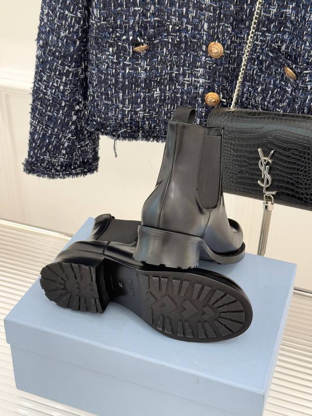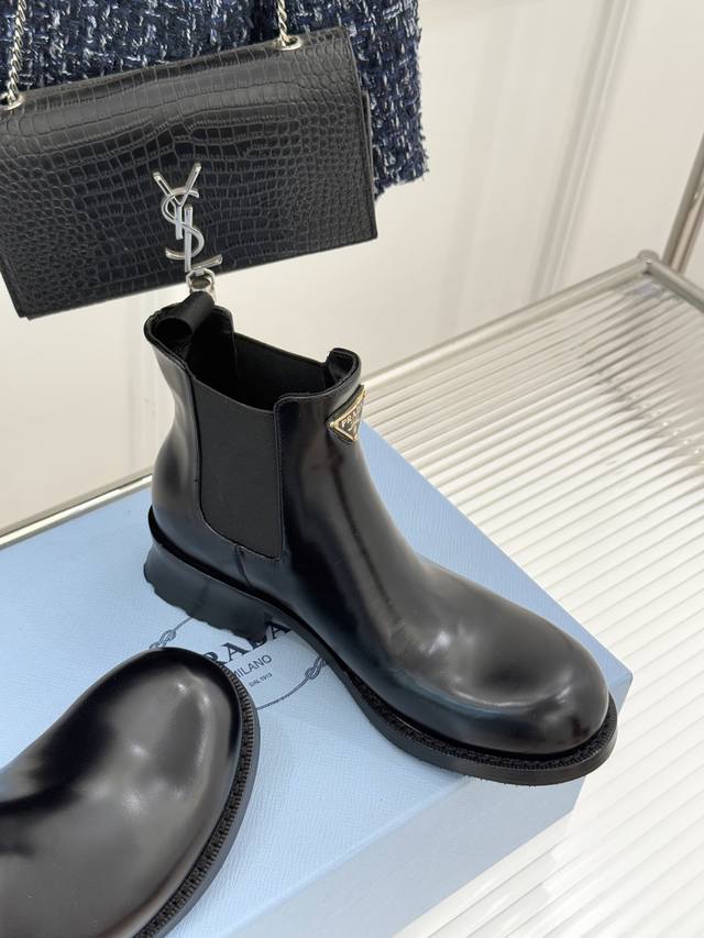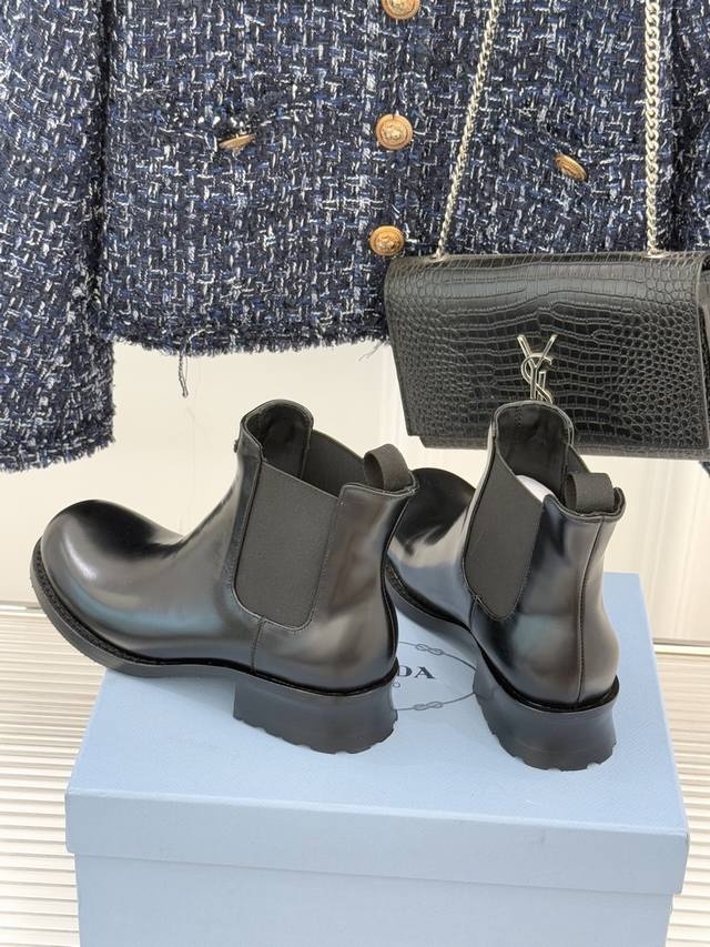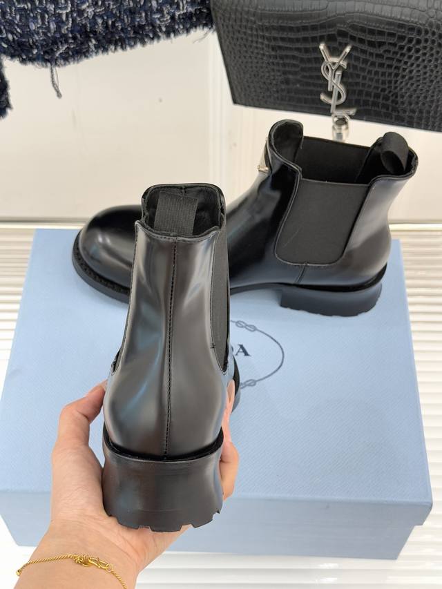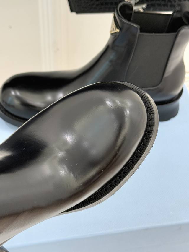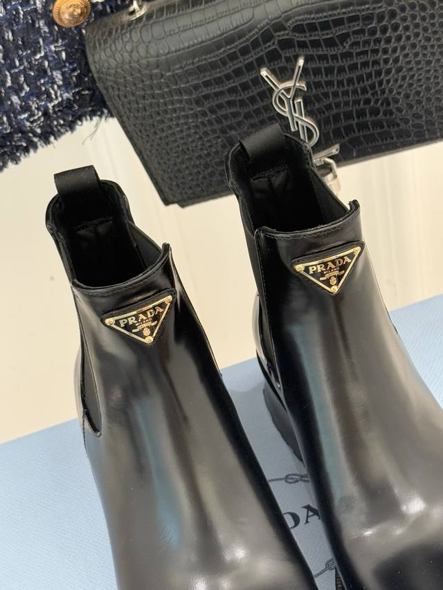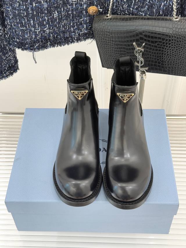 Factory Price Prada Classic Corner Logo Chelsea Chunky Heel Ankle Boots When the classic genes of Chelsea boots meet iconic aesthetics, these ankle boots become the style anchor for autumn and winter outfits, hiding the brand's design philosophy in every step. The soul of the shoe is undoubtedly the enamel metal triangle logo, where the warm luster and metallic texture collide, highlighting the brand's recognition with a minimalist symbol. The boot body is made of the iconic shiny split leather, and the 16cm boot height fits the ankle perfectly, looking both neat and flattering to the leg shape. The elastic pull tab on the side is a classic element of Chelsea boots, balancing ease of on and off with a comfortable fit. It is a style weapon that transcends occasions. Pair it with an oversized suit and a short skirt for a sophisticated urban professional look, or with a denim jacket and straight-leg pants for a casual and unrestrained street style, balancing a retro charm with softness and strength. From daily commutes to weekend strolls, the