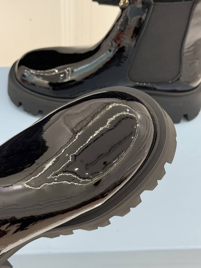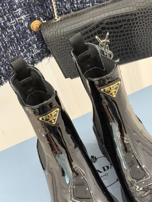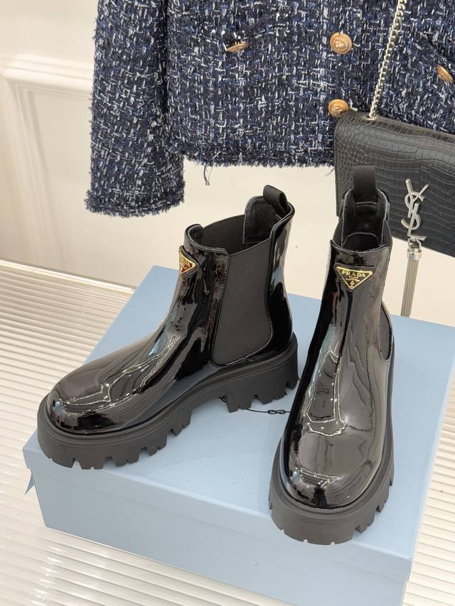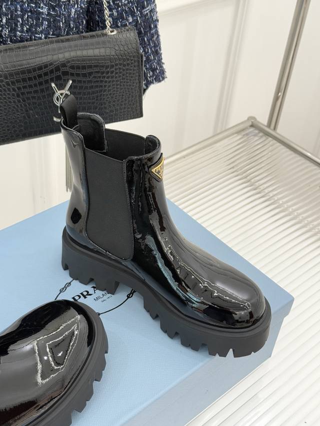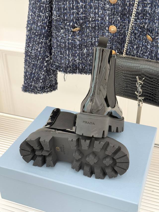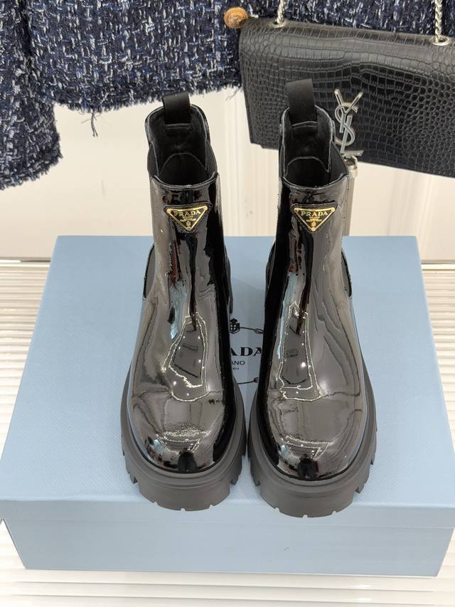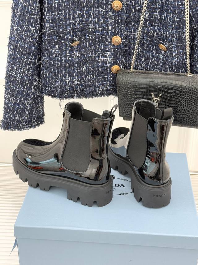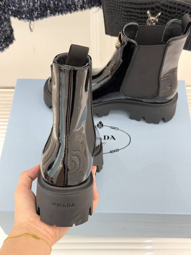 Factory Price DDD Prada Classic Triangle Logo Platform Chelsea Boots DDD The enamel metal triangle logo on the shoe body is an eye-catching detail DDD Since 1913, it has carried the brand's craftsmanship and innovative spirit DDD Subtly engraving the heritage of Prada Milano. DDD The 16cm sleek boot shaft outlines the ankle line DDD Selected fine calfskin is cut into a smooth silhouette DDD Elastic webbing on the side hides the convenience and casualness of putting it on and taking it off DDD The 5cm serrated platform sole is the visual focus DDD Walking is as smooth as walking on flat ground, yet it can subtly lengthen the proportions DDD It can be called a cheat-like height-enhancing weapon. DDD Whether paired with skinny jeans for a casual chic style DDD Or matched with suit pants and an oversized coat to unlock the commuting style DDD It can combine classic genes with modern design DDD Making every step an effortless fashion statement. DDD uses original custom calfskin upper; DDD features sheepskin lining and insoles; DDD uses original mold-made custom foam outsole; DDD Sizes: 35-39, 40, 41 (custom sizes available).