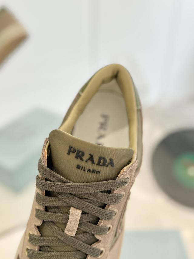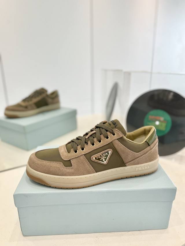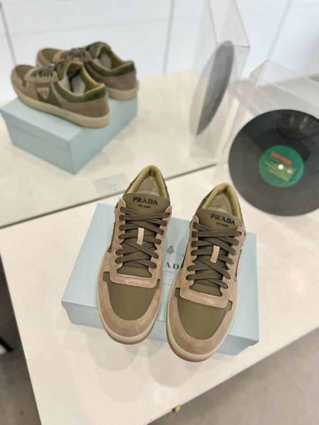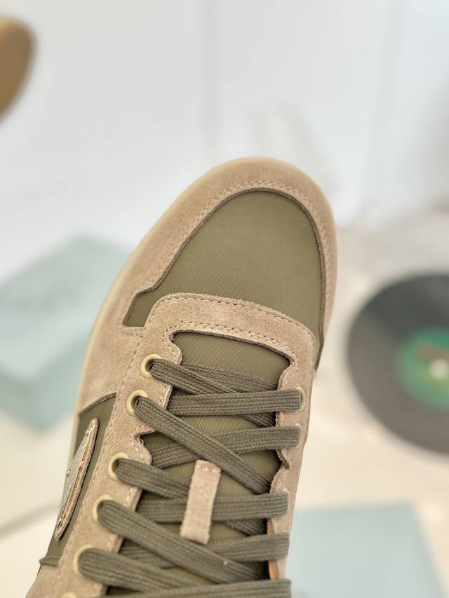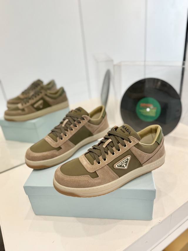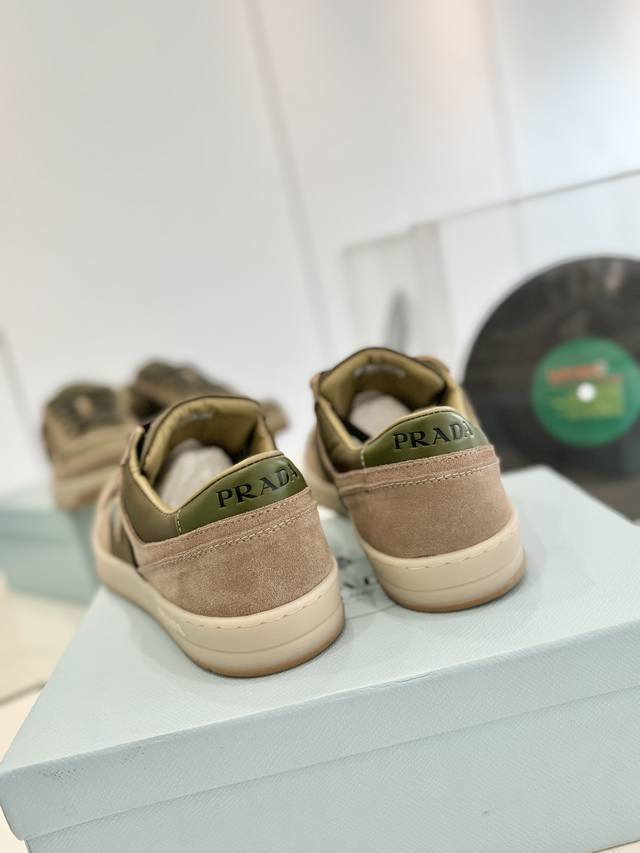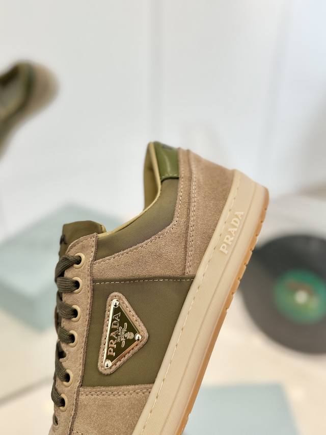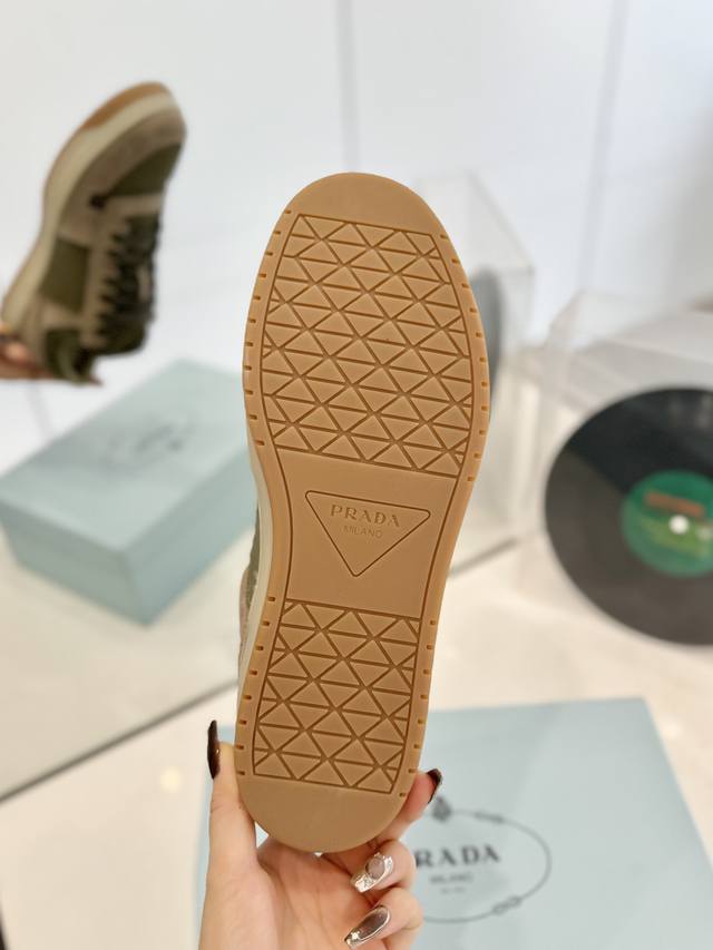 Factory Price: Prada. These high-top sneakers feature a contemporary, sporty design with clean lines and a lightweight sole. The Prada logo, reinterpreted from various angles and adorned with the iconic enameled metal triangle, exudes a unique, classic appeal. Upper embellished with enameled metal triangles. Tongue embossed with Prada. Fabric: Imported premium calfskin. Lining: Imported cowhide. Foot: Cowhide. Sizes: 35-45.
