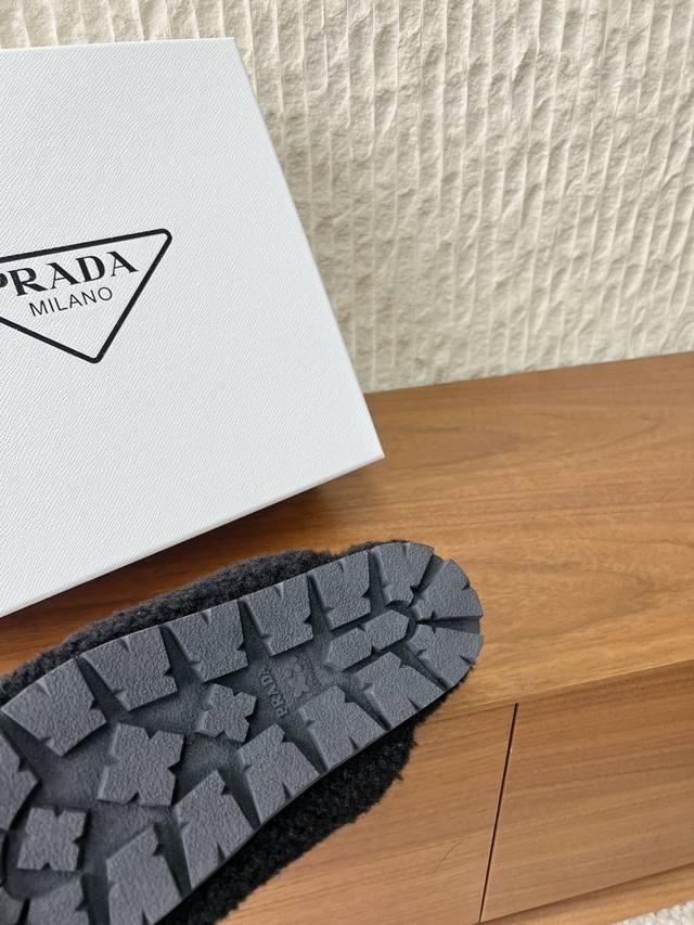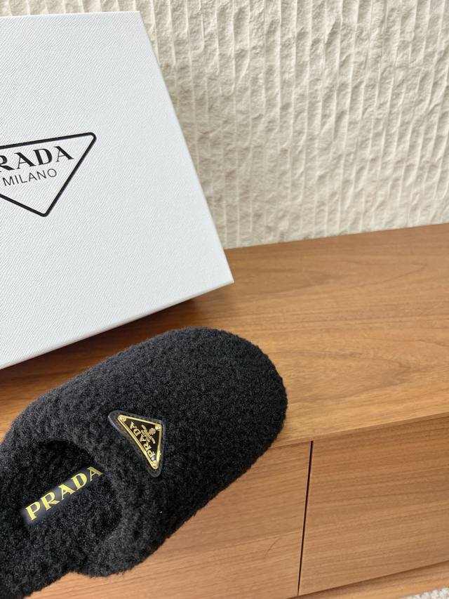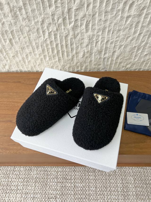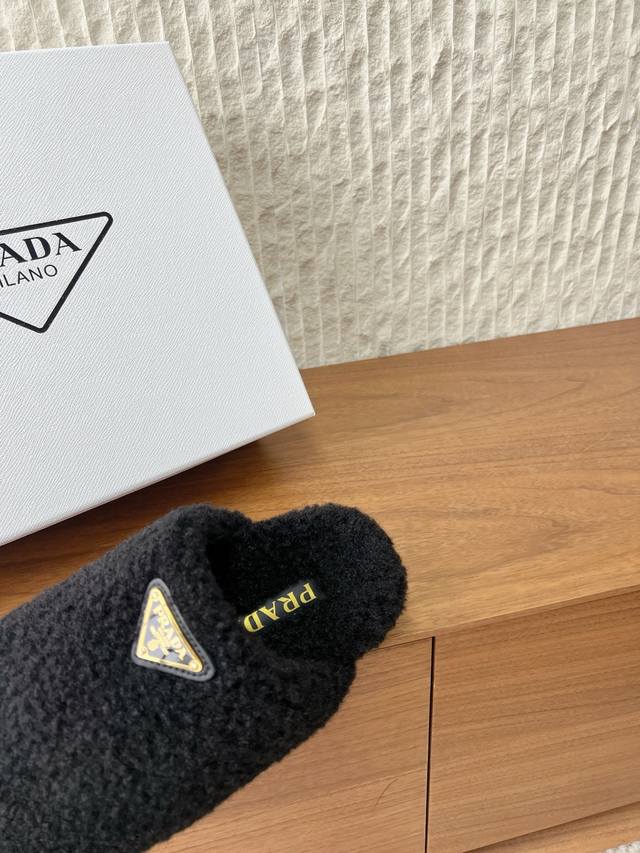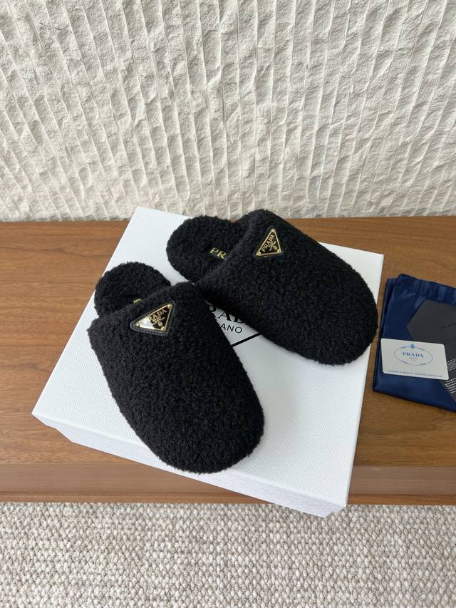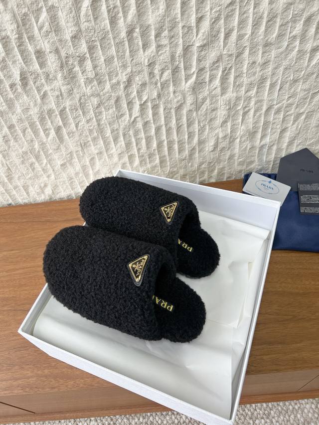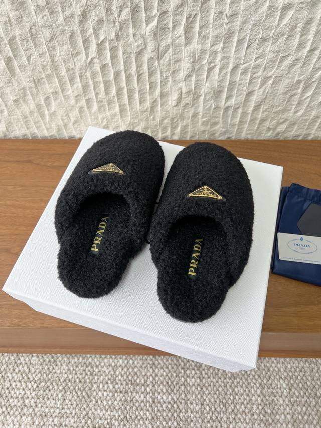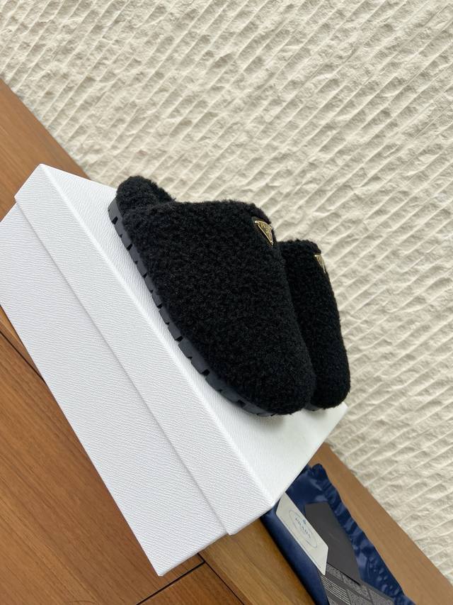 G292 Prada 25Ss Autumn/Winter New Triangle Buckle Furry Slippers for Women. This new platform slipper series has been incredibly popular in European and American street style photos and has also become a hit on Instagram. The last was adjusted for a month to maintain the smooth lines consistent with the original. It's truly captivating, and I believe discerning women will love it. Prada's A series never disappoints; a must-have for goddesses! Material: Original custom-made wool fabric. Lining: Original custom-made wool fabric. Insole: Original custom-made wool fabric. Outsole: Original molded TPU injection molded sole. Sole thickness: 1.0cm. Sizes: 35-39, 40, 41. Custom orders are non-refundable. Packaging: Original full packaging.