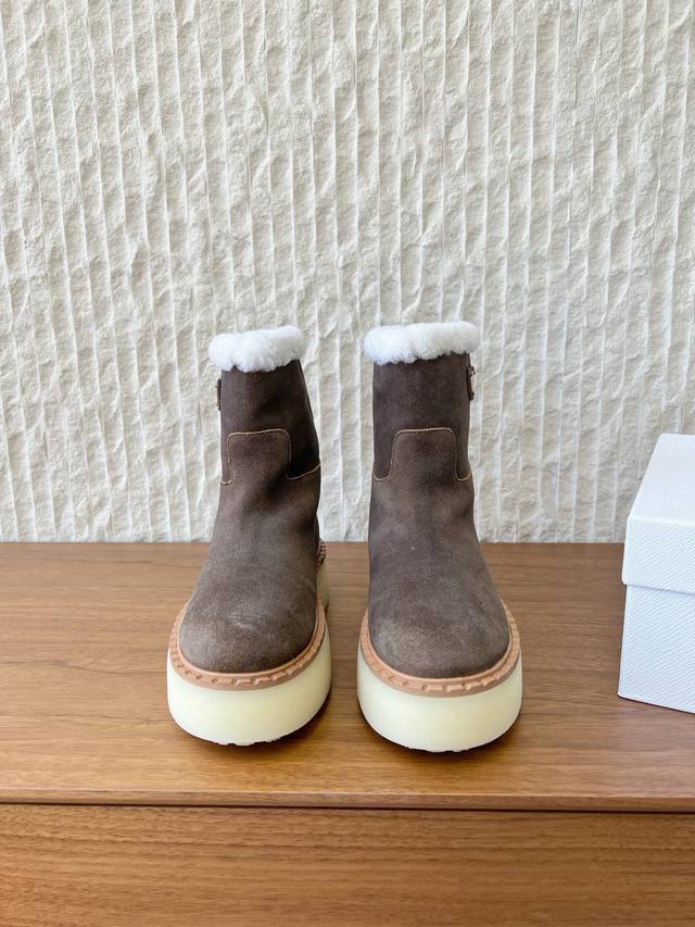 G292 Prada 25Ss Autumn/Winter New Triangle Buckle Thick-Soled Fur-Lined Short Boots for Women. This new thick-soled series has been incredibly popular in European and American street style photos and has also become a hit on Instagram. The shoe last was adjusted for a month to maintain the overall smooth lines consistent with the original. It's truly captivating, and I believe discerning women will love it. Prada's A series never disappoints; a must-have for goddesses! Material: Original custom-made cowhide suede. Lining: Original custom-made lamb's wool. Insole: Original custom-made lamb's wool. Outsole: Original molded TPU injection-molded sole with genuine leather welt. Sole thickness: 4cm. Sizes: 35-39. 40.41. Custom orders are non-refundable. Packaging: Original full packaging.