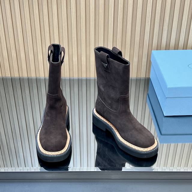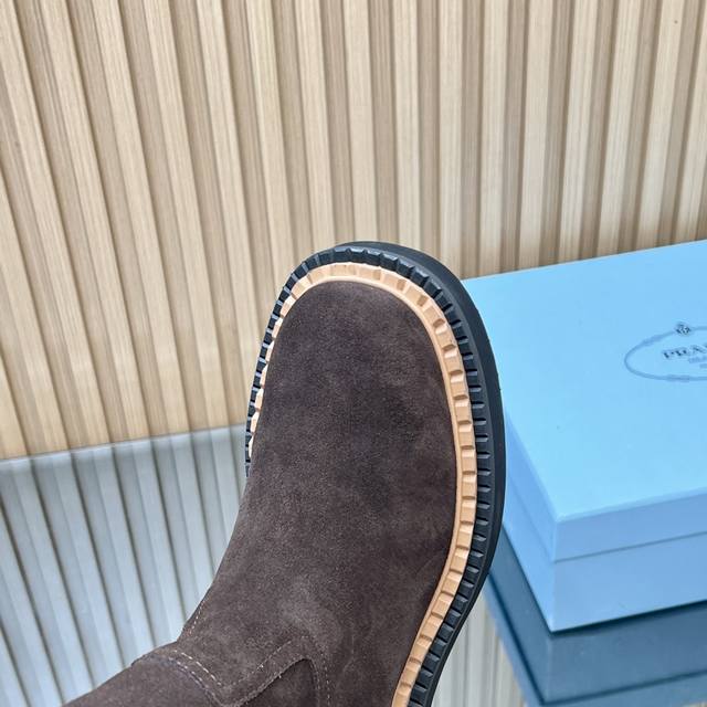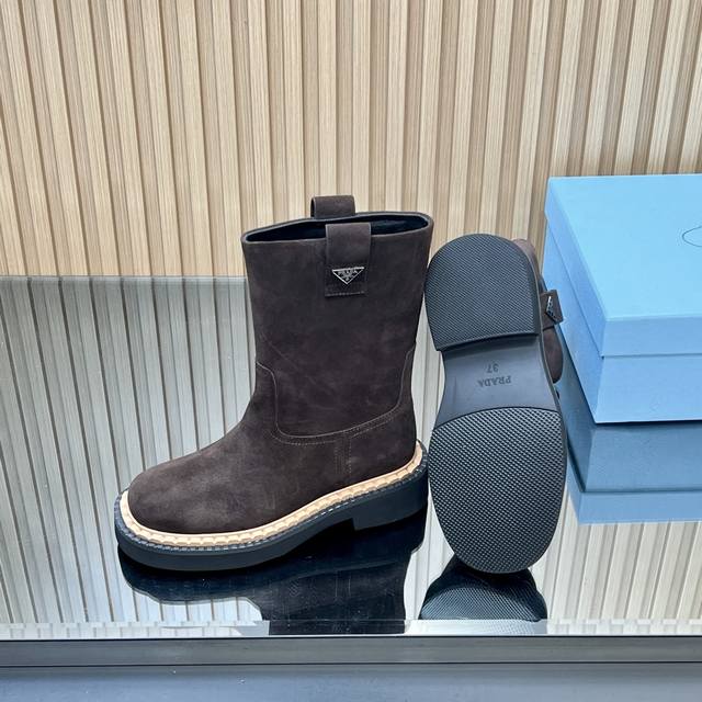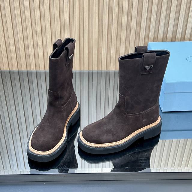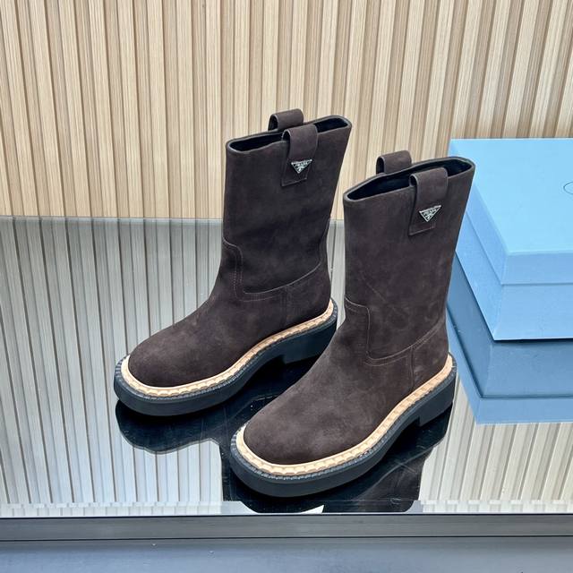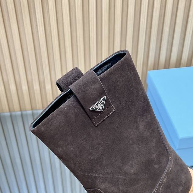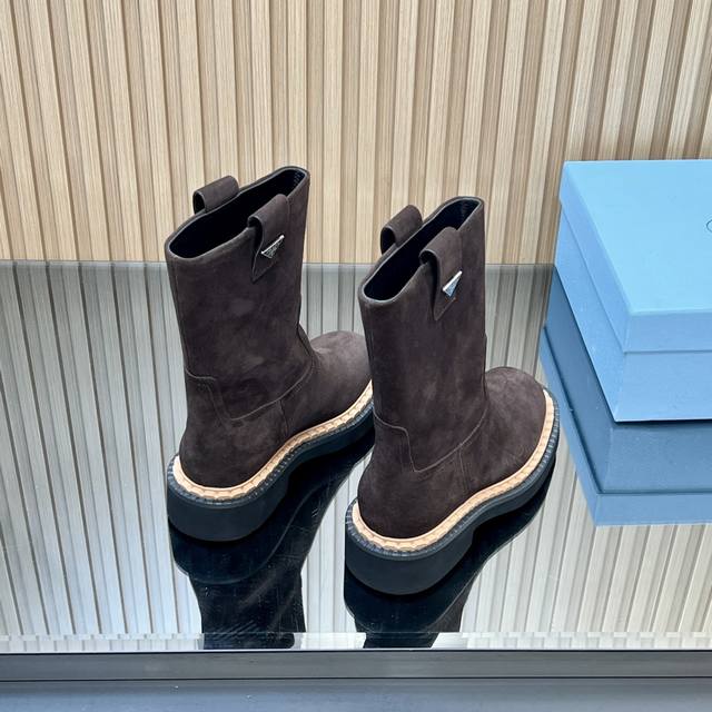25Ss new Prada triangle logo lace-up boots. These leather lace-up boots capture the essence of contemporary design with a sleek, three-dimensional silhouette. The sleek shape and metal lettering logo create a distinct personality.