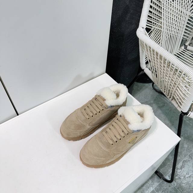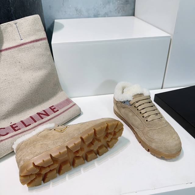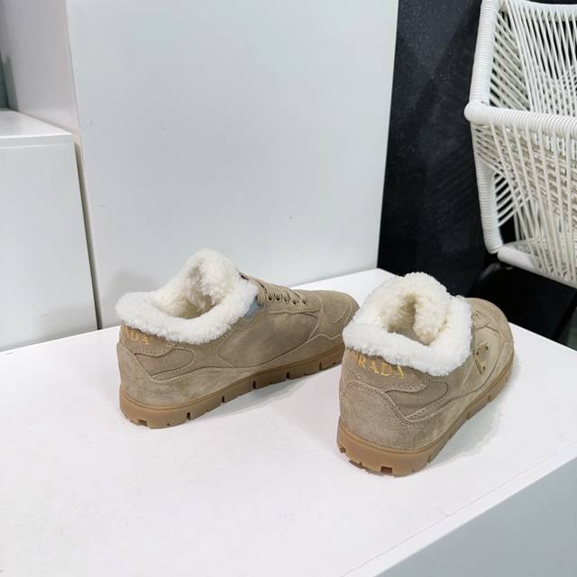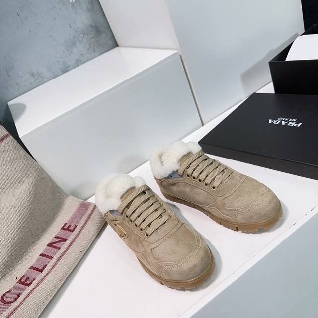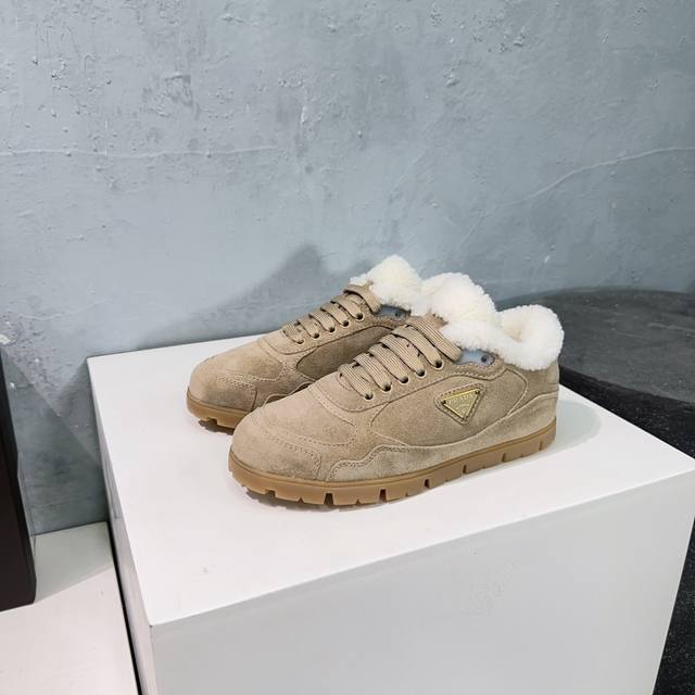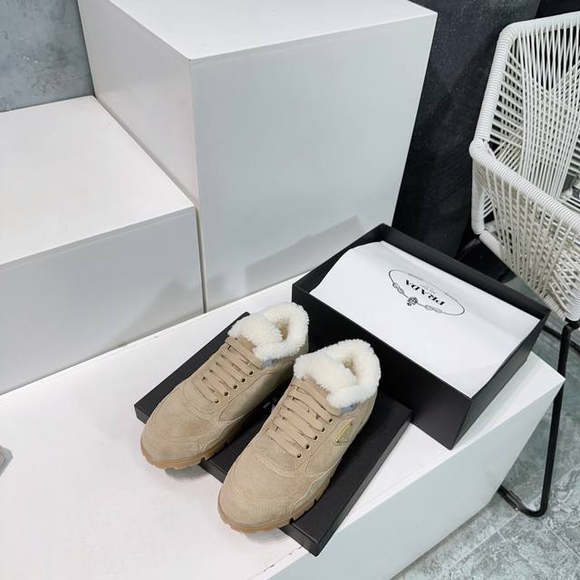 High-quality factory! Top-quality Prada 2025 Autumn/Winter new casual furry shoes, Forrest Gump shoes, German training shoes! Super cool retro style suede upper, vintage distressed finish, classic triangle buckle, high-end look, easy to match, very lightweight and comfortable, guaranteed imported wool lining, warm and versatile! Original cow suede upper, imported guaranteed lamb wool insole, original molded rubber anti-slip outsole. Sizes: 35-40. Size 40 is custom-made and non-refundable. Comes with original packaging.