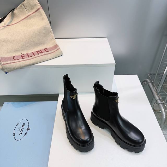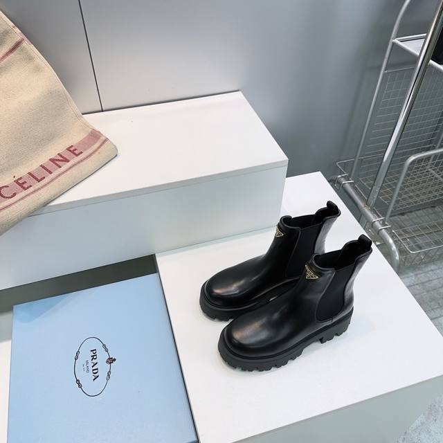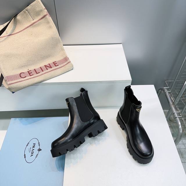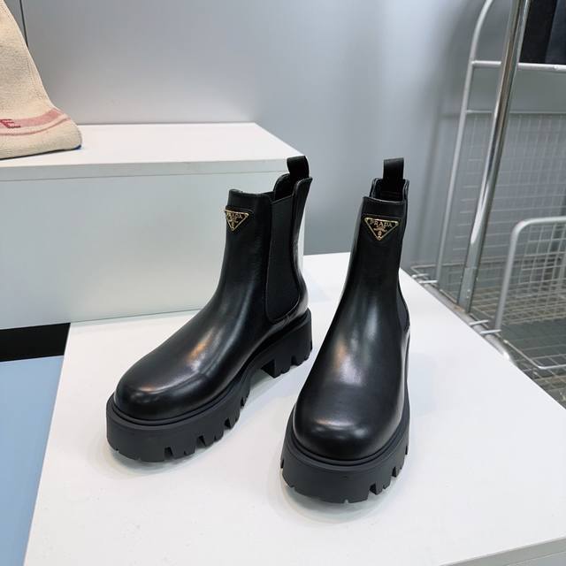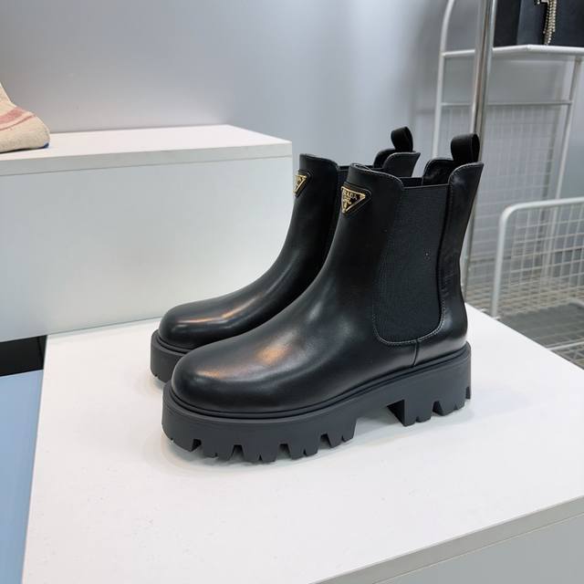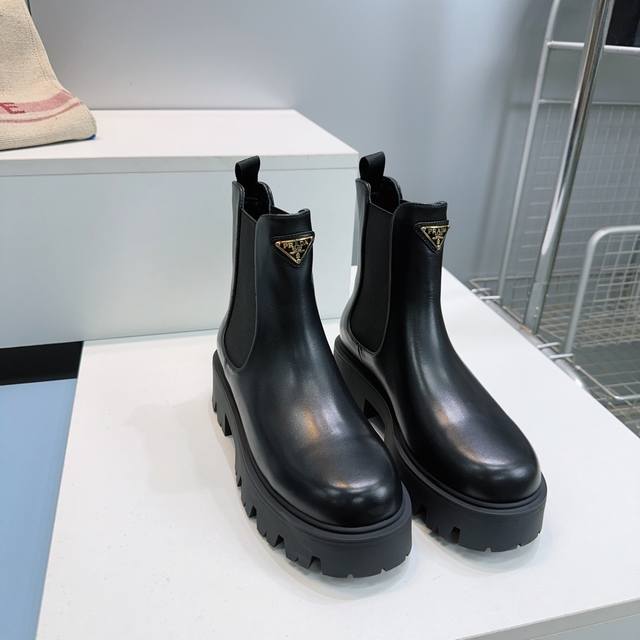 High-quality factory! Top-quality Prada 25Ss Fall/Winter new classic triangle logo simple platform round toe ankle boots! Elastic slip-on ankle boots! The classic triangle logo buckle is like a key to time, opening the door to a fusion of retro and modern styles. The luster of the metal buckle and the texture of the leather complement each other; every texture and every snap tells of Prada's unwavering pursuit of exquisite craftsmanship. The boots' silhouette cleverly blends past elegance with present individuality, bearing the marks of time, seemingly telling a fashion story. The clean, simple lines give them a modern, sleek look, making every step exude unique charm. Whether paired with a retro-style dress or casual jeans, they become the finishing touch, allowing you to express your unique style on the fashion stage and become the focus of attention!