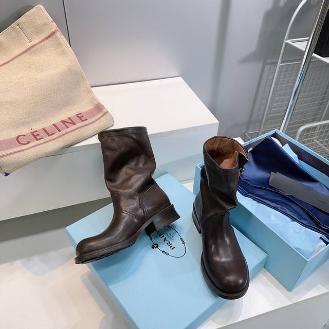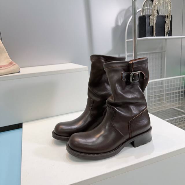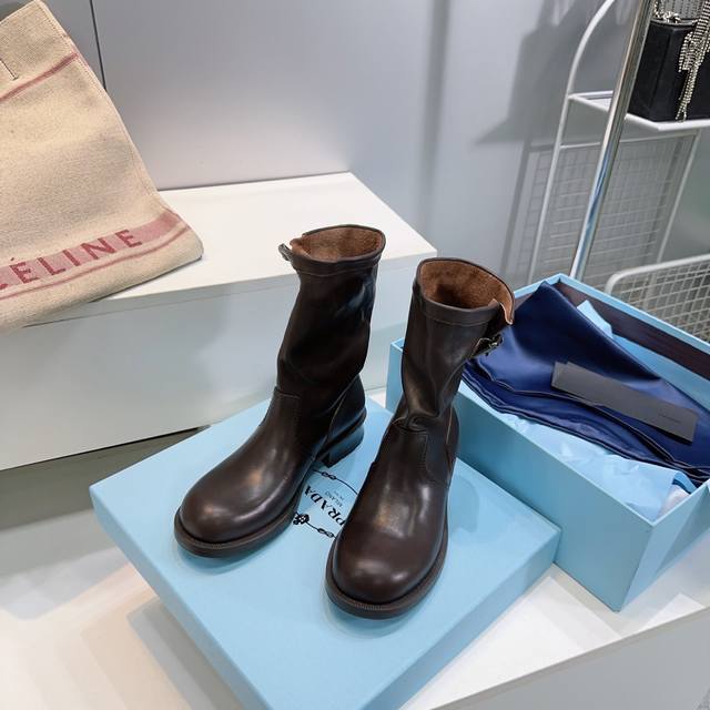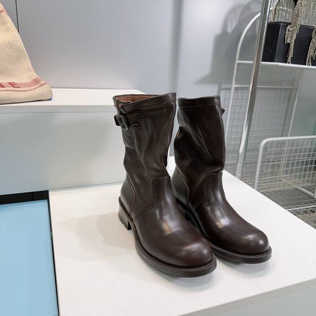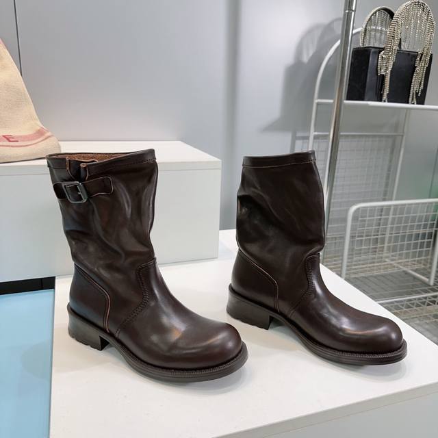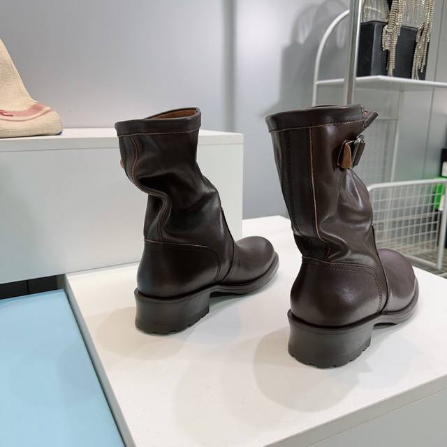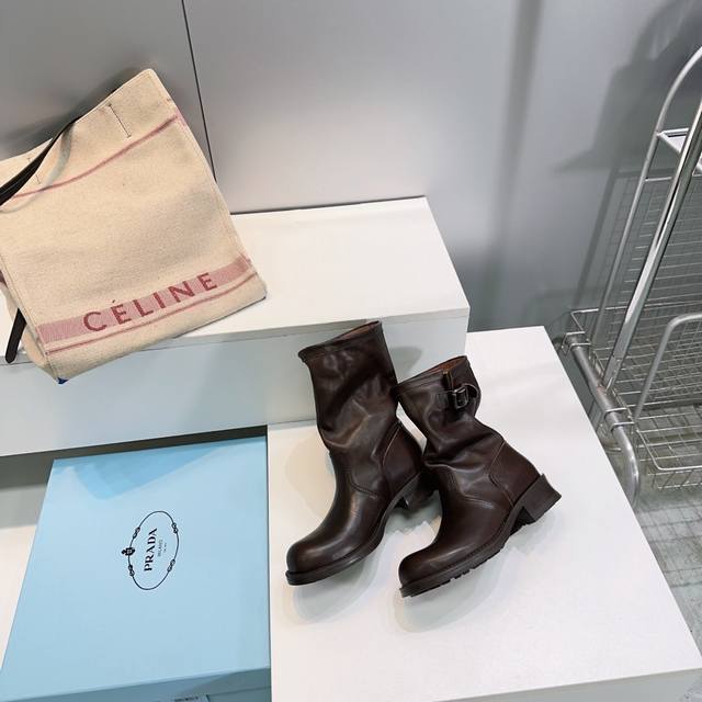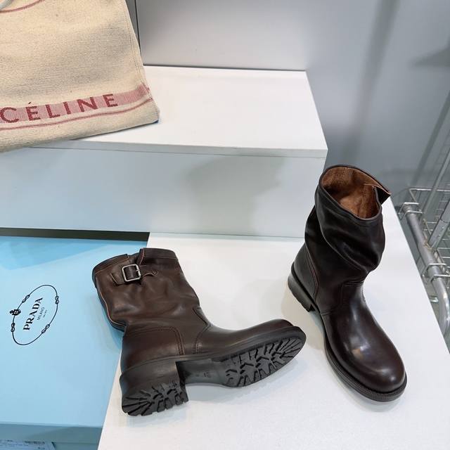 High-quality factory! Top-quality Prada 25Ss Fall/Winter New Wide-Cuff Wrinkled Leather Buckle Retro Slip-on Mid-Calf Ankle Boots! The classic leather buckle design is like a key to time, opening the door to a fusion of retro and modern styles. The luster of the metal buckle complements the texture of the leather; every texture and every buckle tells of Prada's unwavering pursuit of exquisite craftsmanship. The boot's silhouette cleverly blends past elegance with contemporary individuality. The distressed leather carries the marks of time, seemingly telling a story of fashion, while the clean, crisp lines give it a modern, sleek silhouette, making every step exude unique charm. Whether paired with a retro-style dress or casual jeans, it becomes the perfect finishing touch, allowing you to express your unique style on the fashion stage and become the focus of attention!