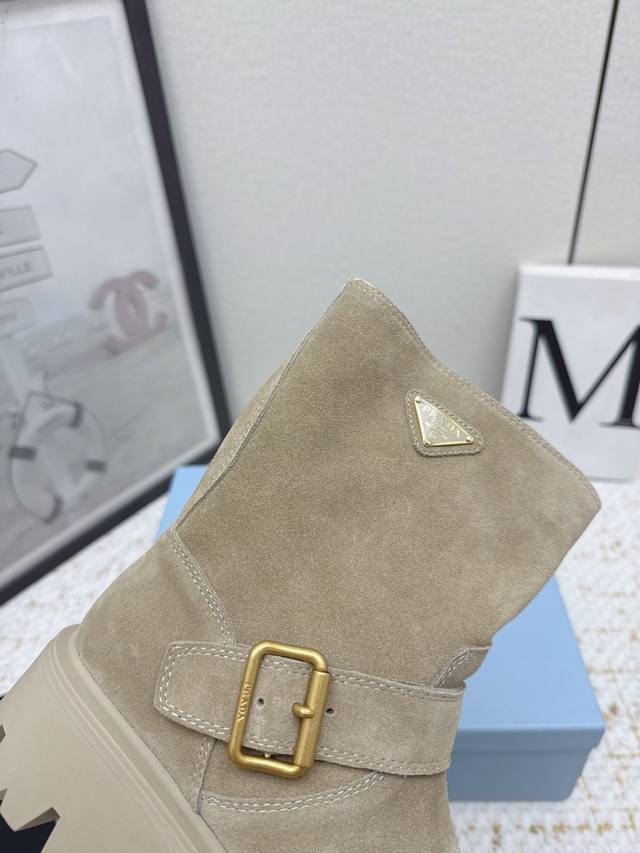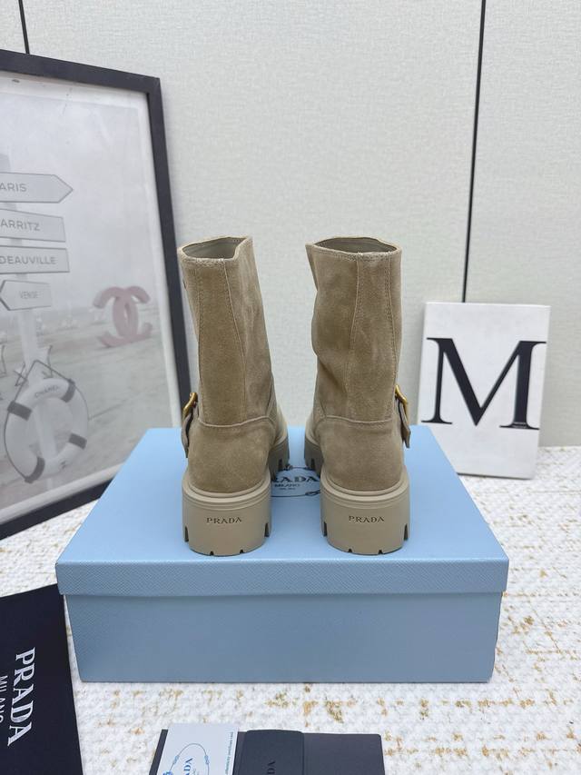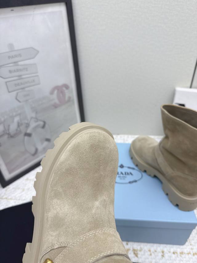 High-quality factory-made Prad 2026 Fall/Winter classic riding boots. These boots look amazing on and elongate the legs. Unlike the many inferior products on the market, this one features a genuine leather outsole. I personally disassembled and re-molded the original outsole for comparison. Comfort and texture are guaranteed. Material: Original suede cowhide. Lining: Imported cowhide lining. Outsole: Original sole. Size: 35-39 [40.41 - custom-made, no returns or exchanges].