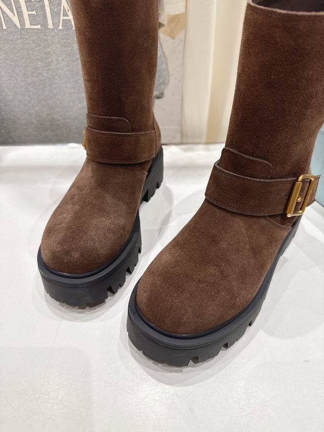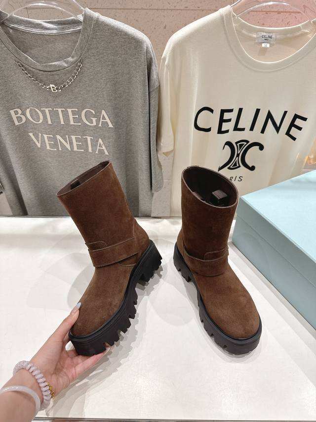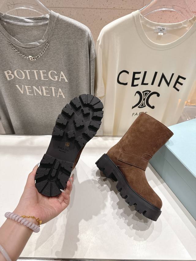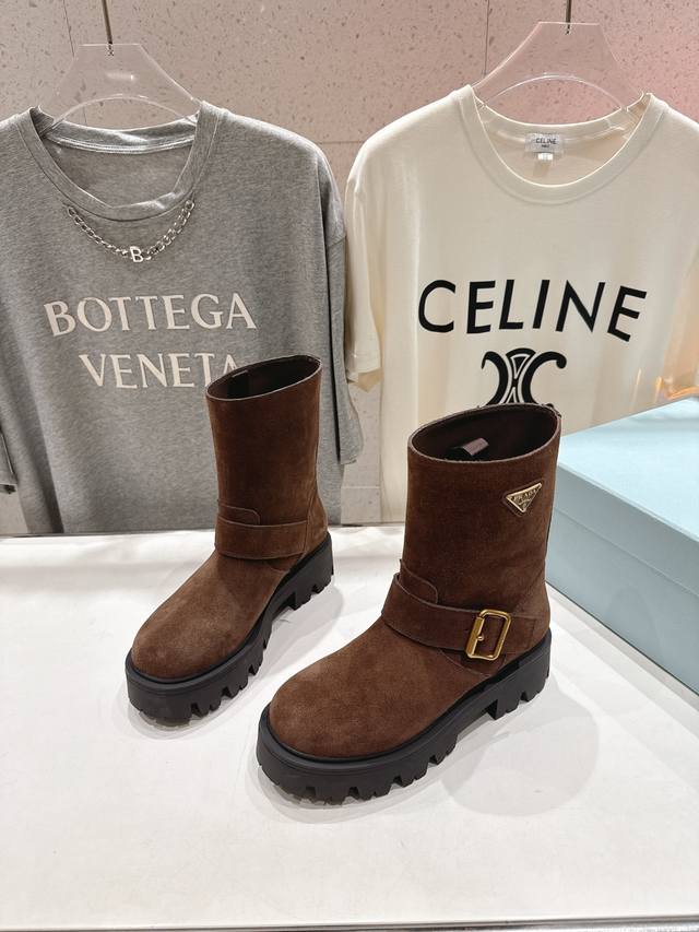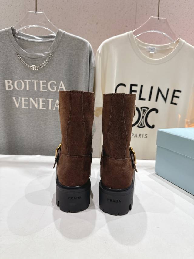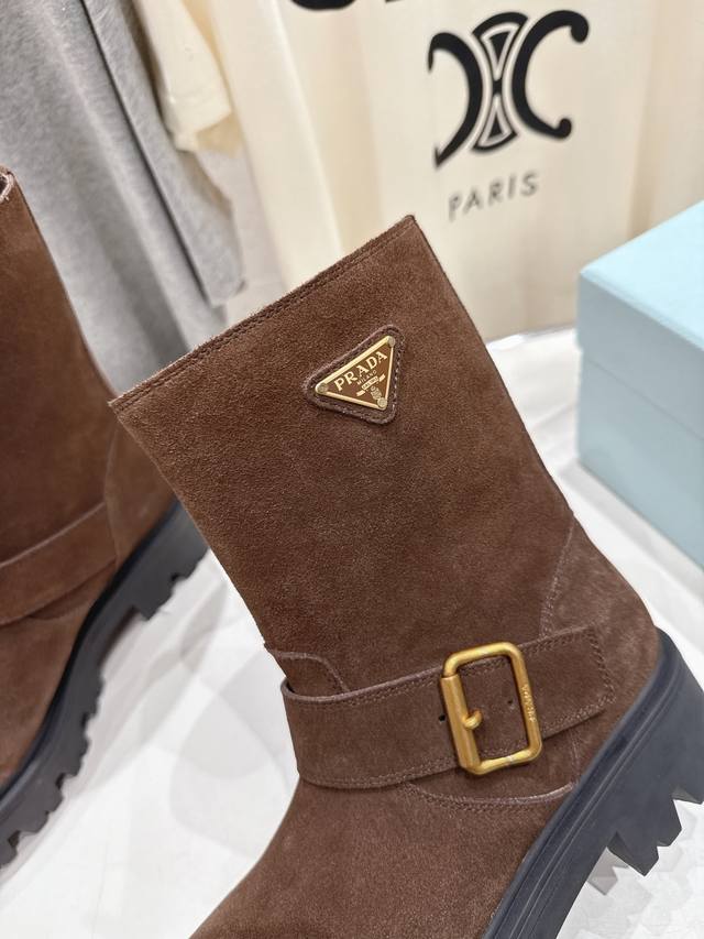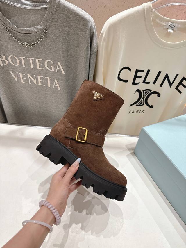 High-quality factory-made Prada F034 2025Ss latest triangle buckle thick-soled mid-calf Martin boots. A very stylish and timeless design. Original replica of the runway style mid-calf boots, super classic and versatile, incredibly durable and stylish, a leg-slimming wonder, simple and elegant. Upper: Imported high-gloss suede, waxed and colored calfskin. Lining: Silk cowhide. Outsole: Original molded outsole. Sizes: 35-40. 40.41 Made to order, no returns or exchanges.
