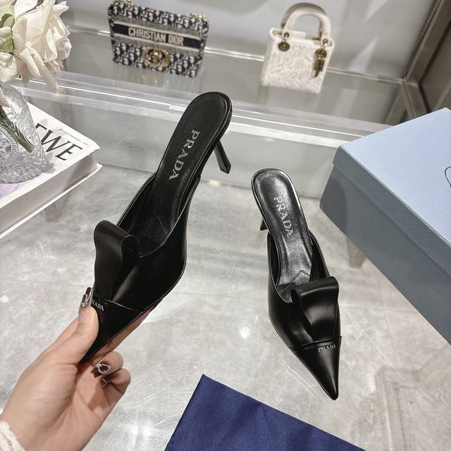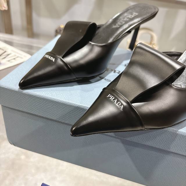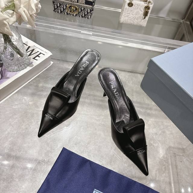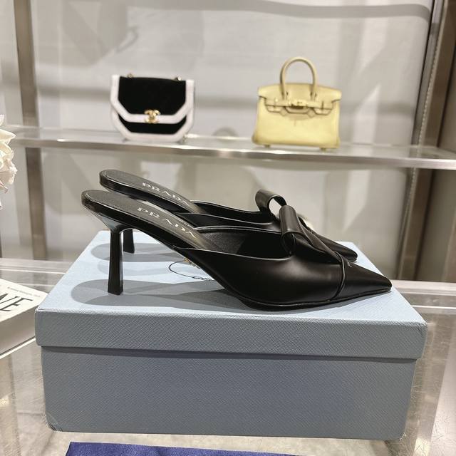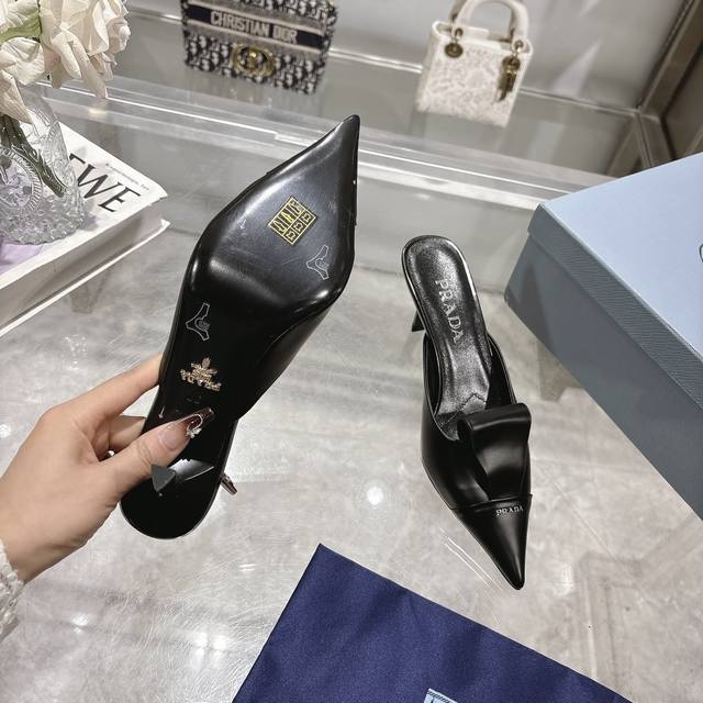 High-quality factory-made Prada Mary Jane pointed-toe high heels, Spring/Summer 2023. Original purchase, 1:1 replica, perfect details, comfortable to wear, easily paired with any spring/summer outfit. Exquisite and durable. Upper: Original split-edge cowhide. Lining: Sheepskin. Outsole: Italian genuine leather. Heel height: 5.5cm, 7.5cm. Sizes: 35-40, 41 (made-to-order, no returns or exchanges). Packaging: Original full packaging.