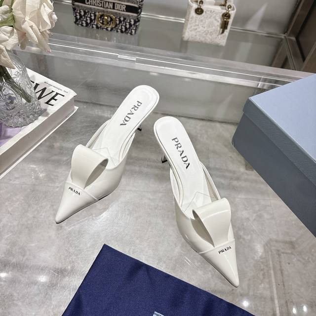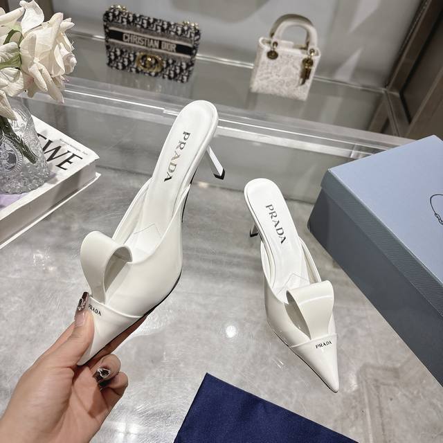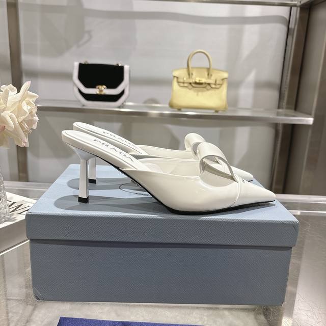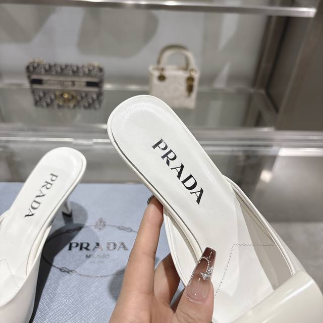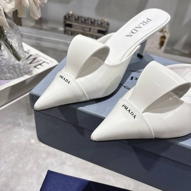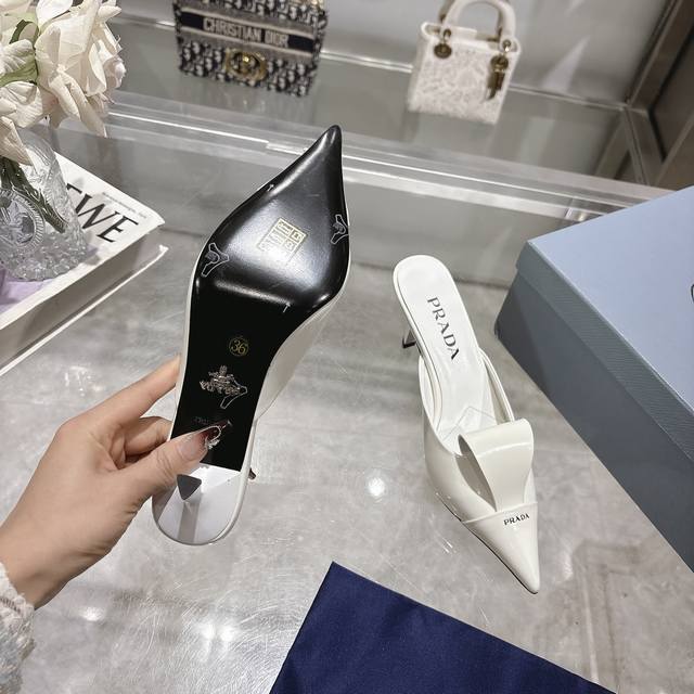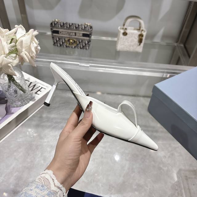 High-quality factory-made Prada Mary Jane pointed-toe high heels, Spring/Summer 2023. Original purchase, 1:1 replica, perfect details, comfortable to wear, easily paired with any spring/summer outfit. Exquisite and durable. Upper: Original split-edge cowhide. Lining: Sheepskin. Outsole: Italian genuine leather. Heel height: 5.5cm, 7.5cm. Sizes: 35-40, 41 (made-to-order, no returns or exchanges). Packaging: Original full packaging.