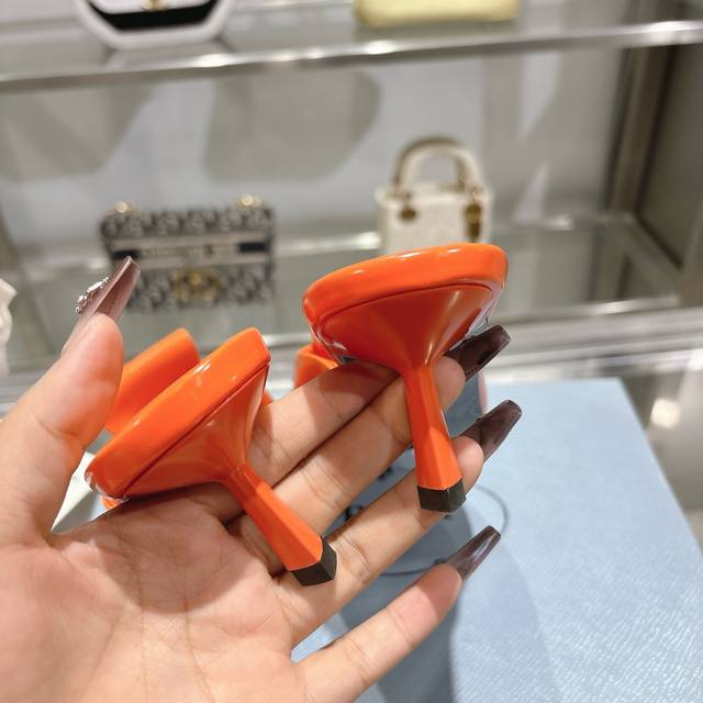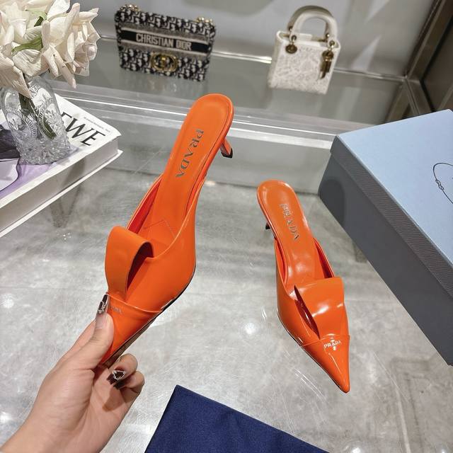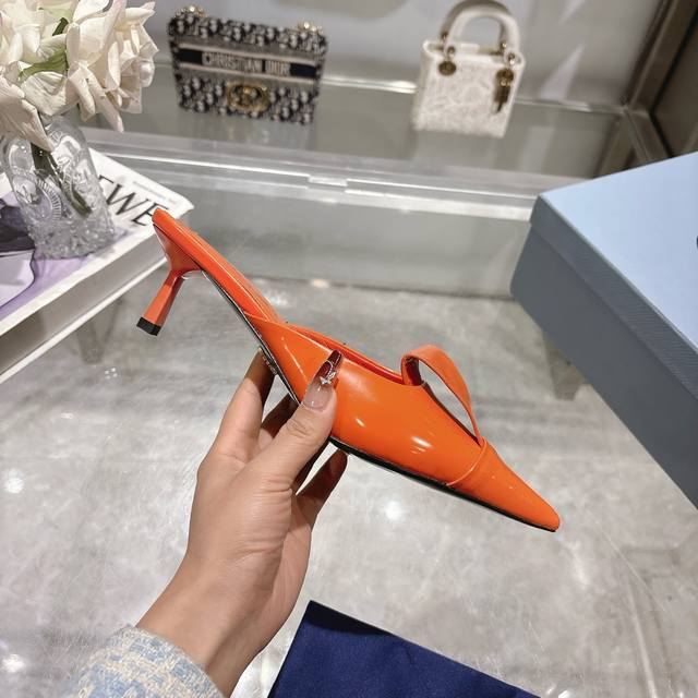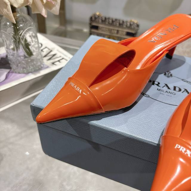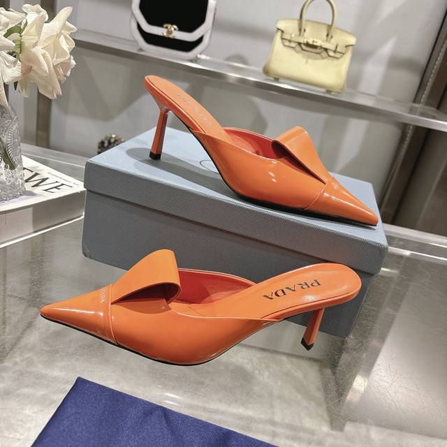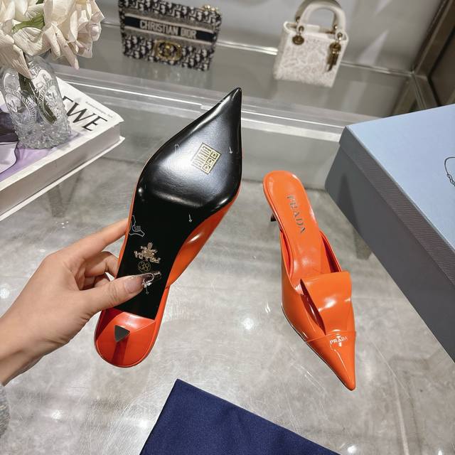 High-quality factory-made Prada Mary Jane pointed-toe high heels, Spring/Summer 2023. Original purchase, 1:1 replica, perfect details, comfortable to wear, easily paired with any spring/summer outfit. Exquisite and durable. Upper: Original split-edge cowhide. Lining: Sheepskin. Outsole: Italian genuine leather. Heel height: 5.5cm, 7.5cm. Sizes: 35-40, 41 (made-to-order, no returns or exchanges). Packaging: Original full packaging.