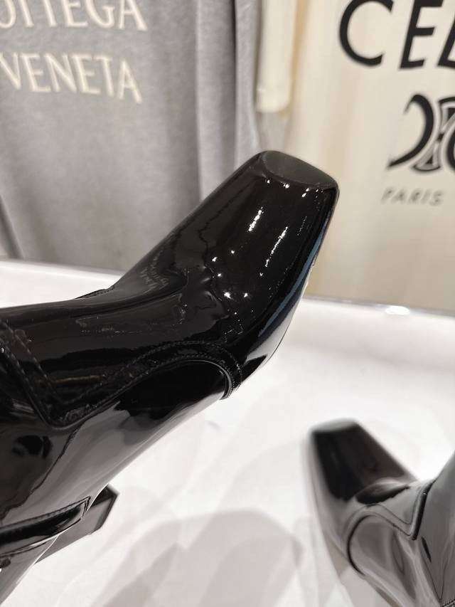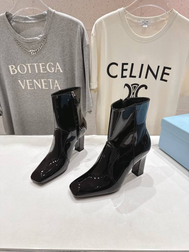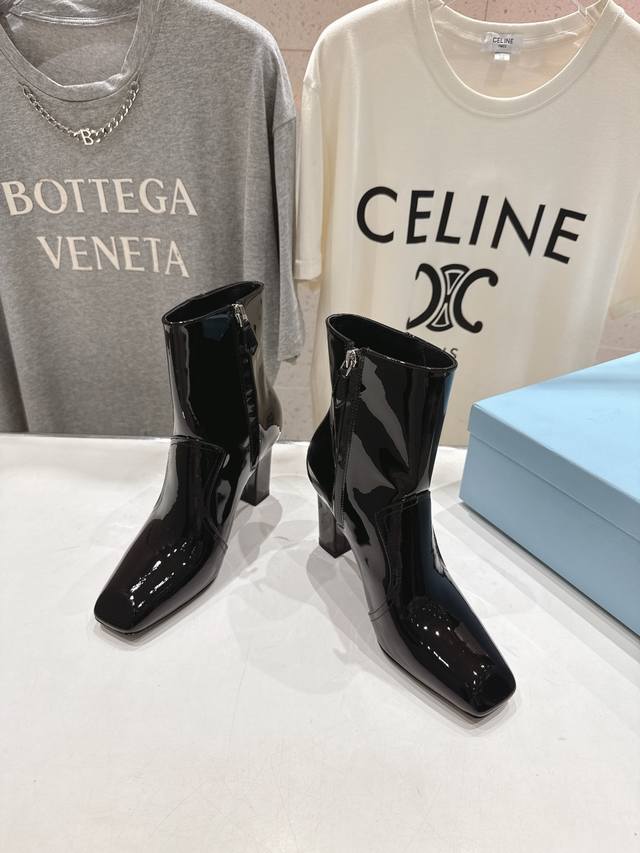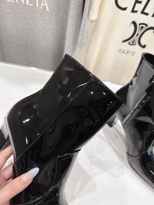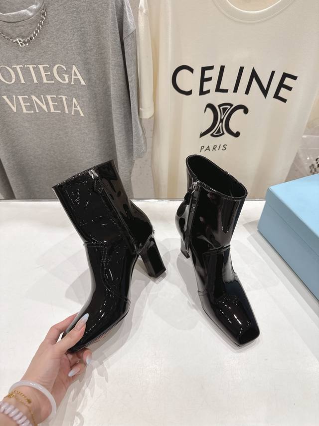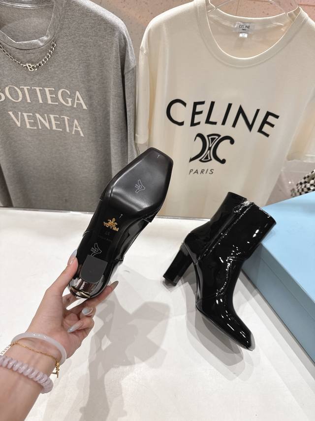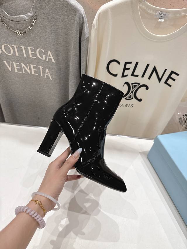 High-quality factory-released Prada F025 2025Ss Fall/Winter new arrival, triangular-buckle Chelsea high-heeled ankle boots. A stylish and versatile item, now exclusively available. Developed through Italian counter purchasing, this authentic, 1:1 replica is a faithful reproduction. This year's theme is to be undefined, showcasing quality through simplicity and conciseness. Upper: Imported open-edge pearlescent cowhide and patent leather. Lining: Imported sheepskin. Outsole: Imported Italian genuine leather. Heel height: 9cm. Sizes: 35-39, 40. Made to order, no returns or exchanges.