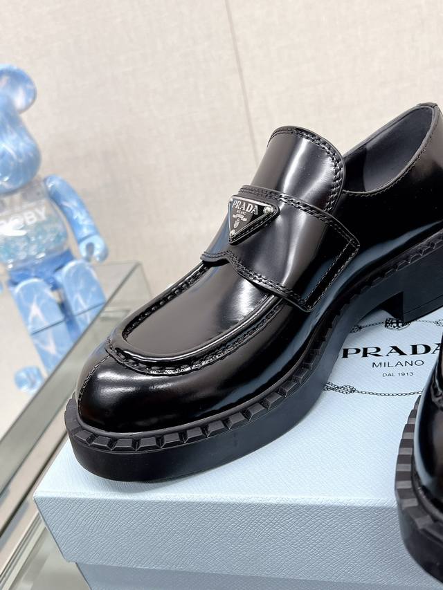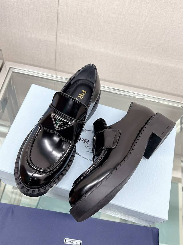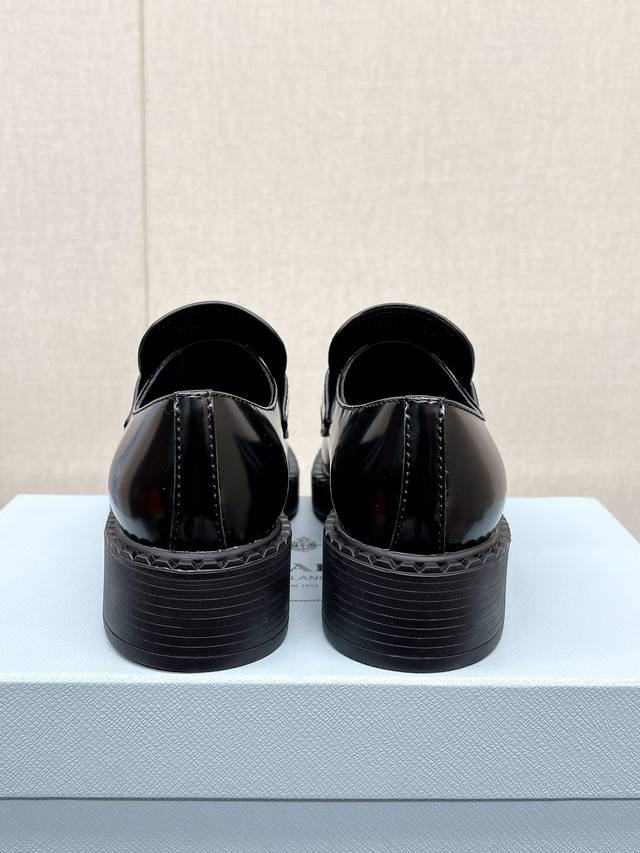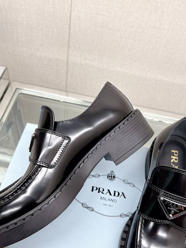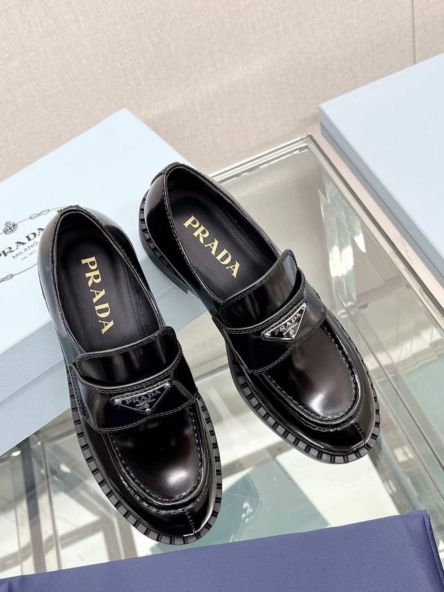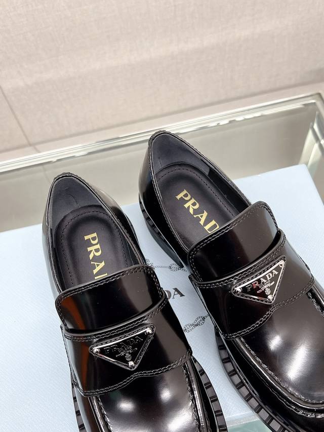 High-quality Prad* celebrity-endorsed triangular logo loafers. These shoes feature a distinctive round toe, a thick rubber sole that gives the classic loafer a modern look, and an enamel triangular metal logo that highlights the brand's style. Vintage glossy leather, typically used in fine footwear, is reinterpreted in the Prad* collection for a uniquely modern mixed-and-matched design. Upper: Split-edge cowhide; Lining: Cowhide lining; Outsole: Genuine leather welt with rubber sole; Sizes: 35-39; 40 (custom orders, no returns or exchanges).