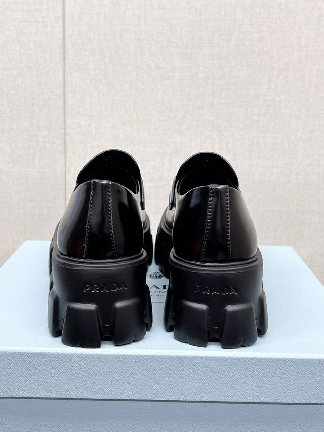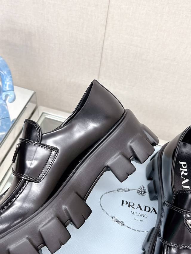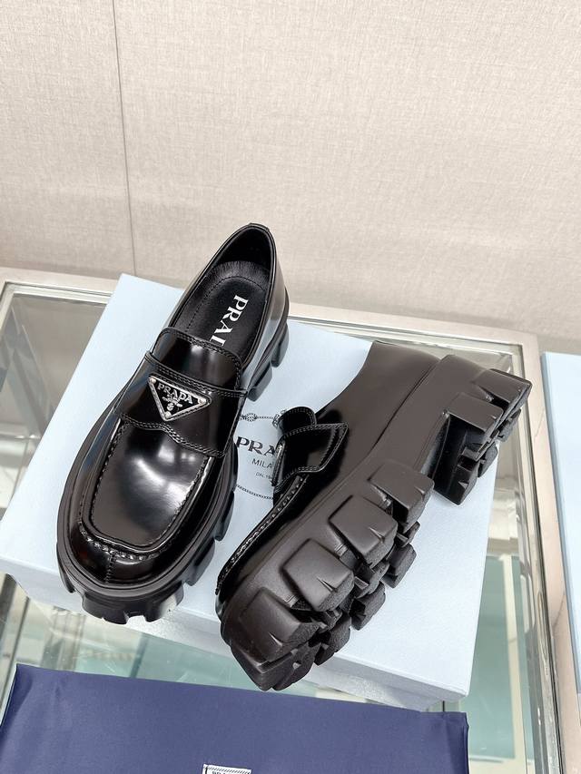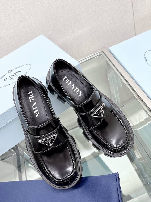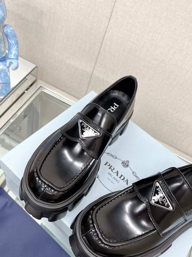 High-quality Prad* Triangle Buckle Platform Pointed-Toe Loafers