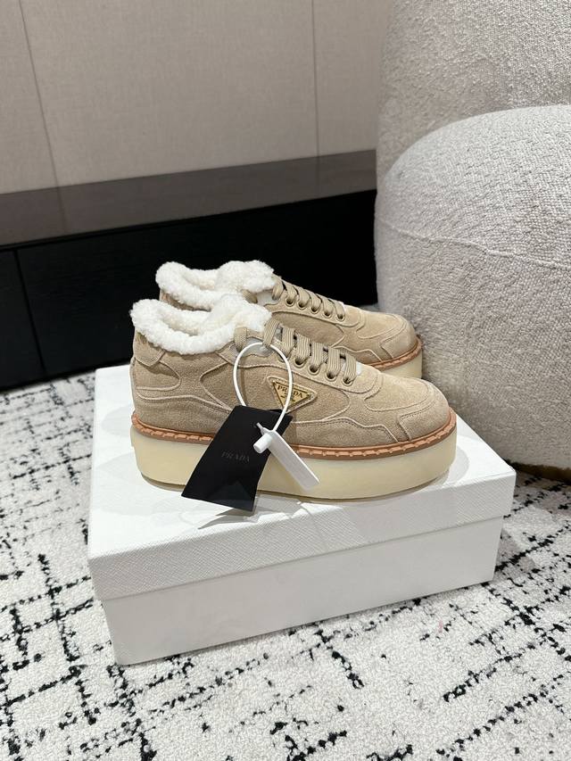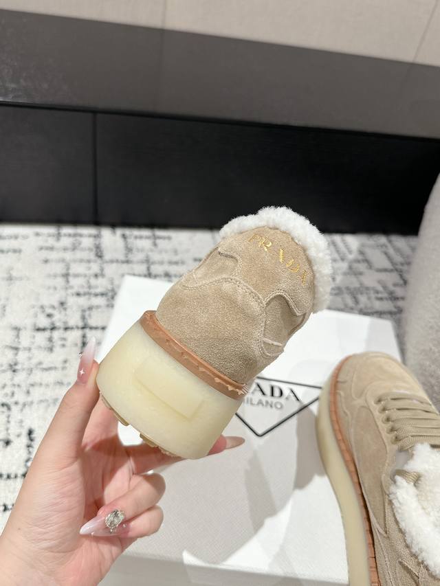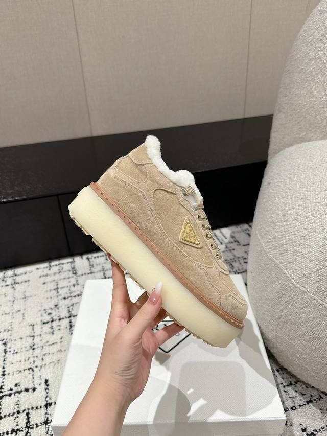 ). These sneakers maintain a timeless silhouette, a new classic piece crafted from premium suede for a stylish and lightweight look. Featuring a triangular buckle logo and a 5cm platform sole, they are suitable for all seasons and can be paired with various casual styles. In an era saturated with eye-catching styles, these boots offer enduring appeal and gradually win hearts. Material: Imported suede; Lining: Lambswool; Outsole: TPU non-slip outsole + genuine leather welt; Sole thickness: 5cm; Size: #35-41 (40, 41 are custom-made and non-refundable).