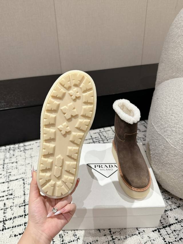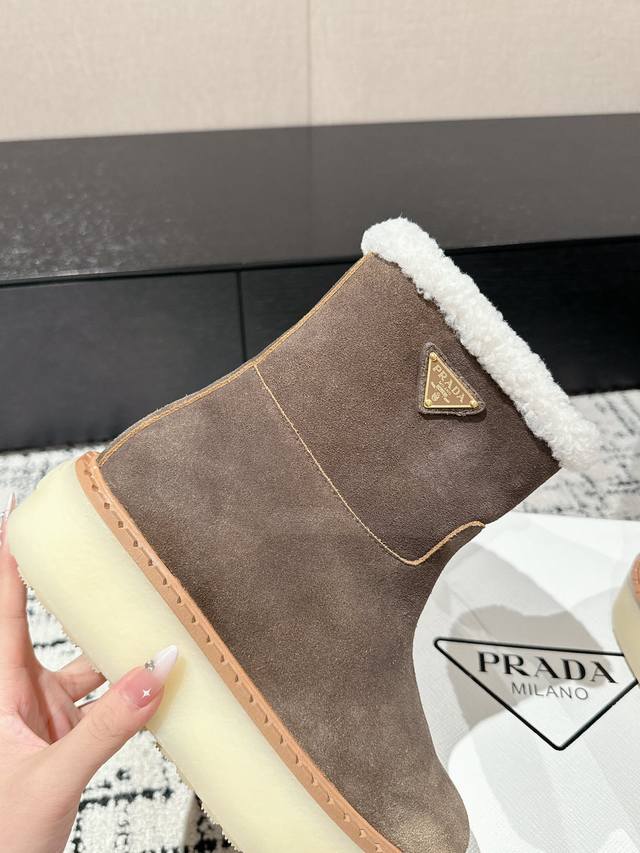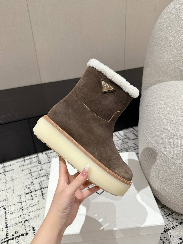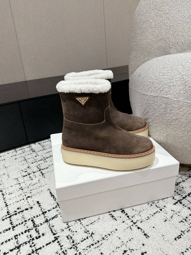 High-quality Prada 24 platform snow boots (retail import grade). These snow boots maintain a timeless silhouette, a new classic piece crafted from premium suede for a stylish and lightweight look. Featuring a triangular buckle logo and a 5cm platform sole, they are suitable for all seasons and can be paired with various casual styles. In an era saturated with eye-catching styles, these boots are a timeless classic that will captivate hearts with their enduring appeal. Material: Imported suede; Lining: Australian imported lamb's wool; Outsole: TPU non-slip outsole + genuine leather welt; Sole thickness: 5cm; Size: #35-41 (40, 41 are custom-made and non-refundable).