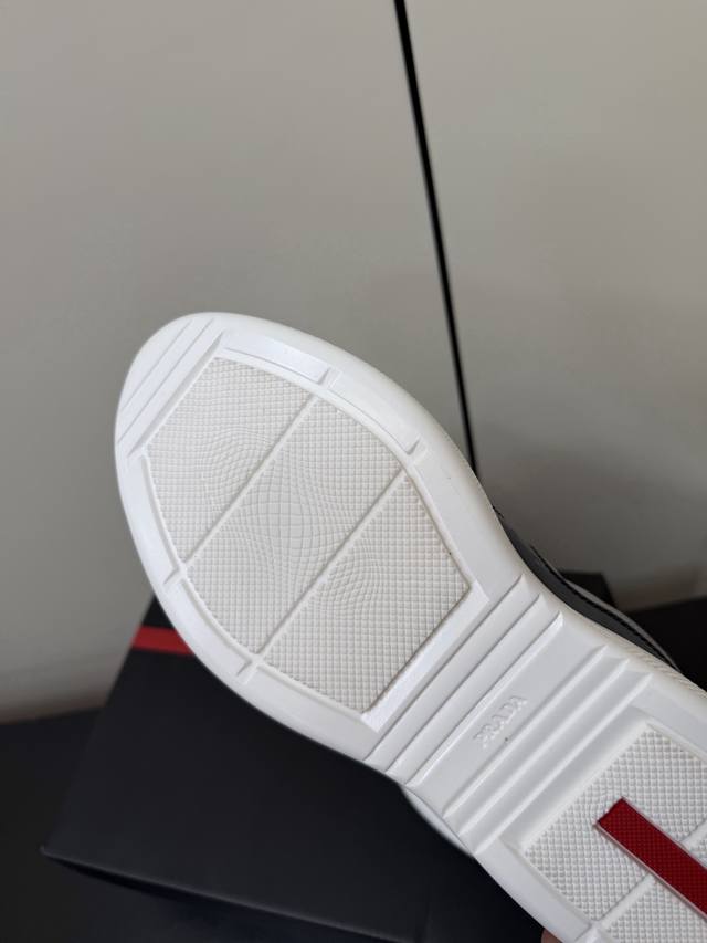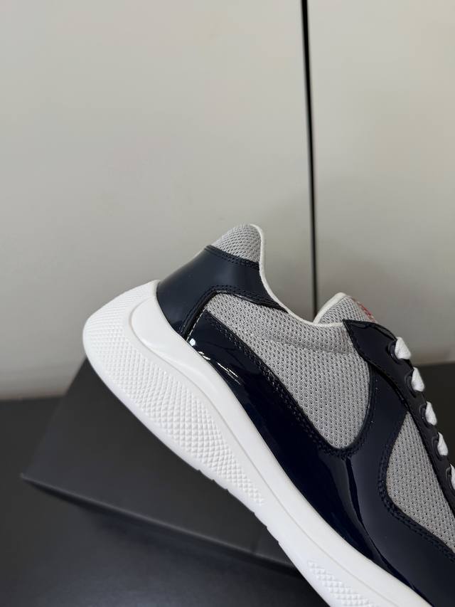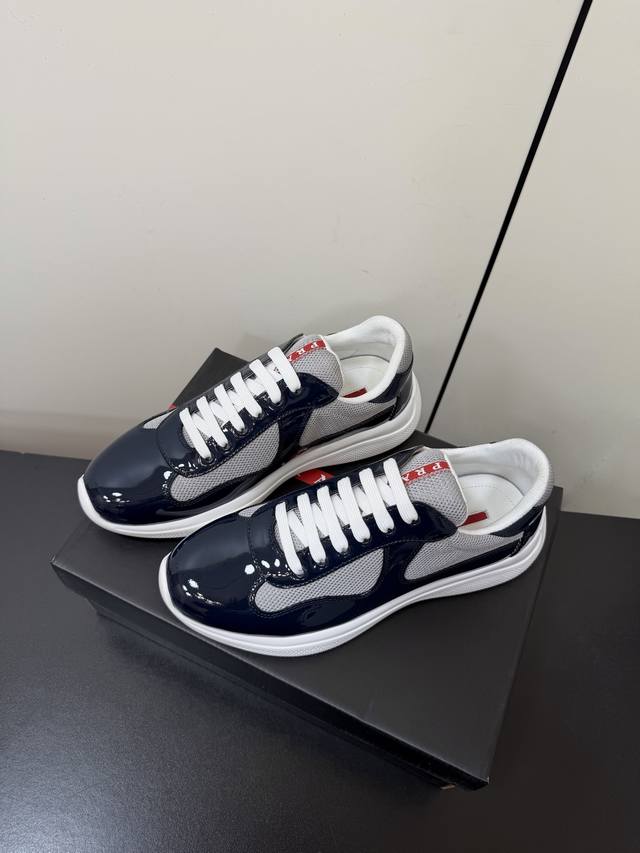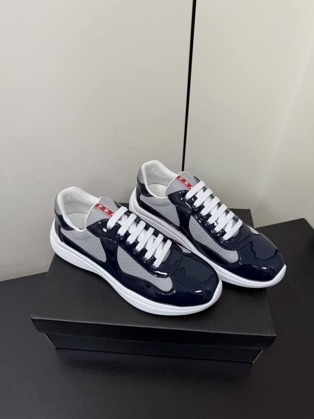 High-quality Prada 25 America's Cup series couple casual sneakers. Original purchase and re-production. These patent leather sneakers feature Bike fabric inlays, inspired by classic aesthetics. The tongue and sole are adorned with the distinctive Prada Linea Rossa logo, further enhancing the style. Comes with exquisite boutique packaging. Material: Imported top-grain cow patent leather, original technical fabric. Lining: Original imported breathable mesh. Outsole: Original molded anti-slip TPU material. Size: 35-45 (Women's size 41.42 custom-made, Men's size 46 custom-made).
