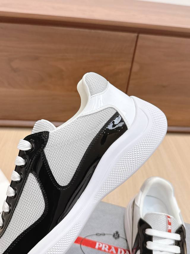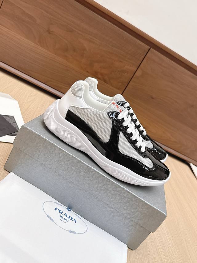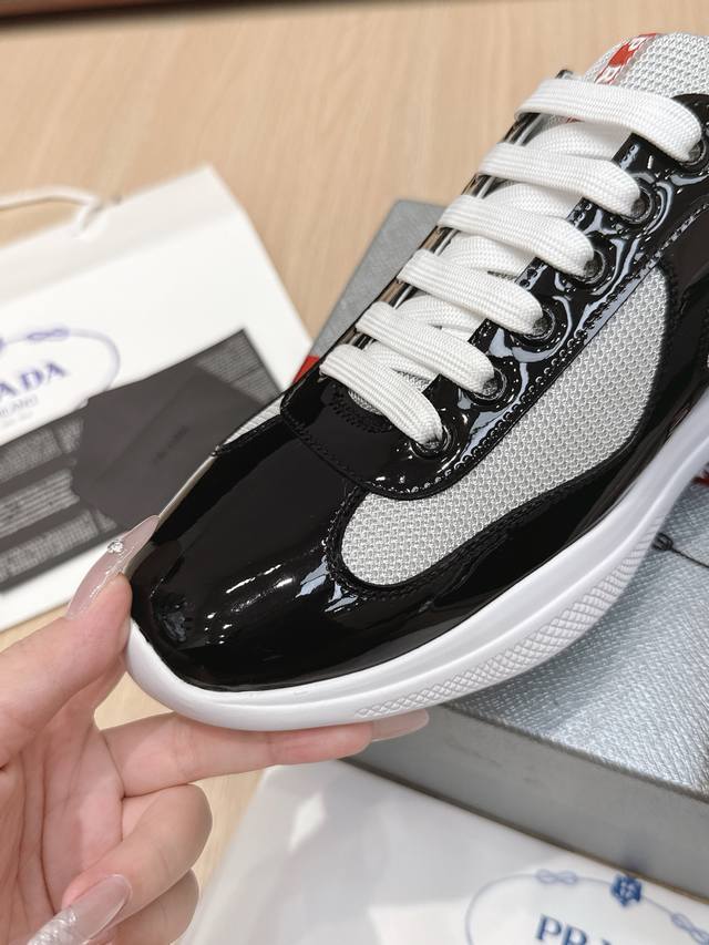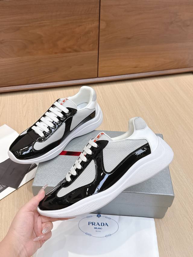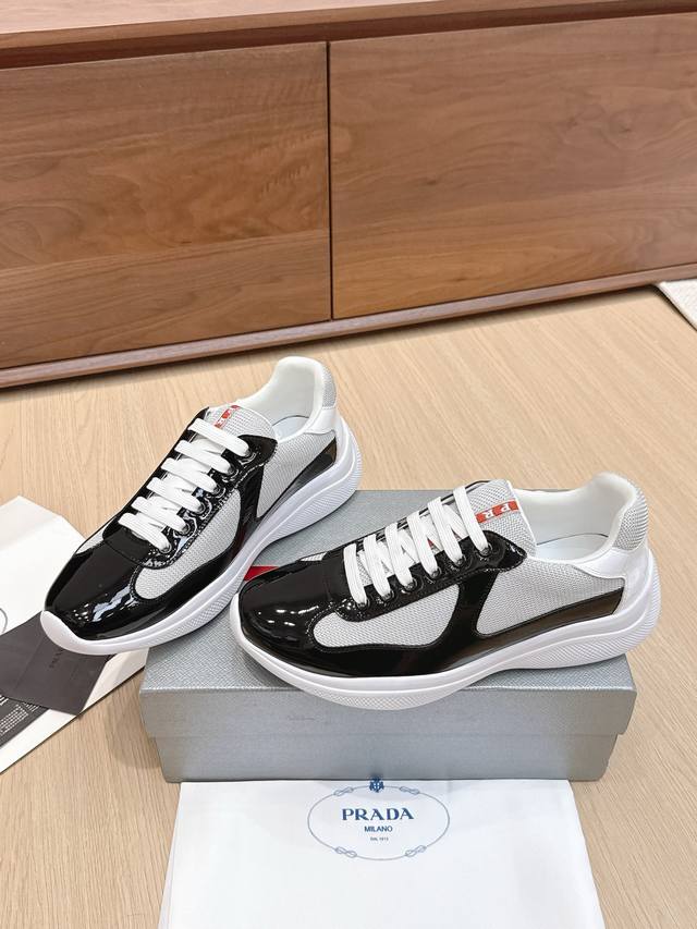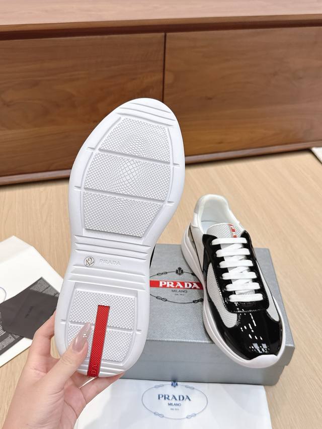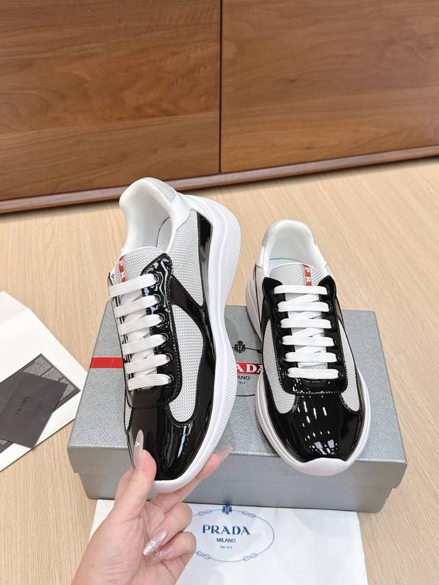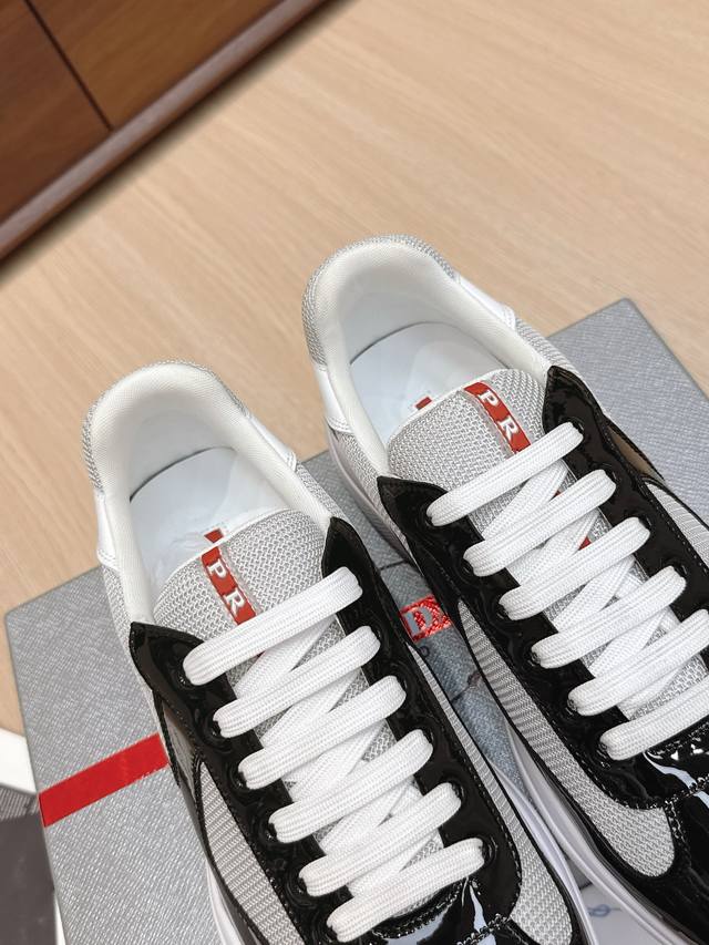 High-quality Prada America's Cup series patent leather mesh casual sneakers. Original purchase and custom manufacturing. These patent leather sneakers feature Bike fabric inlays, inspired by classic aesthetics. The tongue and sole are adorned with the distinctive Prada Linea Rossa logo, further enhancing the style. Comes with exquisite boutique packaging. Material: Original custom imported top-grain cowhide. Lining: Original imported breathable mesh. Outsole: Original molded anti-slip TPU material. Sole thickness: 4cm. Size: Men's 38-46 (38, 45, 46 custom-made ).