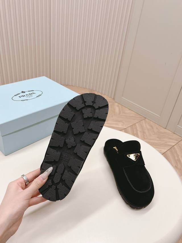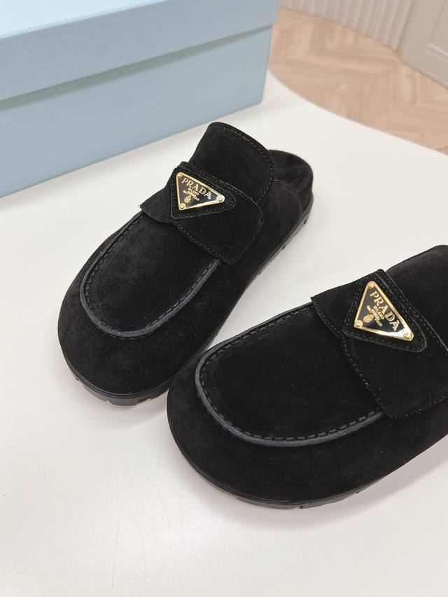 Latest Collection! Prada Spring/Summer New Sandals - Triangle Buckle Bread Toe Half-Slippers. The latest runway collection features a classic upgrade, combining comfort and style. Every color looks great, and the design caters to different style needs. Upper: Original custom suede. Lining: Original custom sheepskin lining, cowhide insole. Outsole: Original molded non-slip outsole. Sizes: 35-40.