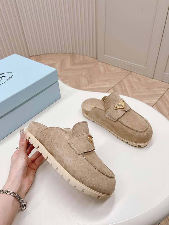 Latest Collection! Prada Spring/Summer New Sandals - Triangle Buckle Bread Toe Half-Slippers. The latest runway collection features a classic upgrade, combining comfort and style. Every color looks great, and the design caters to different style needs. Upper: Original custom suede. Lining: Original custom sheepskin lining, cowhide insole. Outsole: Original molded non-slip outsole. Sizes: 35-40.