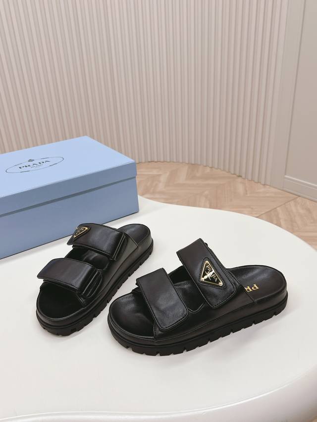 Latest Collection! Prada Spring/Summer New Sandals with Velcro Straps - Latest Runway Collection Classic Upgrade: Comfort and Style Combined. Every color looks great, designed to suit different style needs. Upper: Original Custom Cowhide Leather. Lining: Original Custom Sheepskin Lining, Cowhide Insole. Outsole: Original Mold Anti-Slip Outsole. Sizes: 35-40.