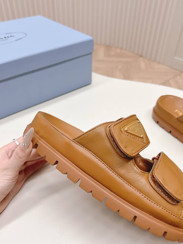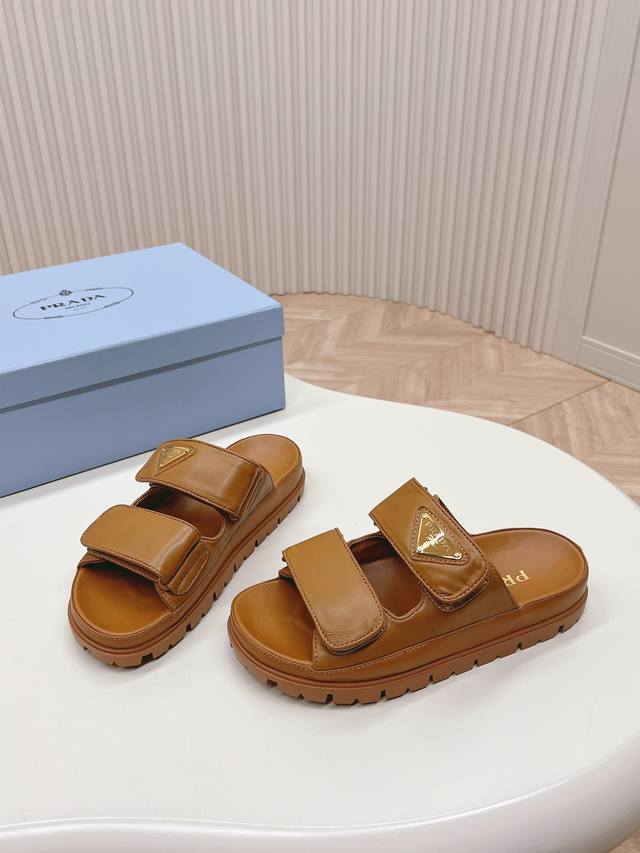 Latest Collection! Prada Spring/Summer New Sandals with Velcro Straps - Latest Runway Collection Classic Upgrade: Comfort and Style Combined. Every color looks great, designed to suit different style needs. Upper: Original Custom Cowhide Leather. Lining: Original Custom Sheepskin Lining, Cowhide Insole. Outsole: Original Mold Anti-Slip Outsole. Sizes: 35-40.
