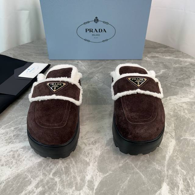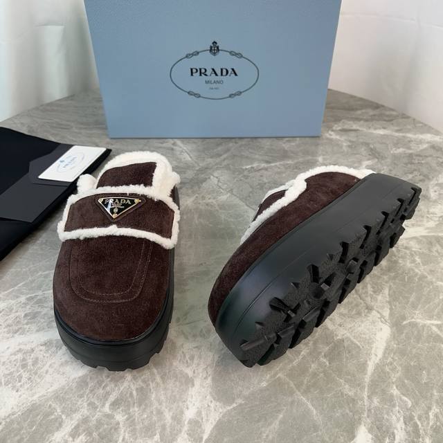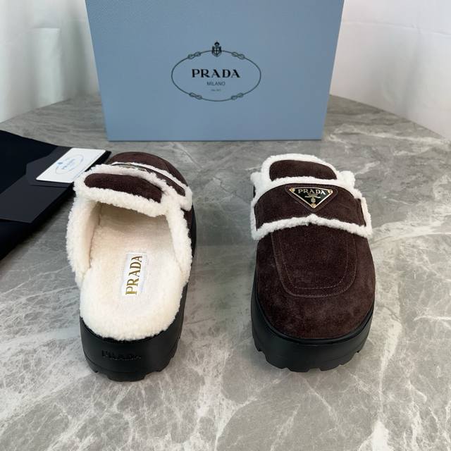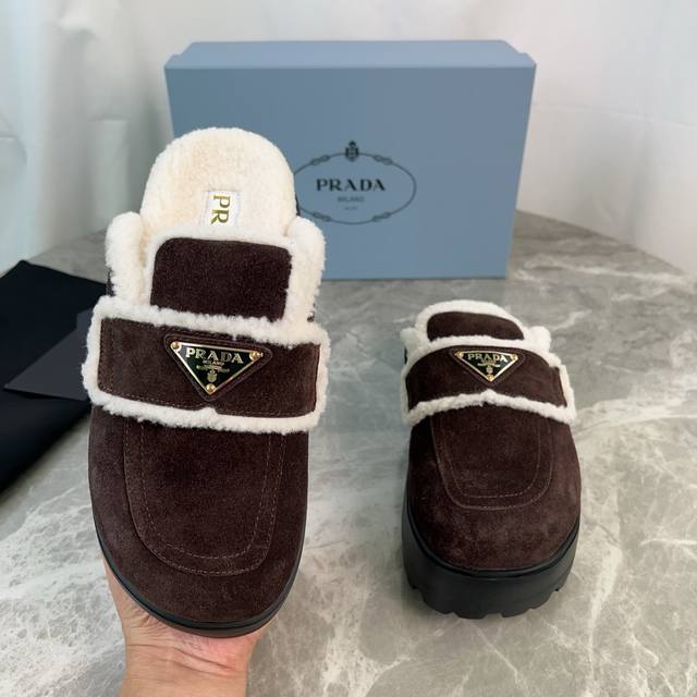 Latest P brand fleece slippers. Outer: Imported high-gloss cow suede. Lining: Imported lamb's wool. Mat: Lambswool. Sole: Ultra-light rubber foam sole, 6cm thick. Features the iconic triangle logo and original packaging. Size: 35-41. Custom sizes 40 and 41 are available.