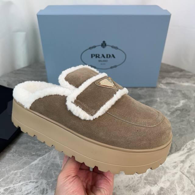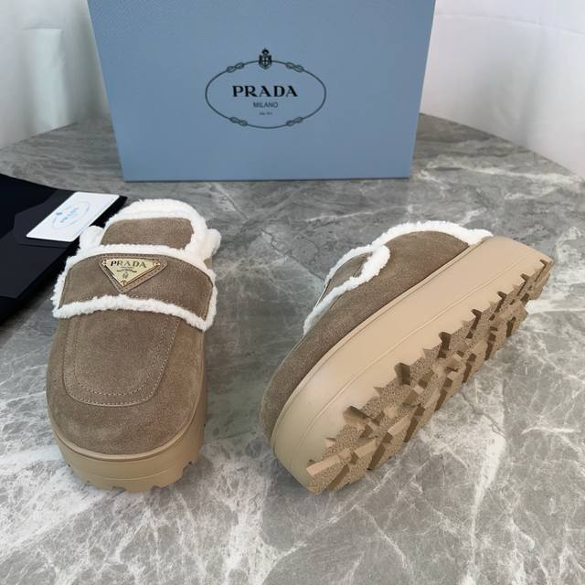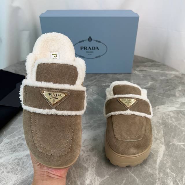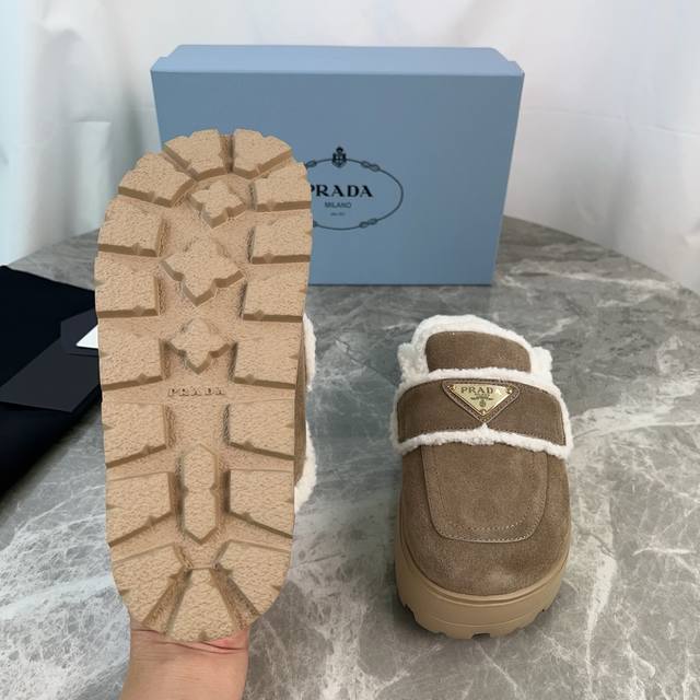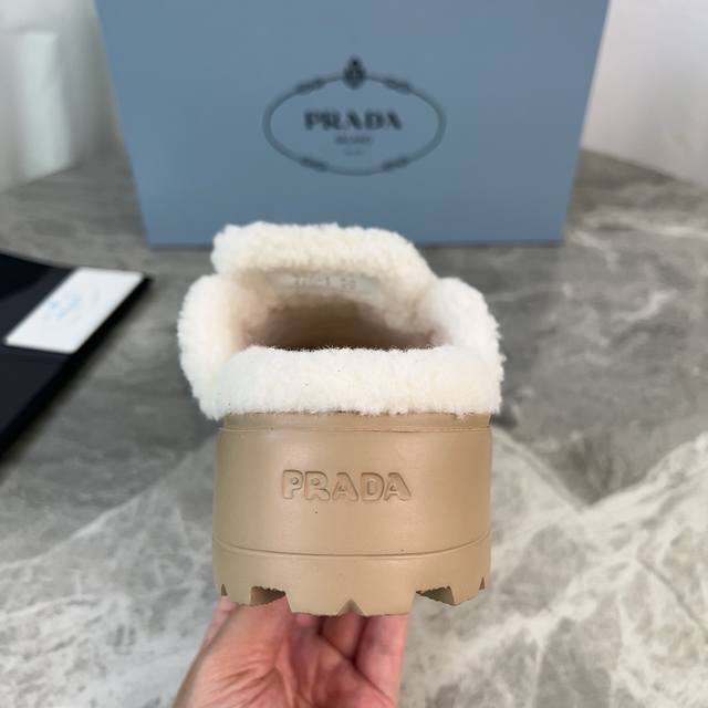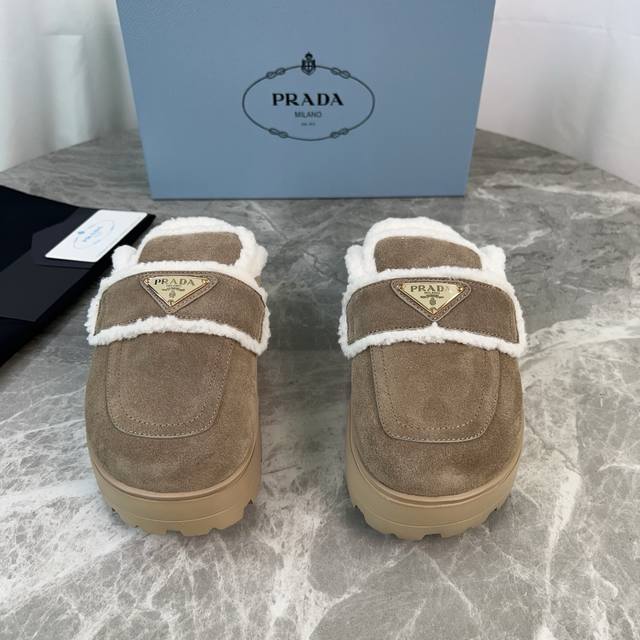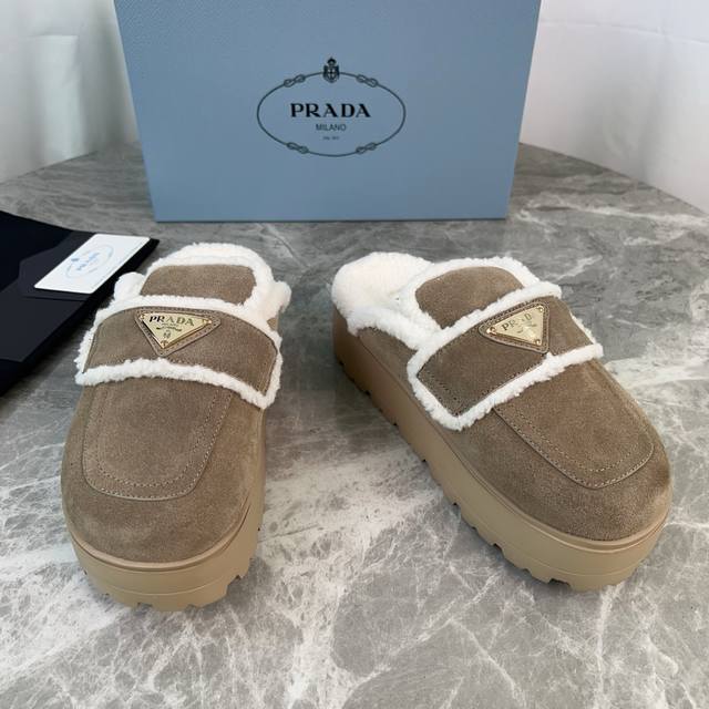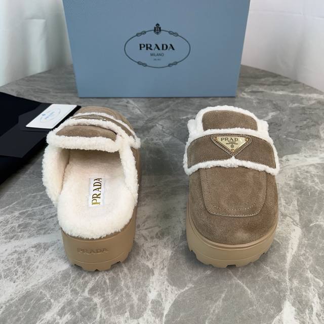 Latest P brand fleece slippers. Outer: Imported high-gloss cow suede. Lining: Imported lamb's wool. Mat: Lambswool. Sole: Ultra-light rubber foam sole, 6cm thick. Features the iconic triangle logo and original packaging. Size: 35-41. Custom sizes 40 and 41 are available.